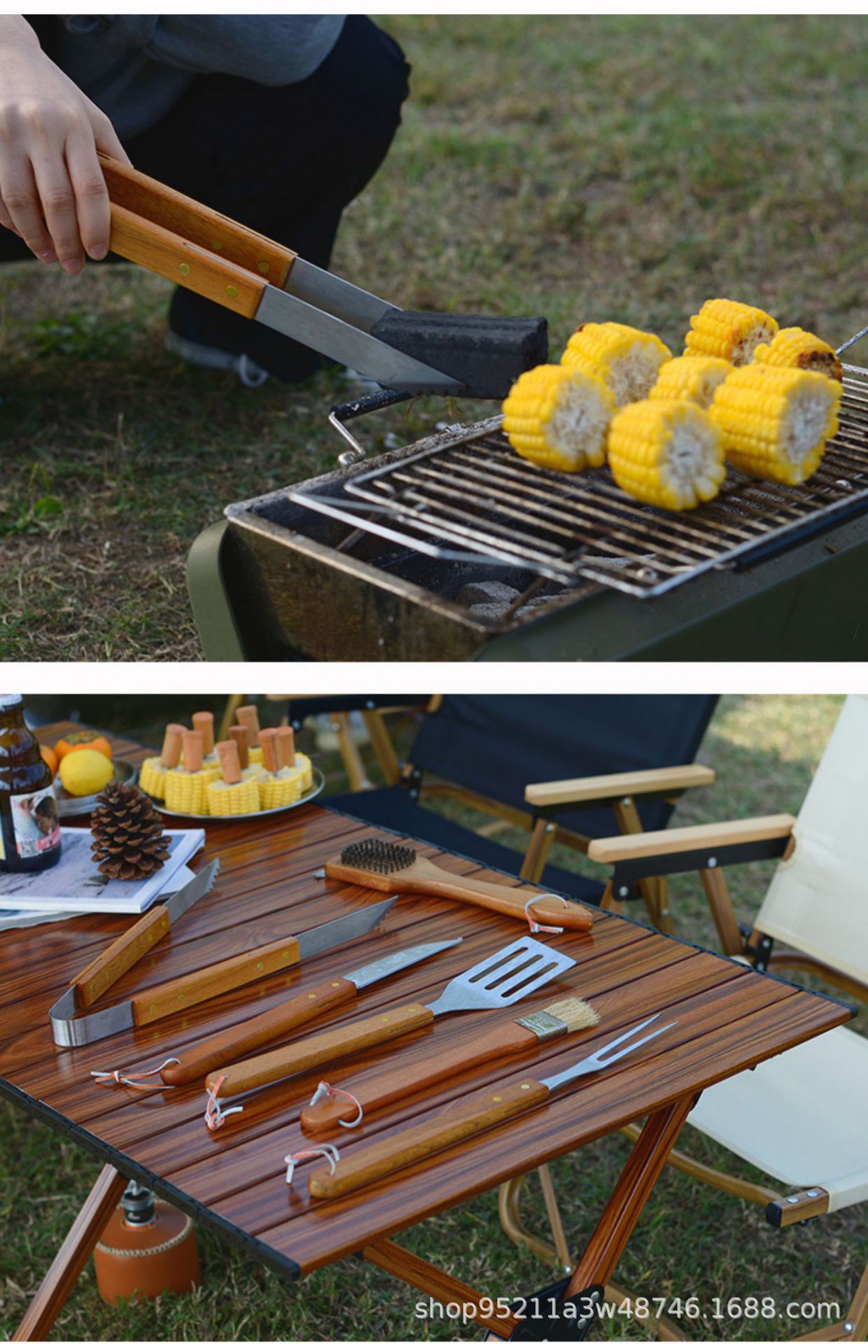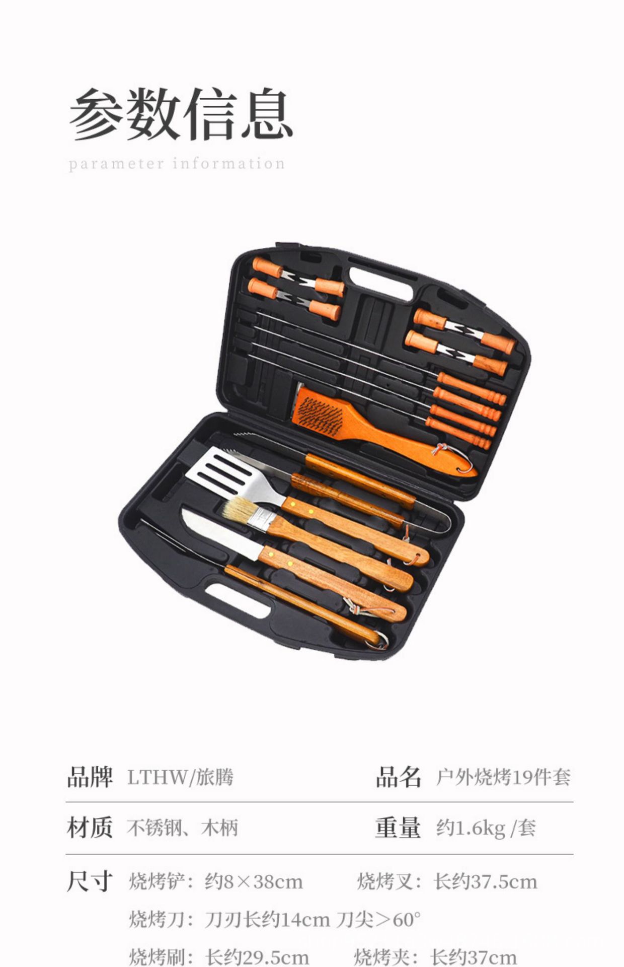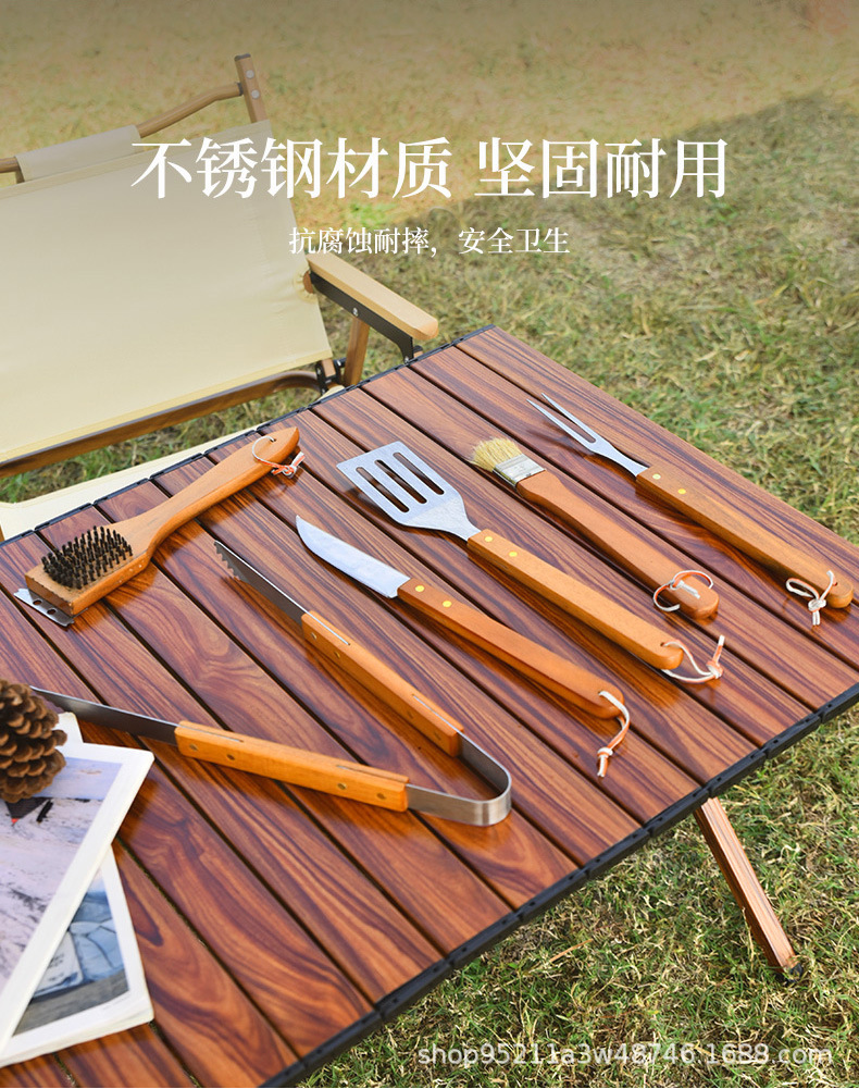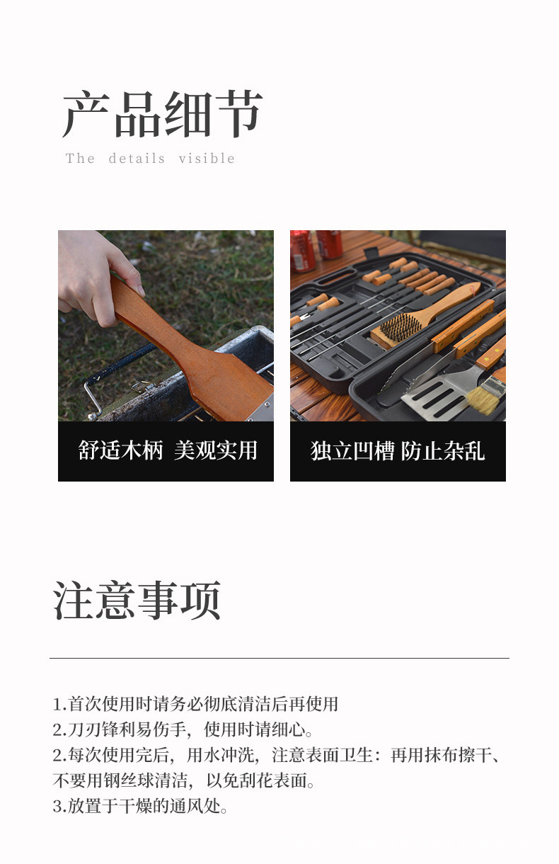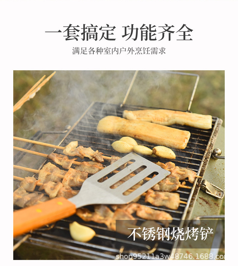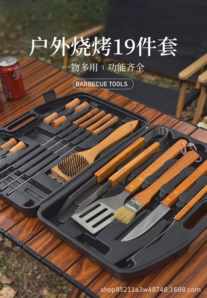 Directo de fábrica de madera mango parrilla traje de acero inoxidable parrilla al aire libre barbacoa plástico caja de plástico herramientas de barbacoa de 19 piezas