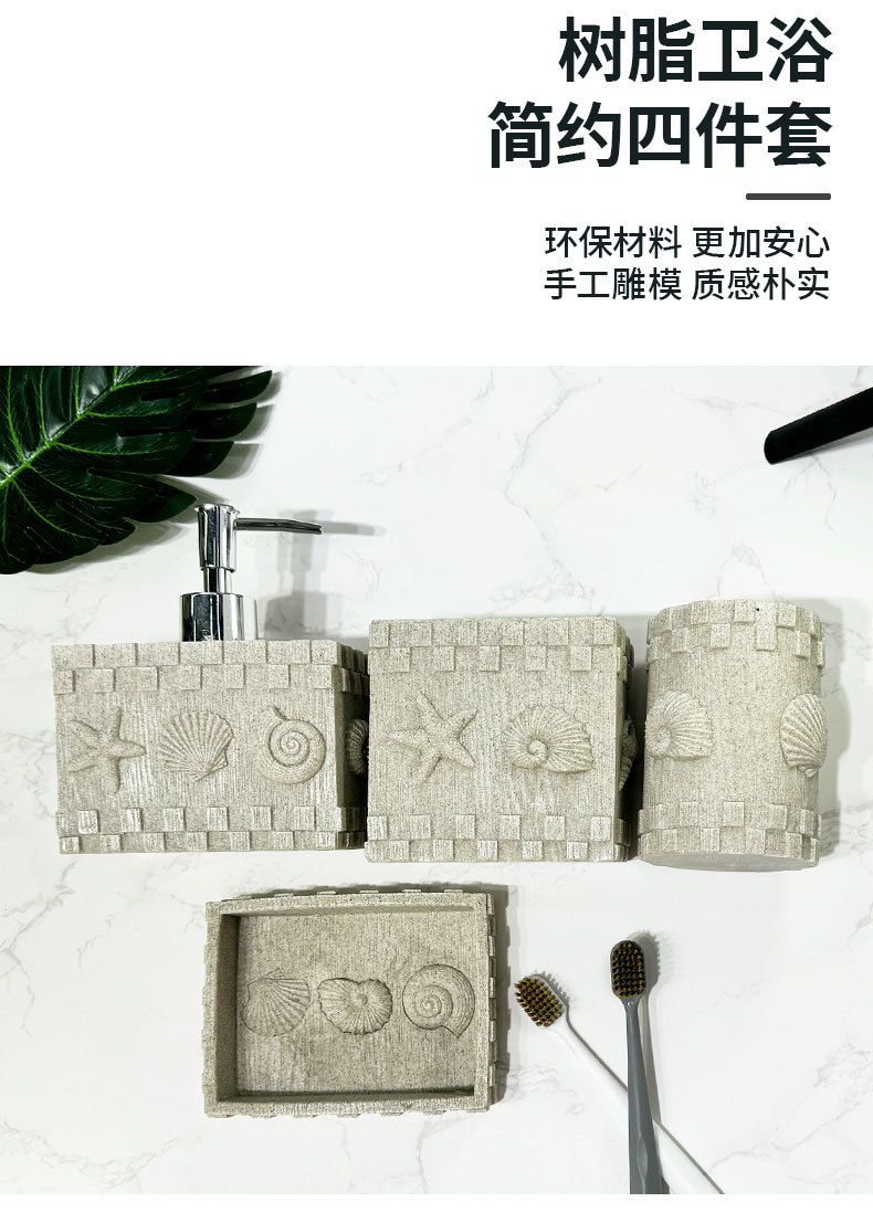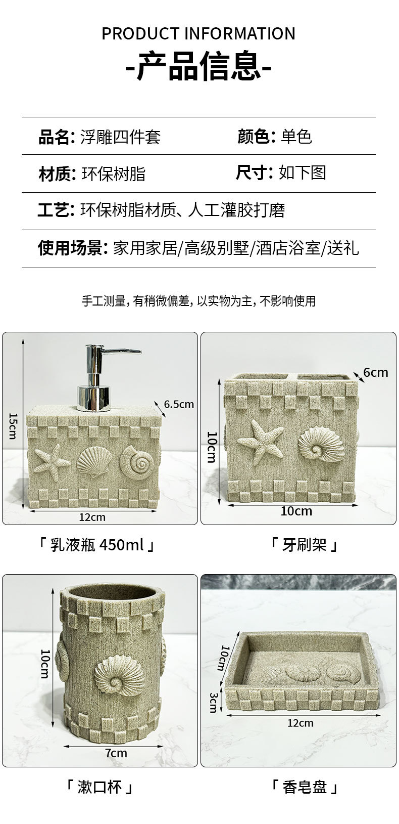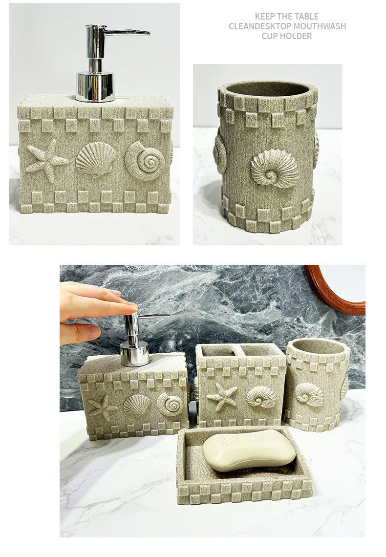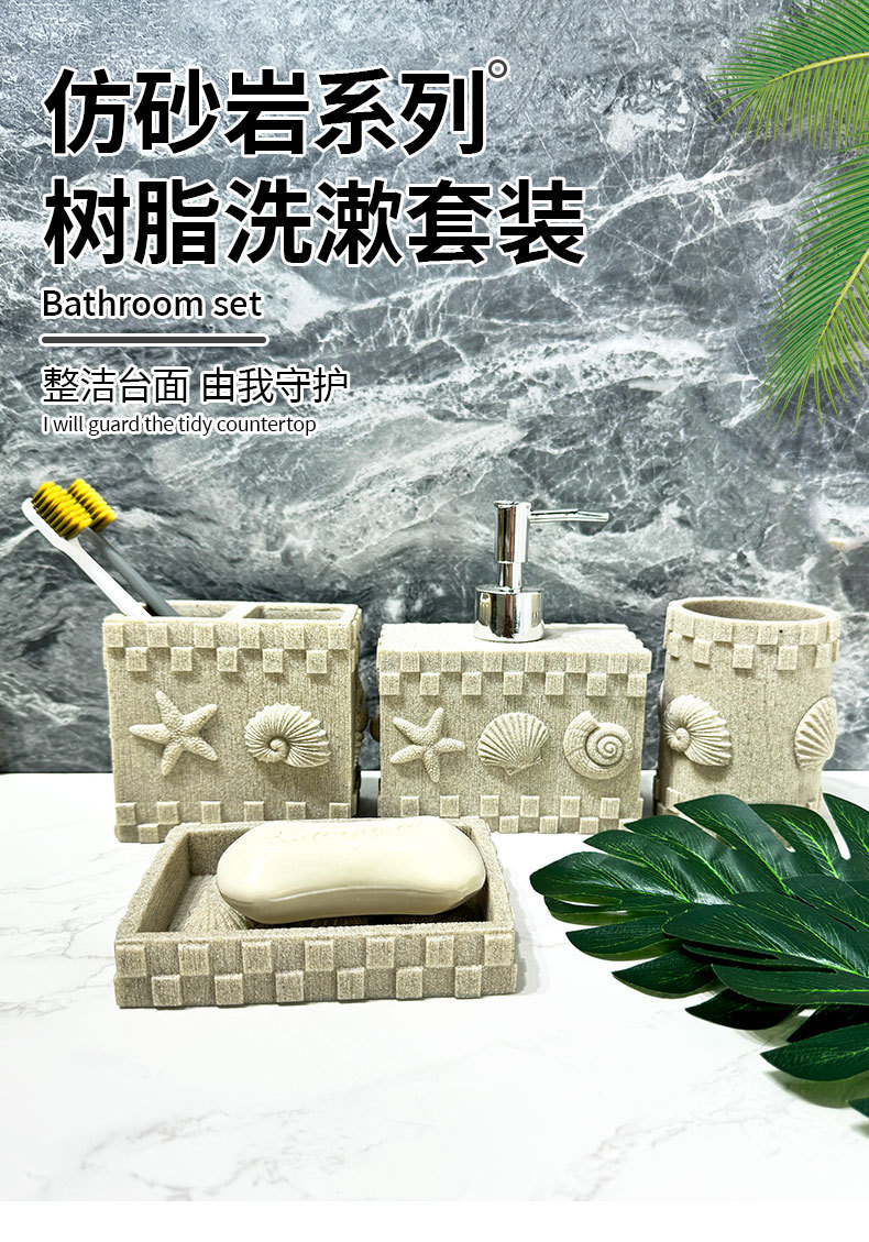 | Especificaciones | Juego de cuatro piezas de arena y grava, botella de loción, estante de cepillo de dientes, taza de enjuague bucal, plato de jabón |