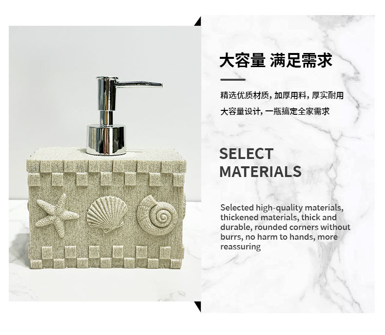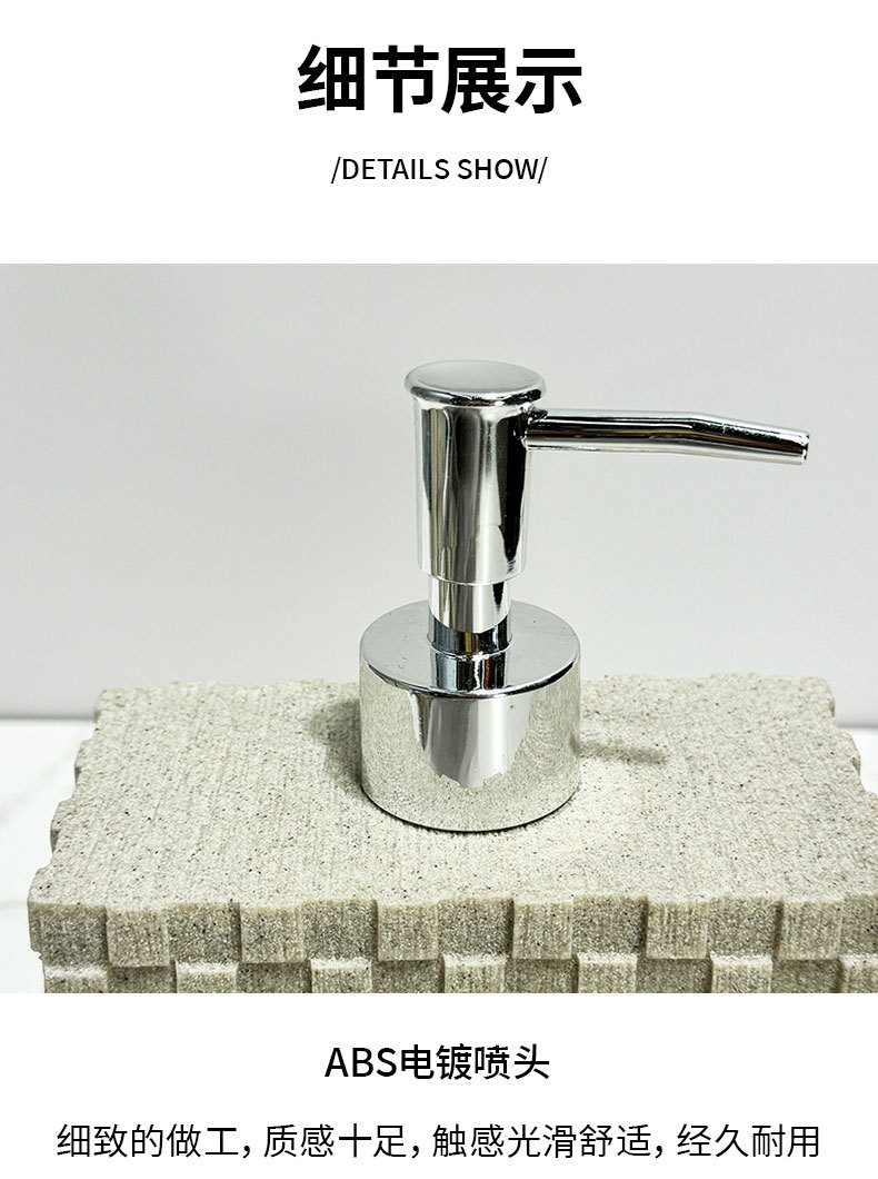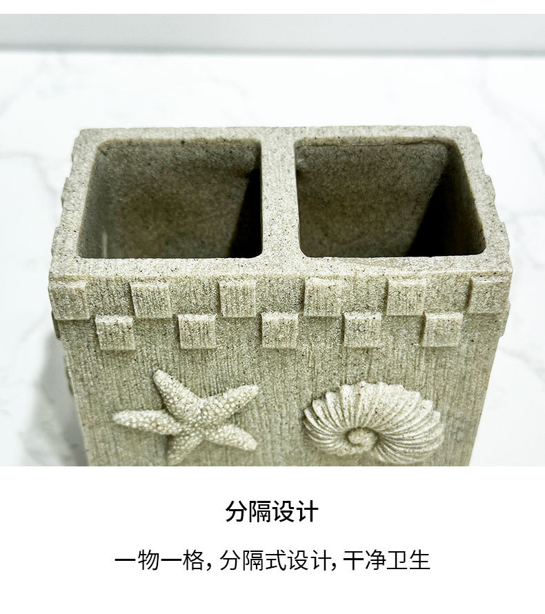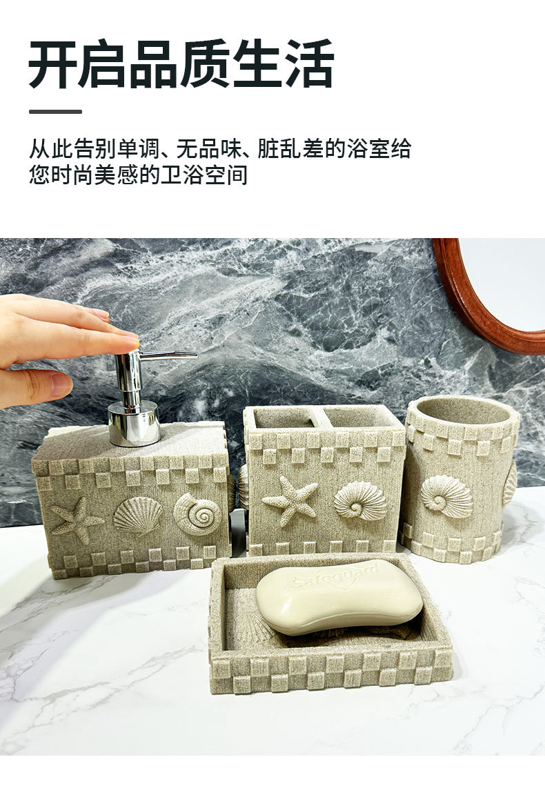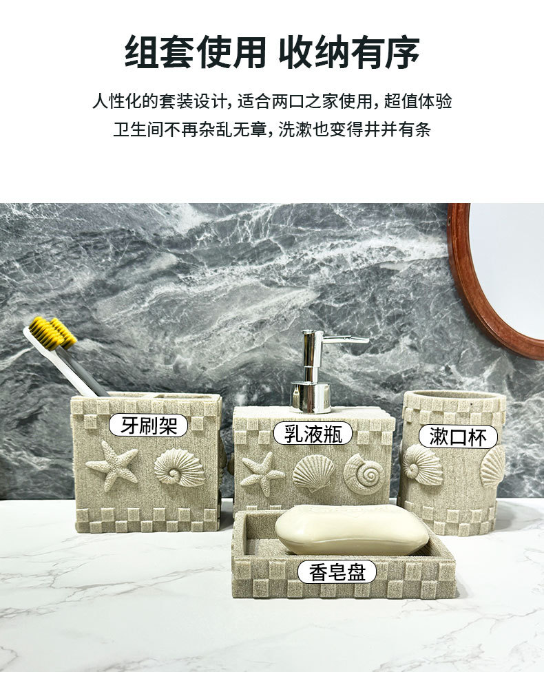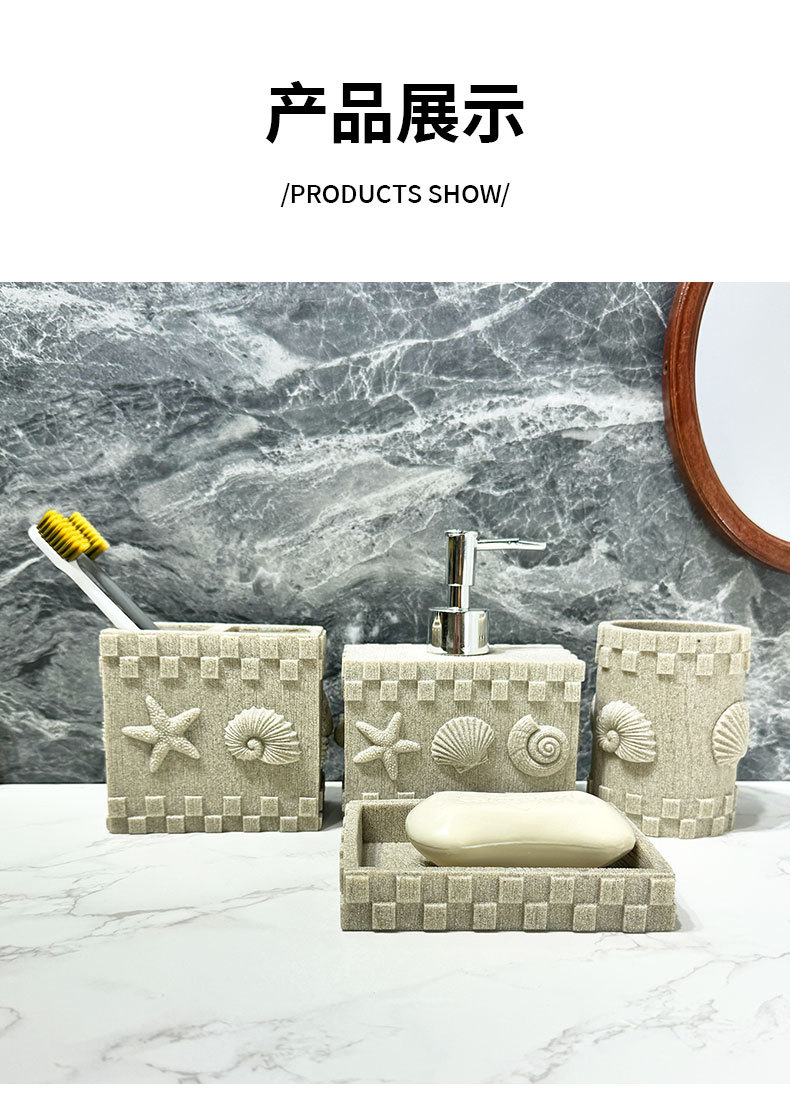 | Especificaciones | Juego de cuatro piezas de arena y grava, botella de loción, estante de cepillo de dientes, taza de enjuague bucal, plato de jabón |