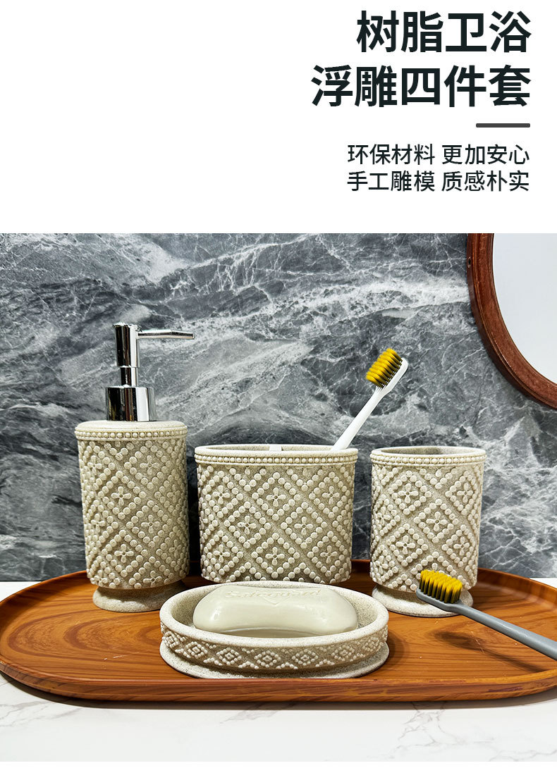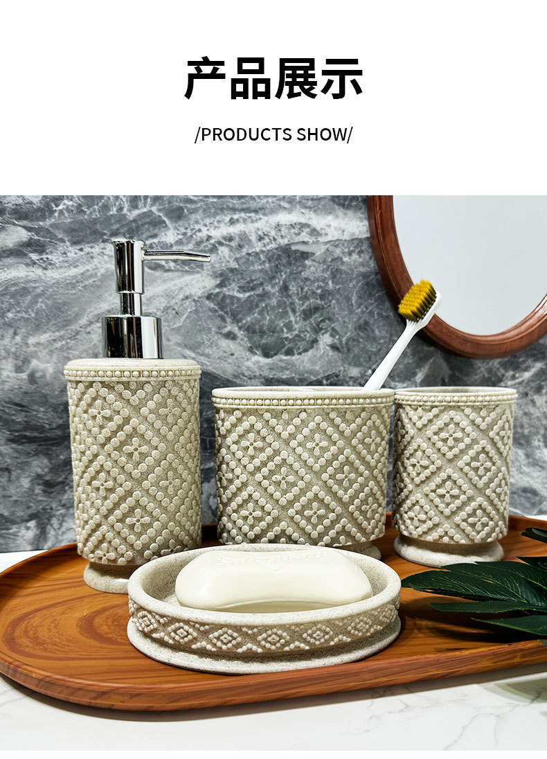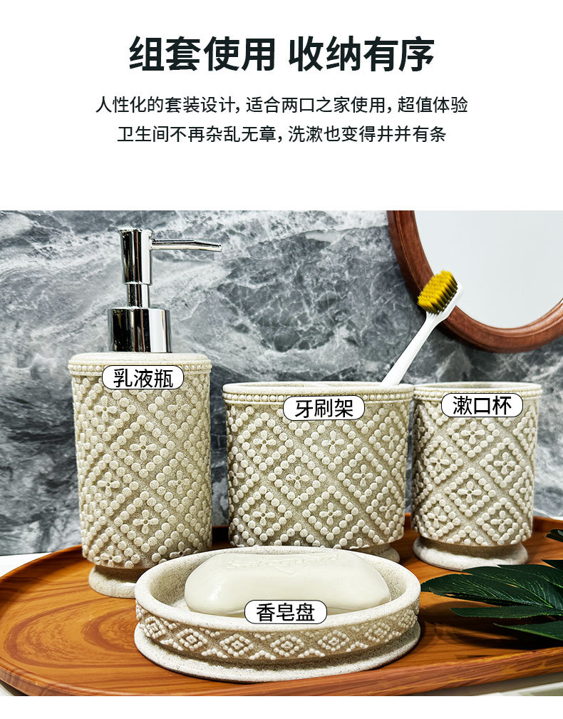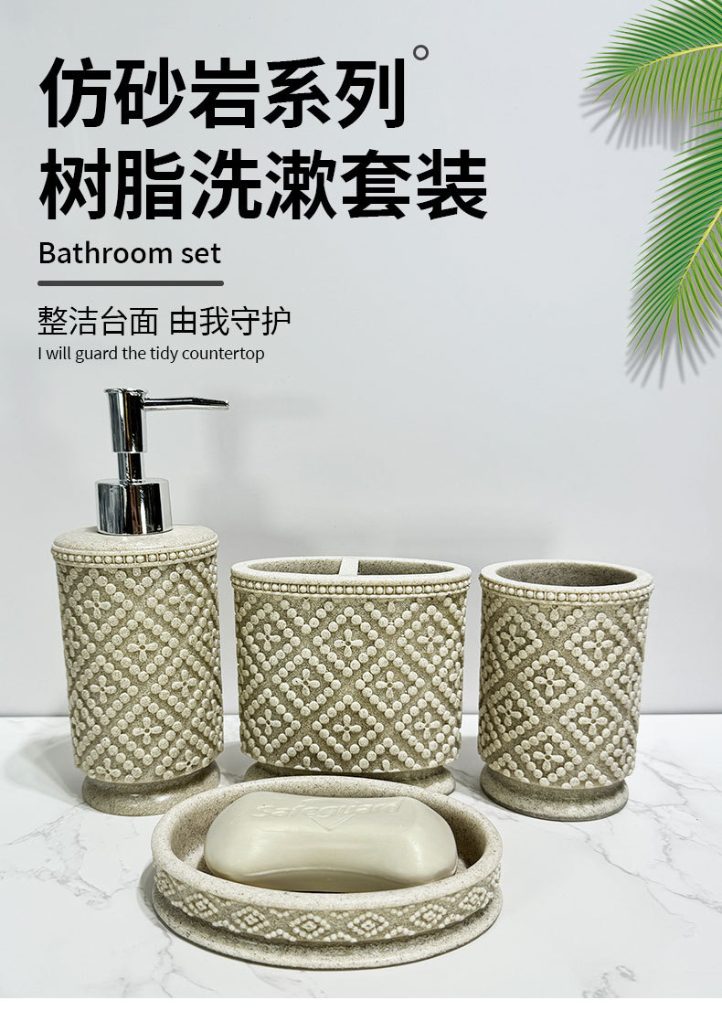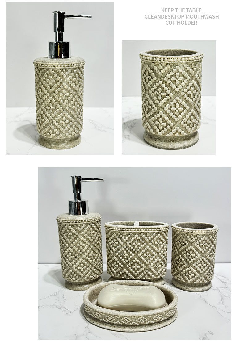 | Especificaciones | Juego de cuatro piezas de arena y grava, botella de desinfectante para manos, estante de cepillo de dientes, taza de boca, plato de jabón |