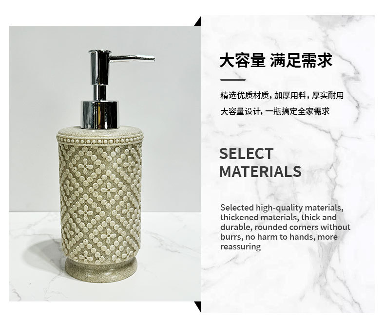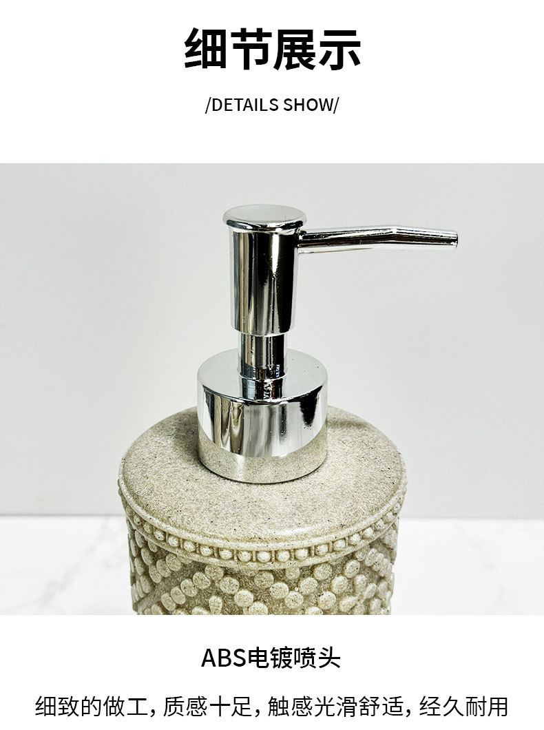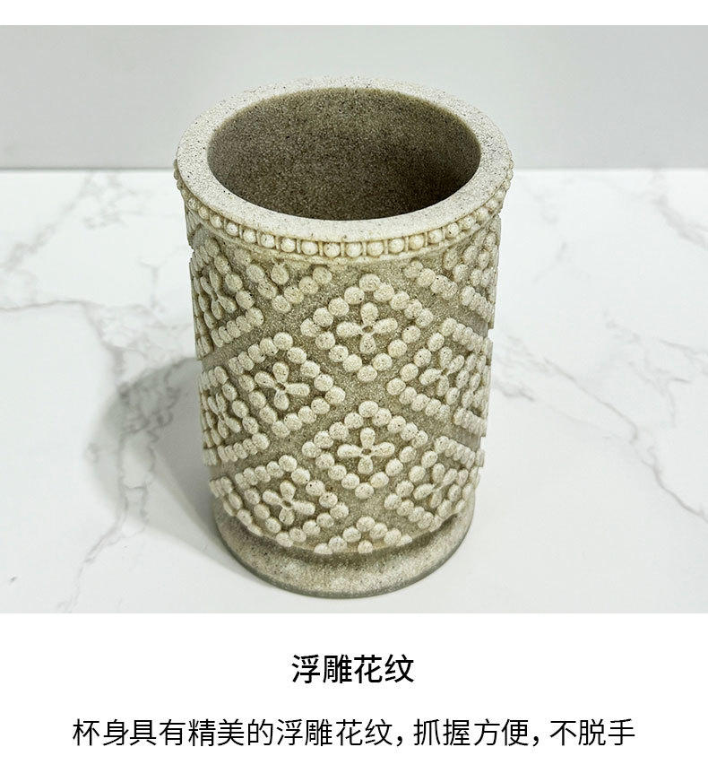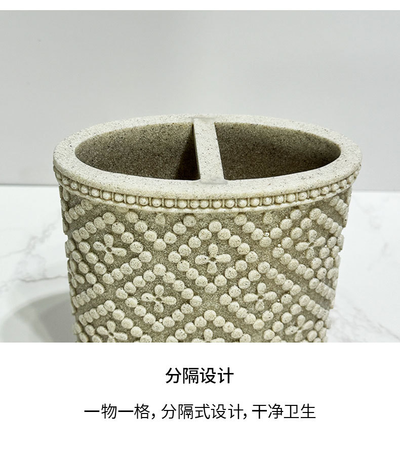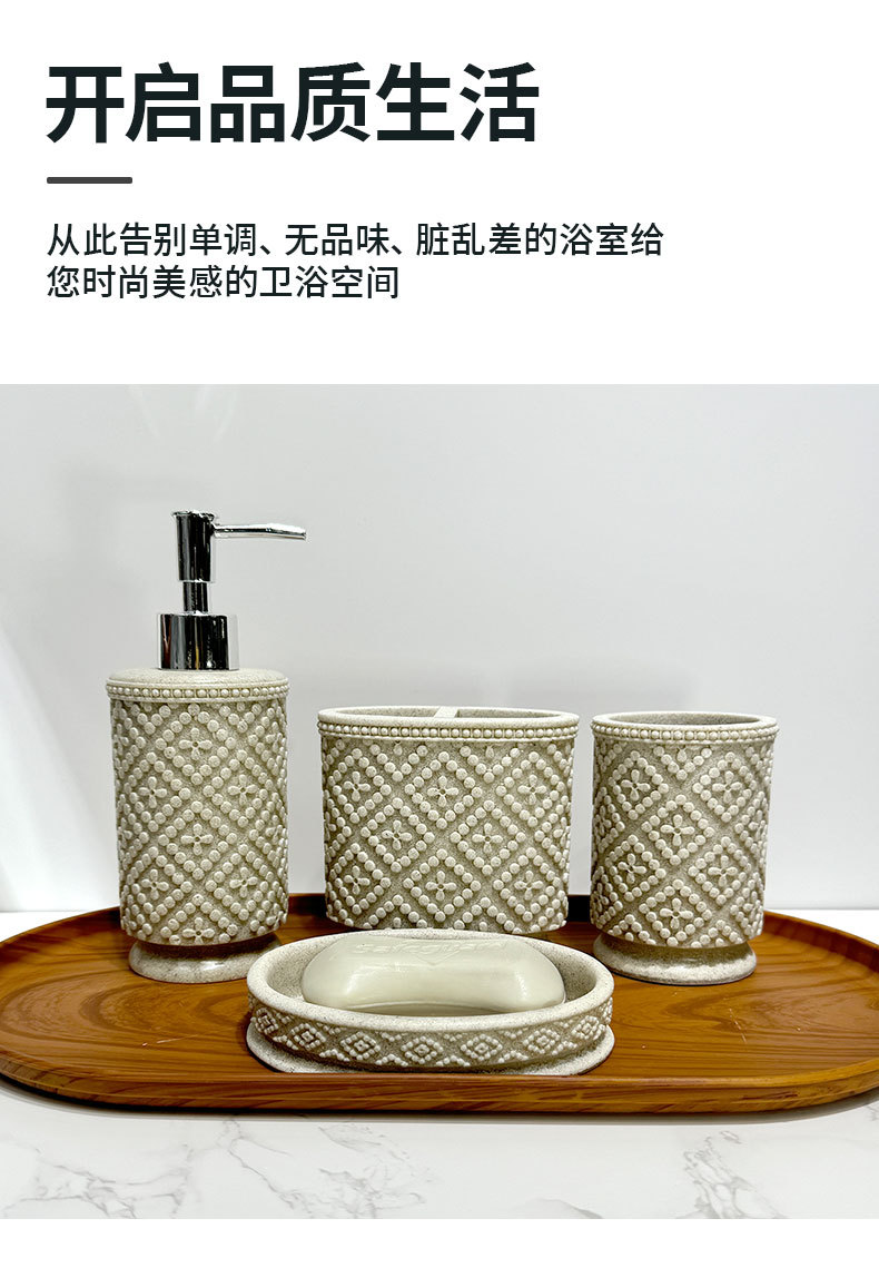 | Especificaciones | Juego de cuatro piezas de arena y grava, botella de desinfectante para manos, estante de cepillo de dientes, taza de boca, plato de jabón |