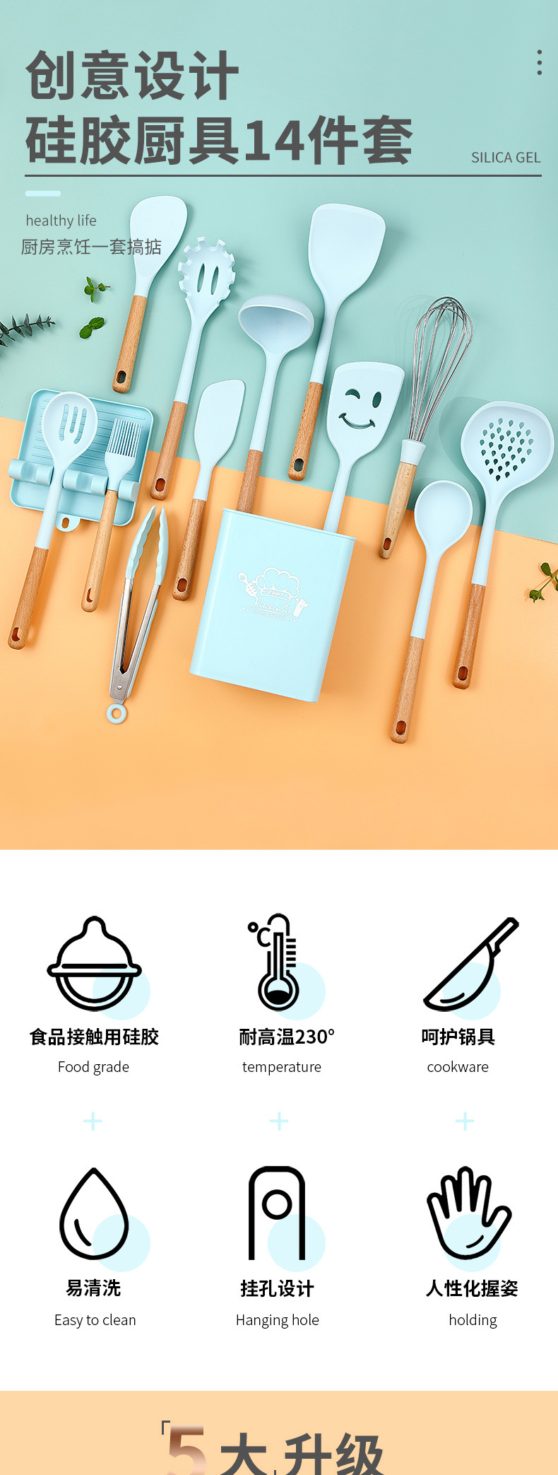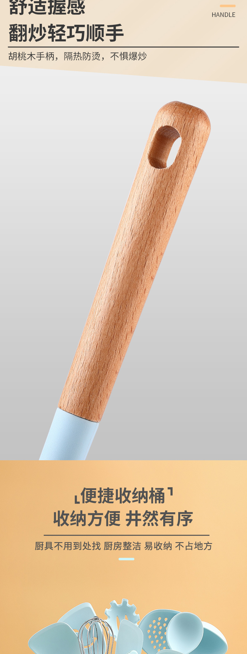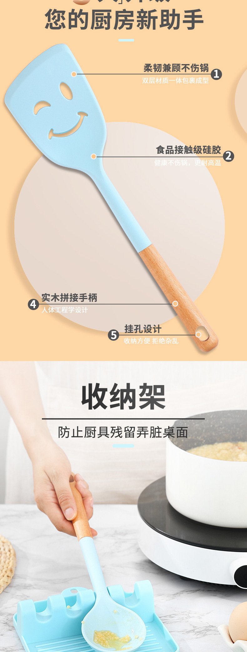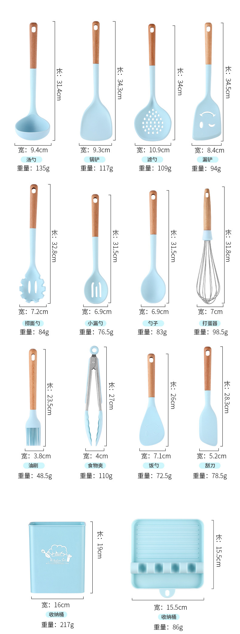 | Tamaño | Palas de olla, palas sonrientes, setos, cucharas de sopa, más densas, fugas, agarres en polvo, cepillos de aceite, batidoras, espátulas, cucharas de arroz, clips de comida, cubos de almacenamiento, estantes de almacenamiento, conjuntos, trajes negros |