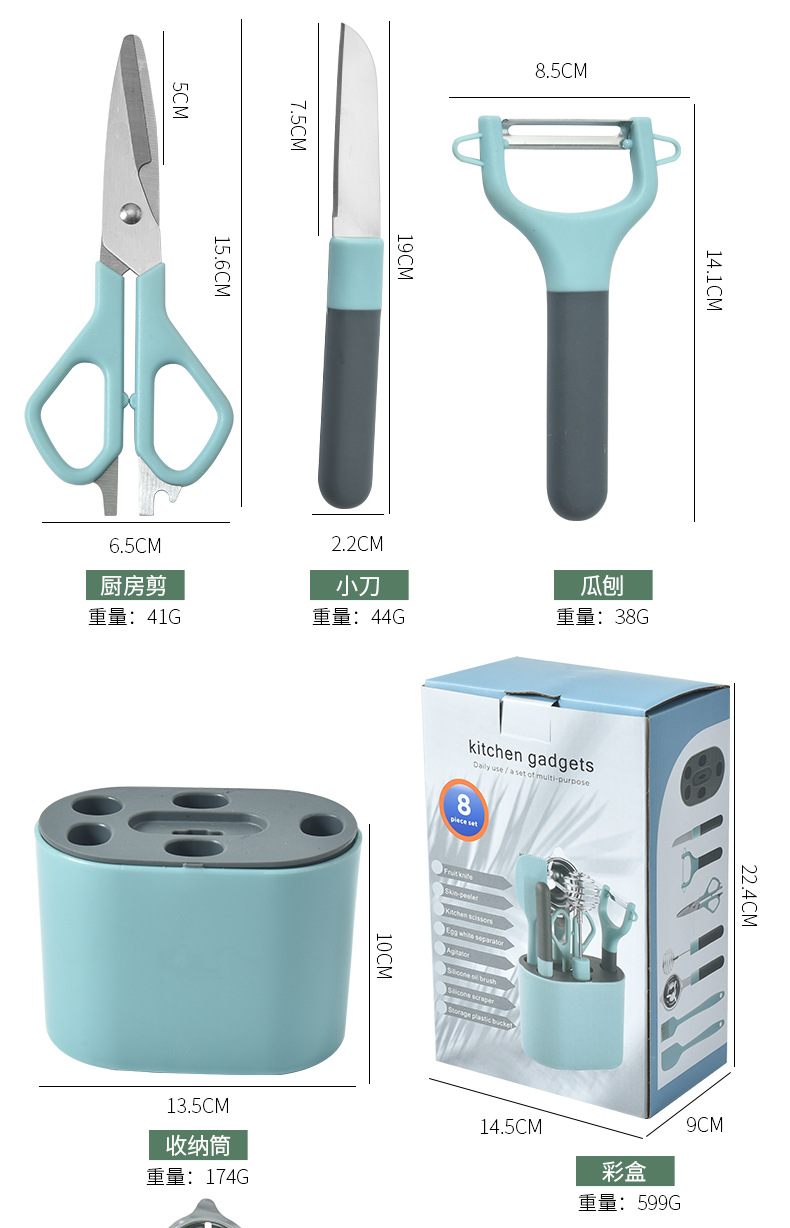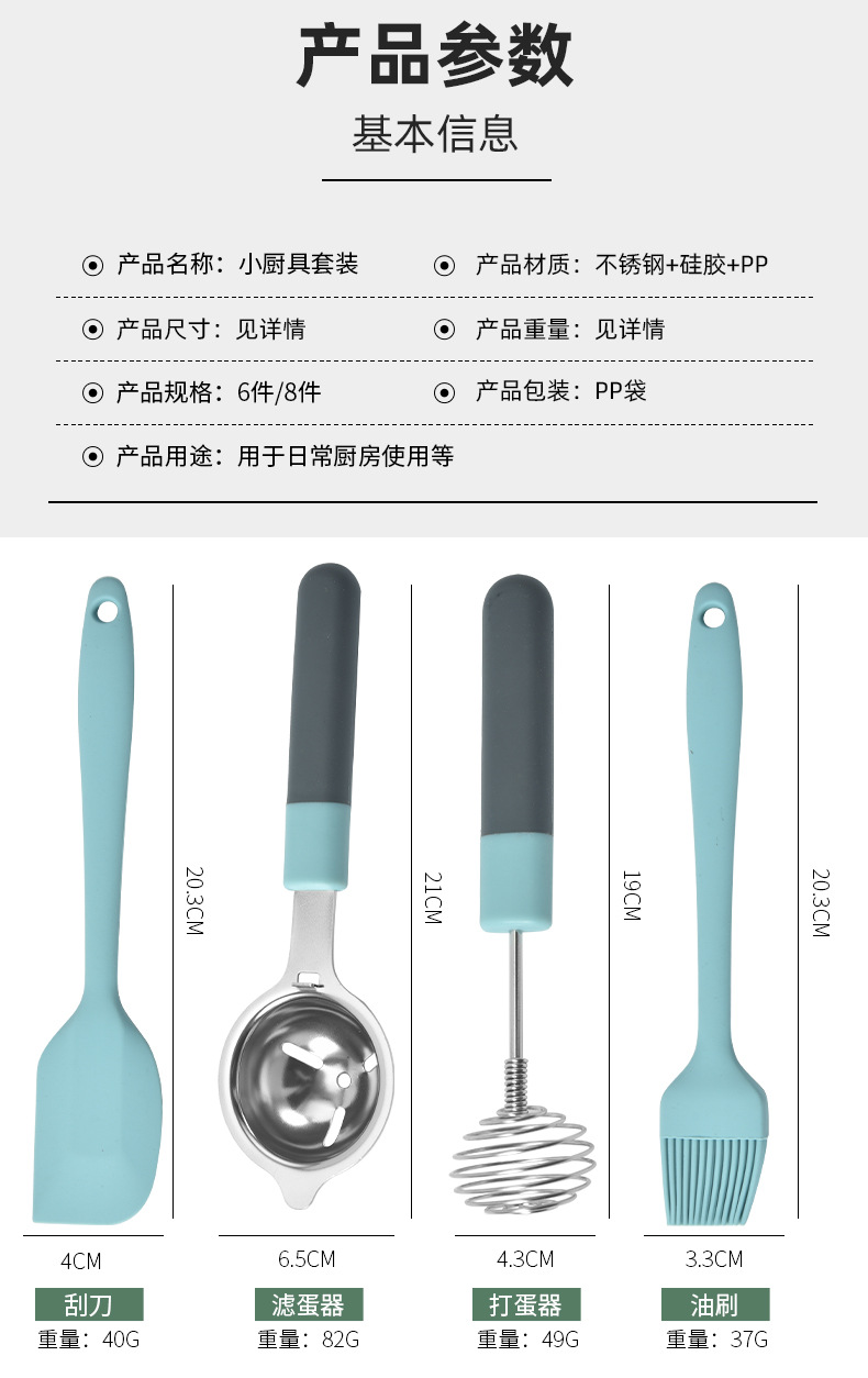 | Especificaciones | Juego de utensilios de cocina pequeños juego de cinco piezas - juego de cajas de color, juego de utensilios de cocina pequeños juego de seis piezas - juego de cajas de color, juego de utensilios de cocina pequeños juego de ocho piezas - juego de cajas de color (color aleatorio) |