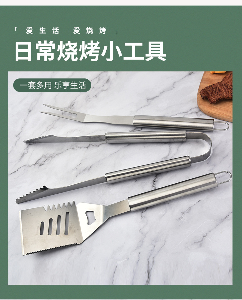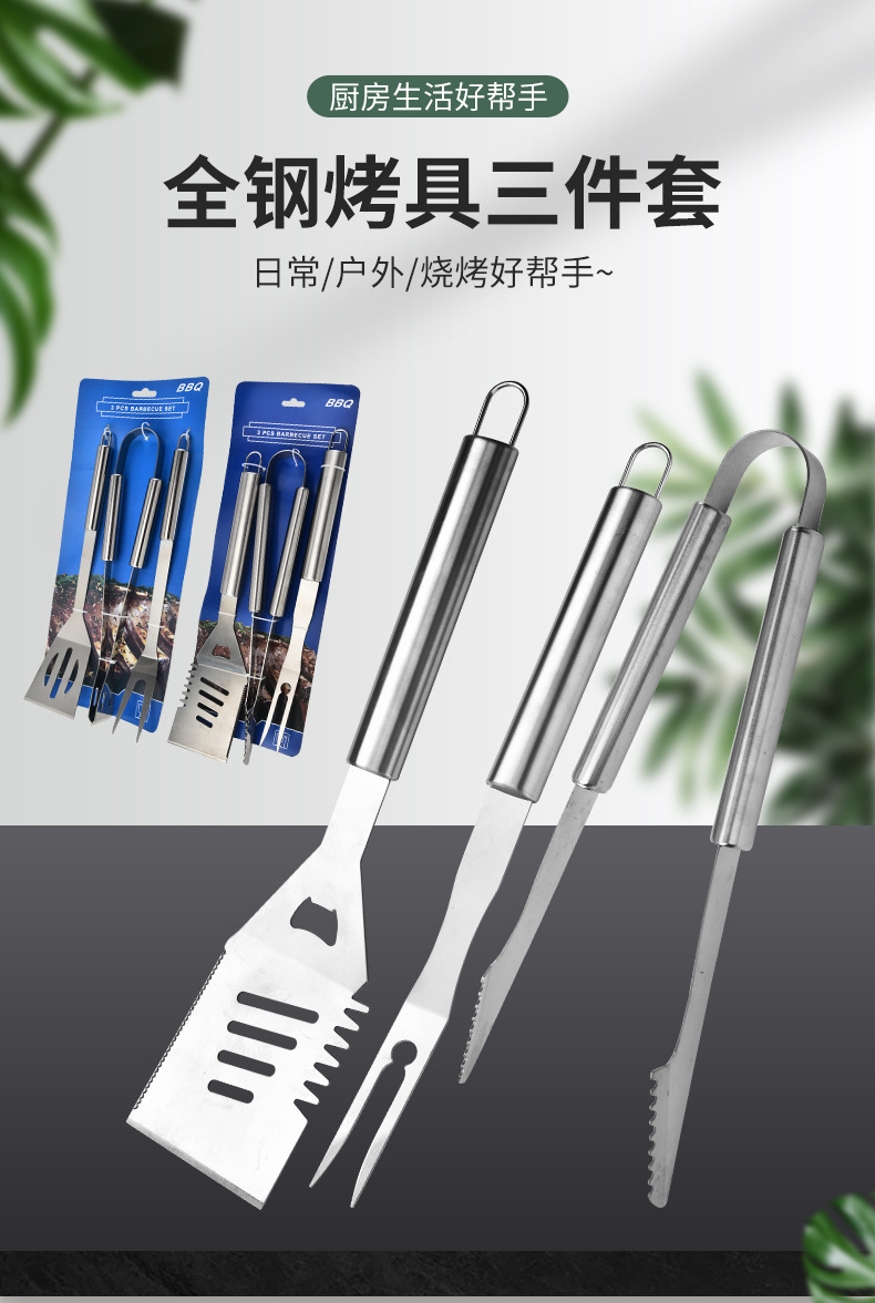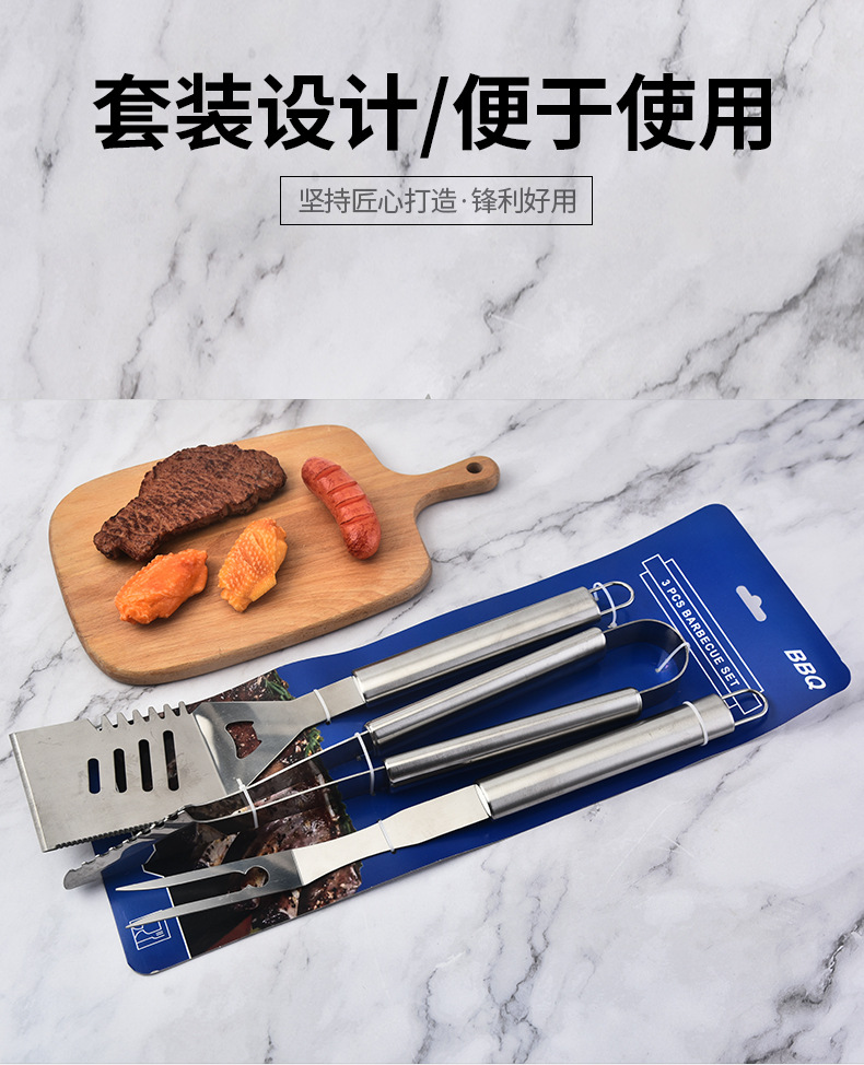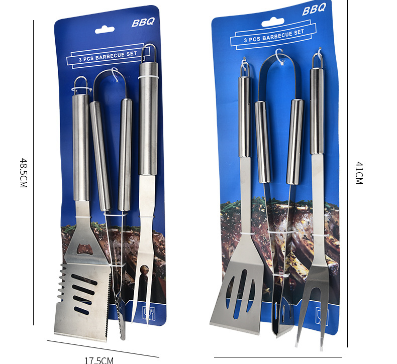 Fábrica directa de parrilla de acero inoxidable pala y horquilla combinación de abrazadera de tres piezas BBQ camping al aire libre parrilla de comida familiar