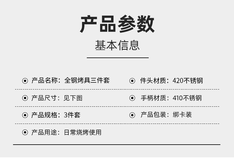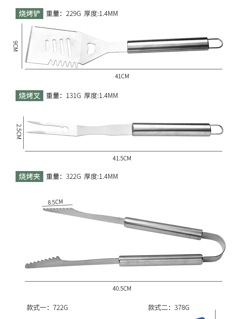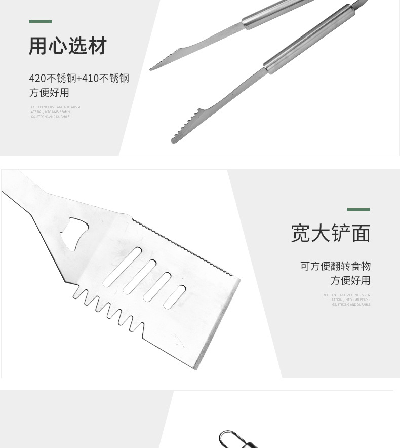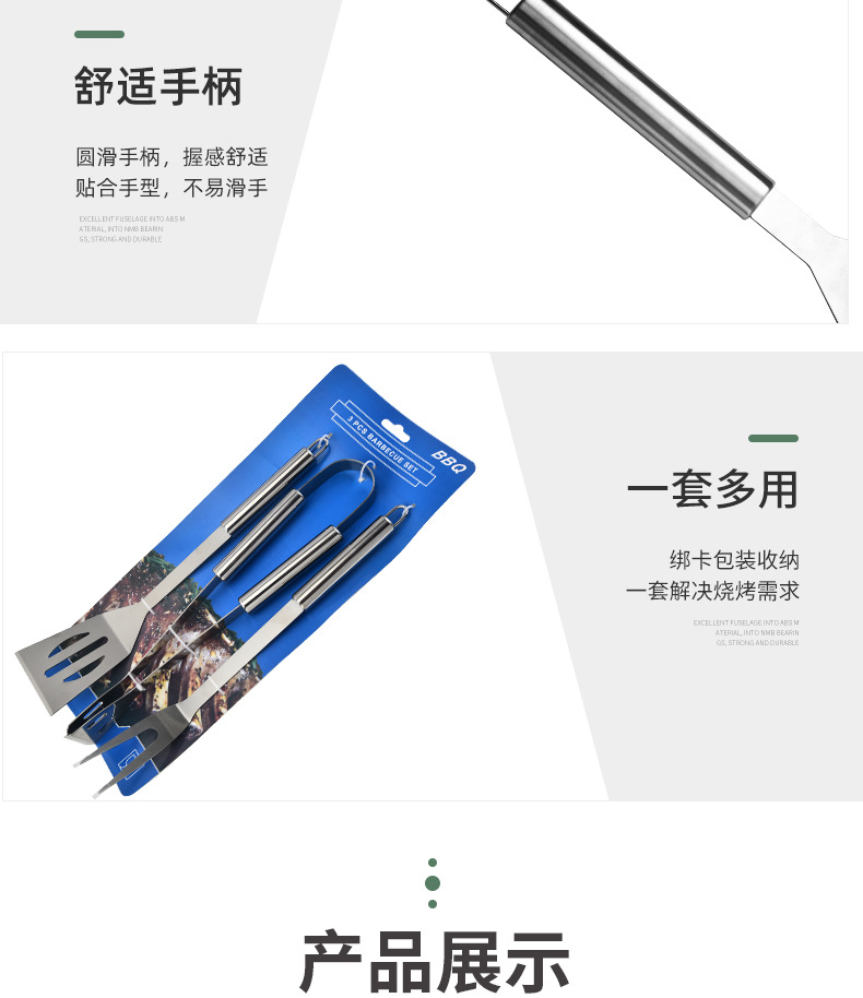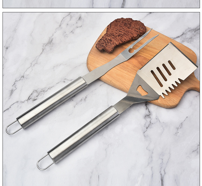 Fábrica directa de parrilla de acero inoxidable pala y horquilla combinación de abrazadera de tres piezas BBQ camping al aire libre parrilla de comida familiar