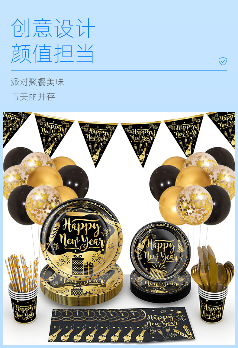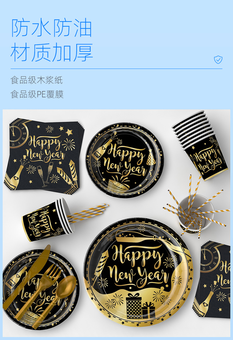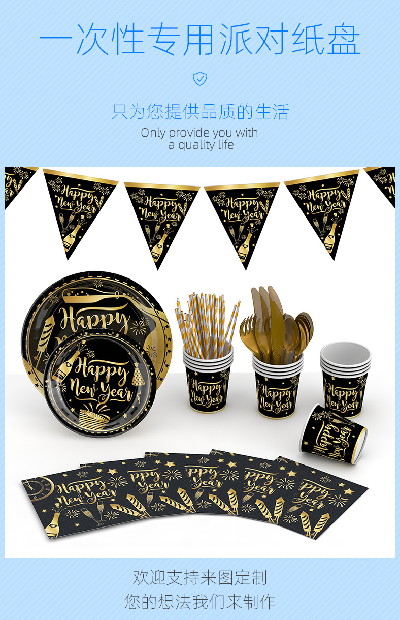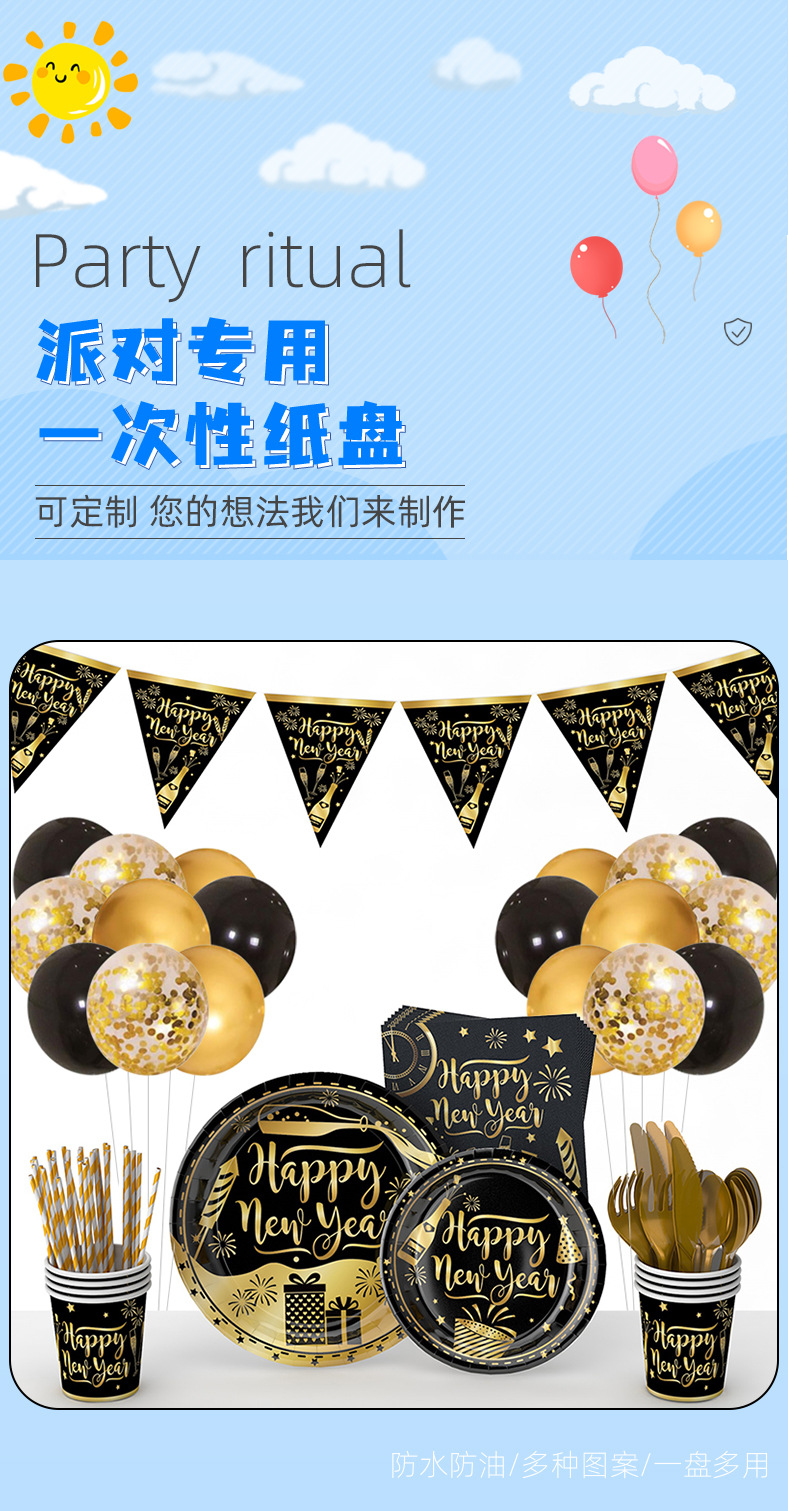 Amazon 2024 NUEVO AÑO fiesta plato de papel traje FELIZ AÑO NUEVO Oro Negro desechable plato de cena traje