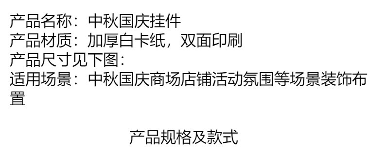 | Especificaciones | Colgante del Día Nacional 09,Colgante del Día Nacional 08,Colgante del Día Nacional 07,Colgante del Día Nacional 06,Colgante del Día Nacional 05,Colgante del Día Nacional 04,Colgante del Día Nacional 03,Colgante del Día Nacional 02,Colgante del Día Nacional 01,Colgante del Festival del Medio Otoño 09,Colgante del Festival del Medio Otoño 08,Colgante del Festival del Medio Otoño 07,Colgante del Festival del Medio Otoño 06,Colgante del Festival del Medio Otoño 05,Colgante del Festival del Medio Otoño 04,Colgante del Festival del Medio Otoño 03,Colgante de mediados de otoño 02,Colgante de mediados de otoño 01 |