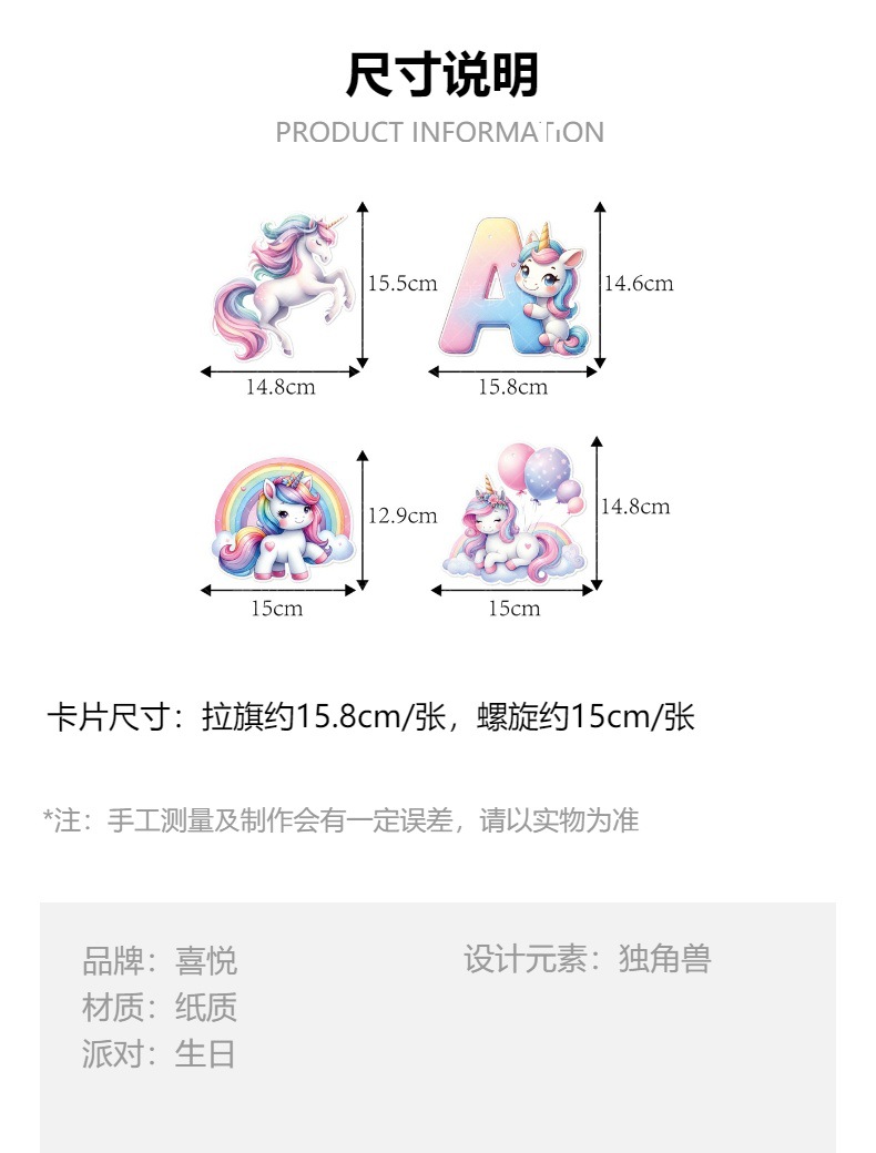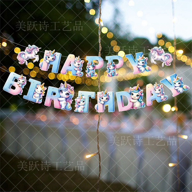 产品用途:生日派对装饰拉旗横幅,独角兽主题生日派对墙上天花板装饰道具,生日场景装饰用品,顶棚装饰,指引装饰。