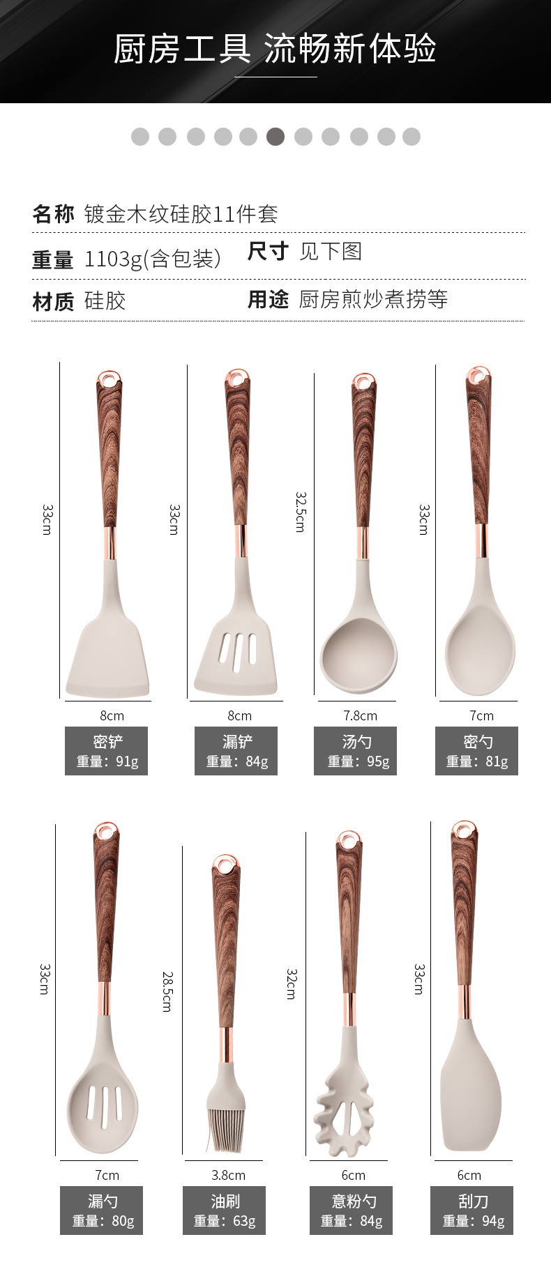 | Tamaño | Pala densa con mango de grano de madera cubierta 33*8CM,Pala de fuga con vetas de madera cubierta 33*8CM,Cuchara de sopa 32.5*7.8CM,Cuchara densa 33*7CM,Colador 33*7CM,Cepillo de aceite 28.5*3.8CM,Cuchara de pasta 32*6CM,Raspador 33*6CM,Ralla 33,5*8,5 CM,Raspador 33*6.8CM,Cubo de almacenamiento 16*13CM,Utensilios de cocina de grano de madera chapado en oro de silicona 11 piezas caja de barril 980g,Utensilios de cocina de grano de madera chapado en oro de silicona de 11 piezas de cubo de diamante en caja 1103g |