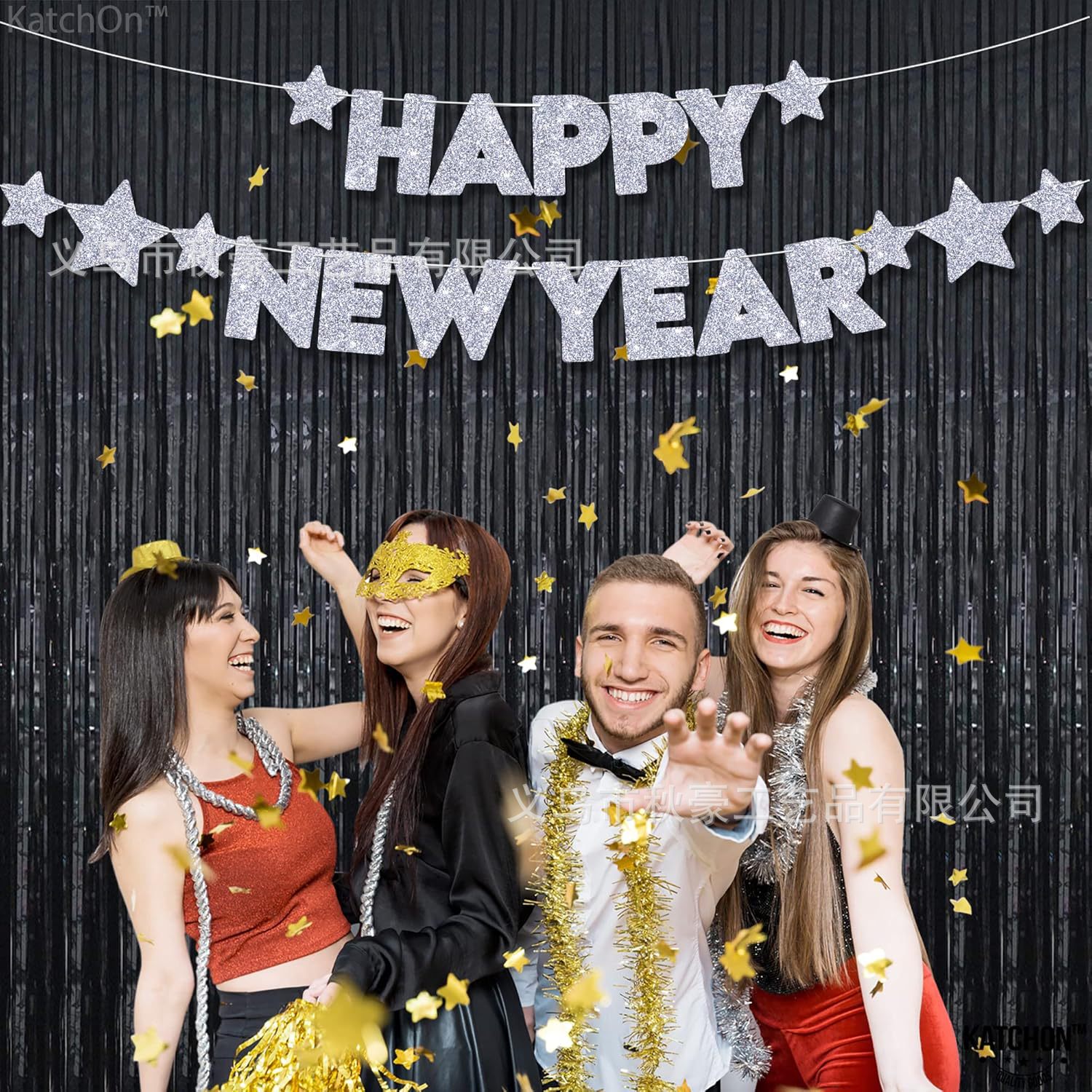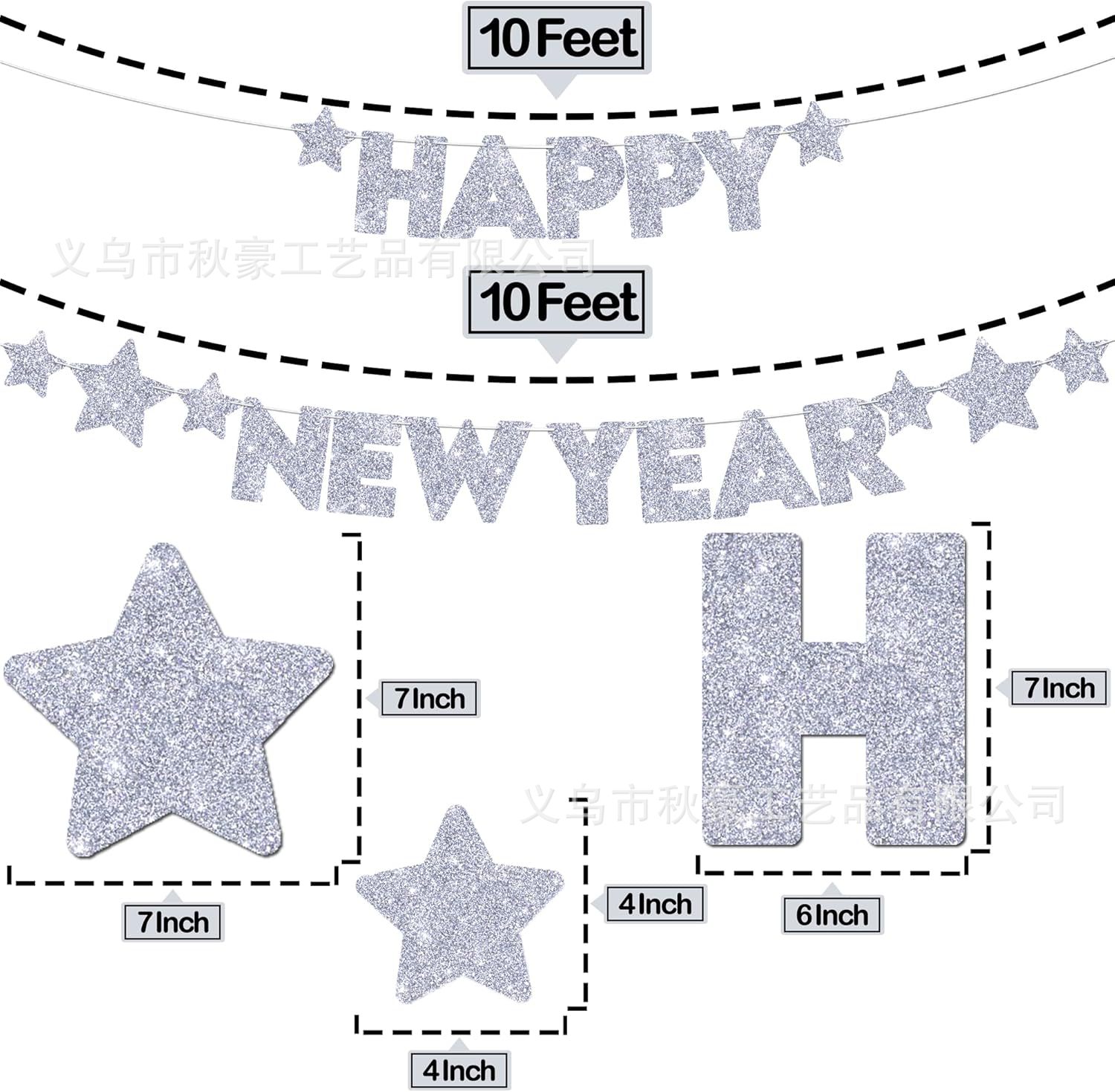Feliz nuevo año plateado brillo estrella de cinco puntas tira bandera cadena de disco redondo