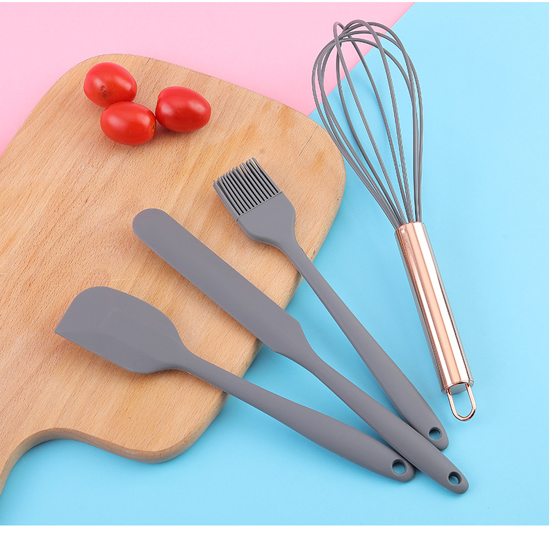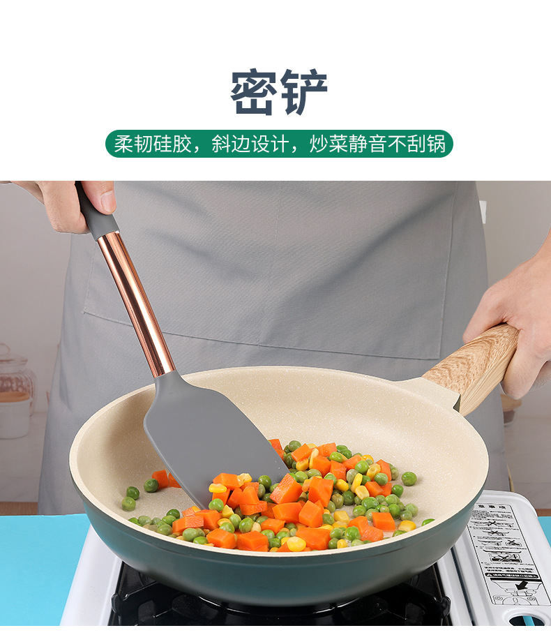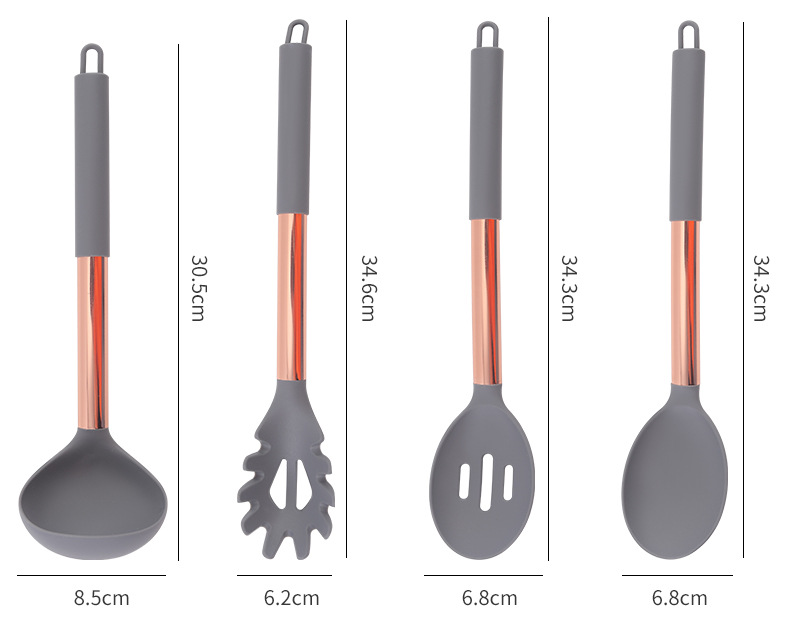 Utensilios de cocina con mango de acero inoxidable de oro rosa personalizado catorce juegos de pala, espátula, sartén antiadherente, herramientas de cocina para hornear y barbacoa