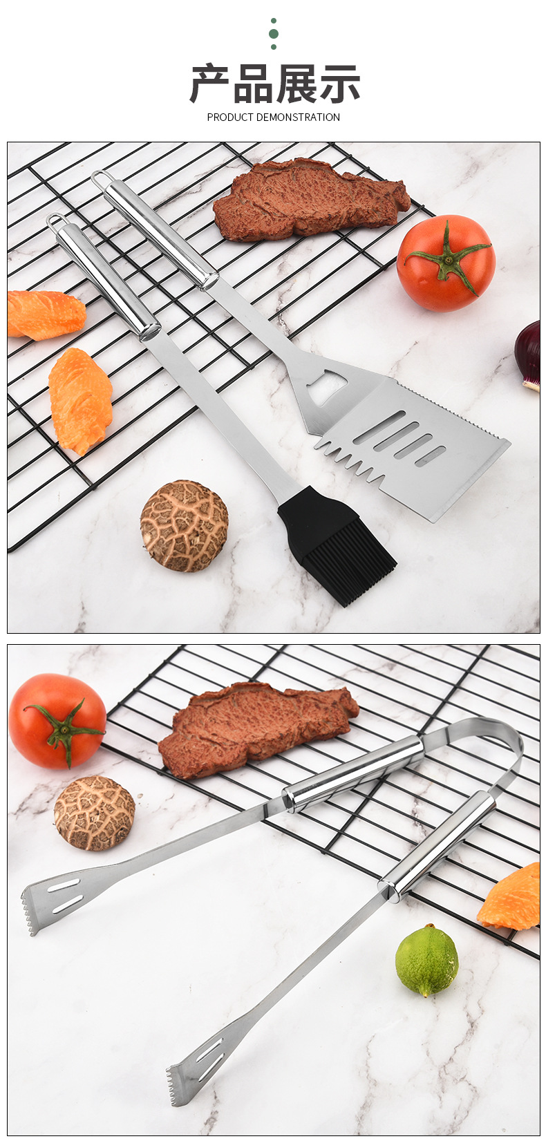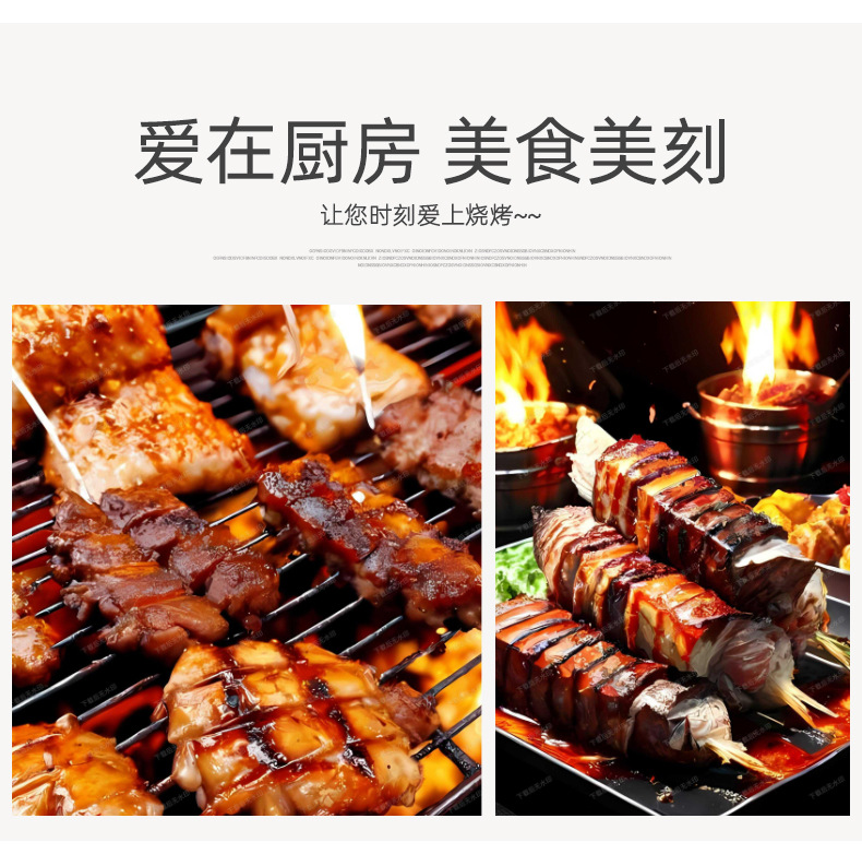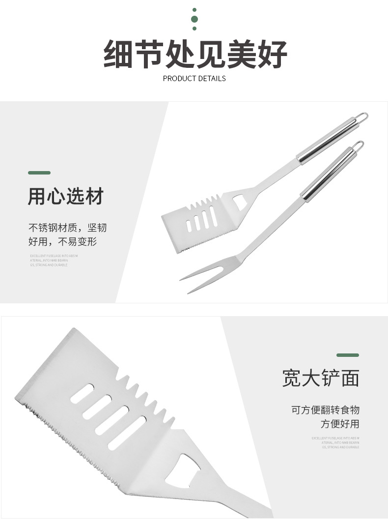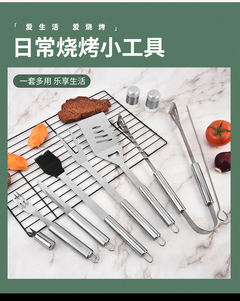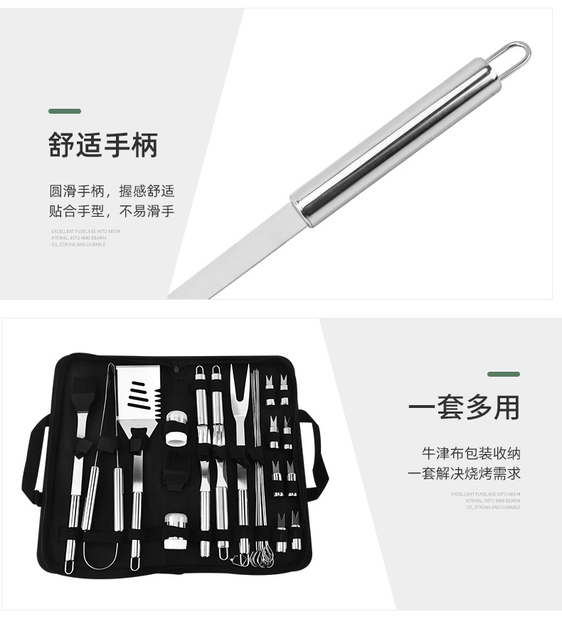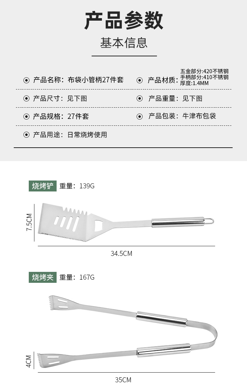 | Especificaciones | Juego de 27 piezas para asar - Bolsa de oxford, botella de condimento de un agujero pequeño, botella de condimento de cinco agujeros pequeños, tenedor de maíz, palillo de barbacoa, cepillo de aceite, cuchillo de bistec, tenedor de bistec, tenedor de barbacoa, clip de comida para barbacoa, pala de barbacoa |