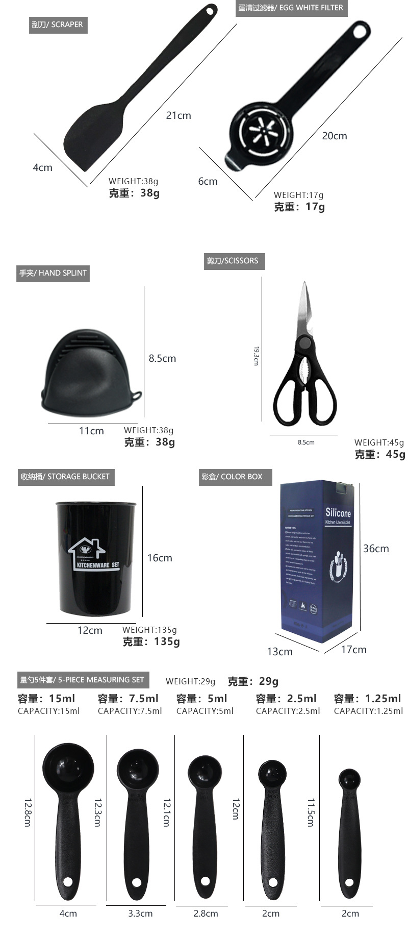 | Tamaño | Juegos de cocina de silicona 28 piezas (negro), juegos de cocina de silicona 28 piezas (gris), juegos de cocina de silicona 28 piezas (caqui), juegos de cocina de silicona 28 piezas (blanco), juegos de cocina de silicona 15 piezas (negro), juegos de cocina de silicona 15 piezas (gris), juegos de cocina de silicona 15 piezas (caqui), juegos de cocina de silicona 15 piezas (blanco) |