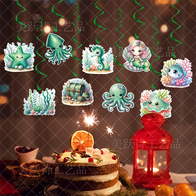 产品用途: 生日派对装饰用品,海底主题背景装饰螺旋吊牌,主题派对家居用品,生日气氛布置。