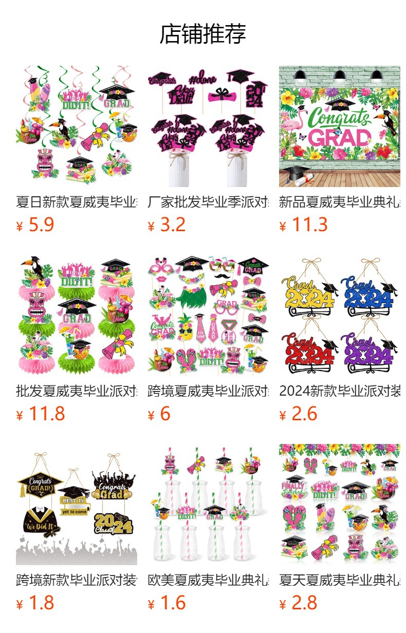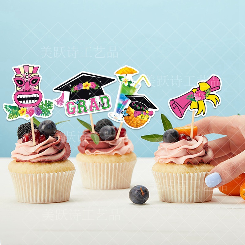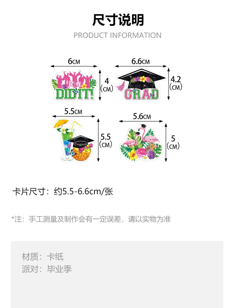 产品用途:毕业季派对装饰用品,夏威夷毕业典礼蛋糕甜品装饰,夏天毕业场景布置道具。