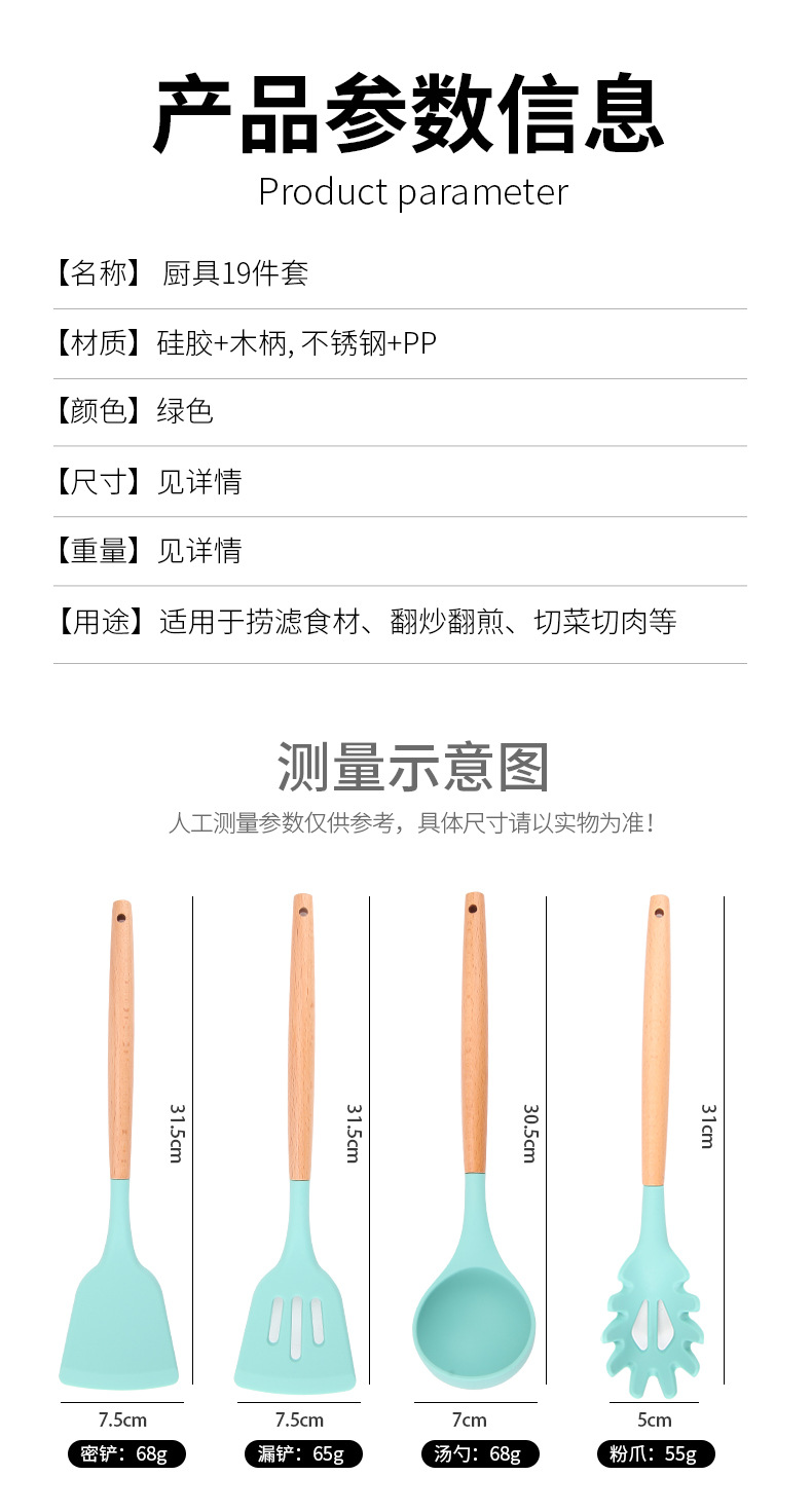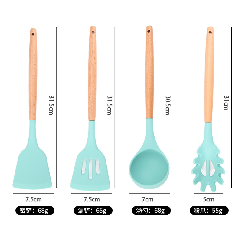 | Tamaño | Juego de doce piezas de Lake Green (incluido el barril),Pala secreta,Pala con fugas,Raspador,Cuchara de sopa,Un colador,Cuchara de cocina,Cepillo de aceite de silicona |