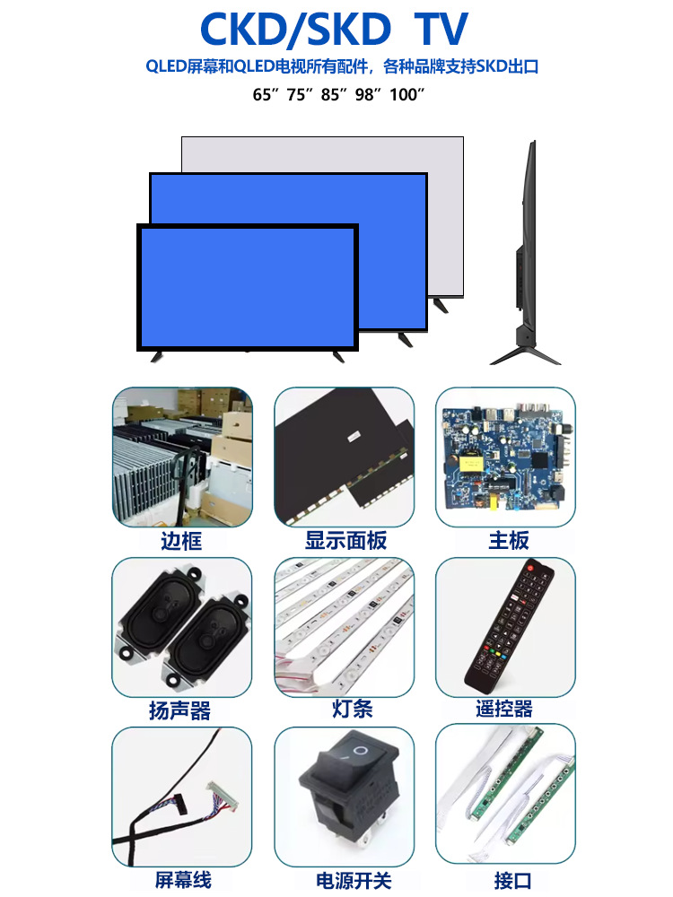 Tamaño de la pantalla | 17 pulgadas [ckd / skd], 32 pulgadas [ckd / skd], 43 pulgadas [ckd / skd], 50 pulgadas [ckd / skd], 55 pulgadas [ckd / skd], 65 pulgadas [ckd / skd], 75 pulgadas [ckd / skd], 85 pulgadas [ckd / skd], 98 pulgadas [ckd / skd], 100 pulgadas [ckd / skd] |