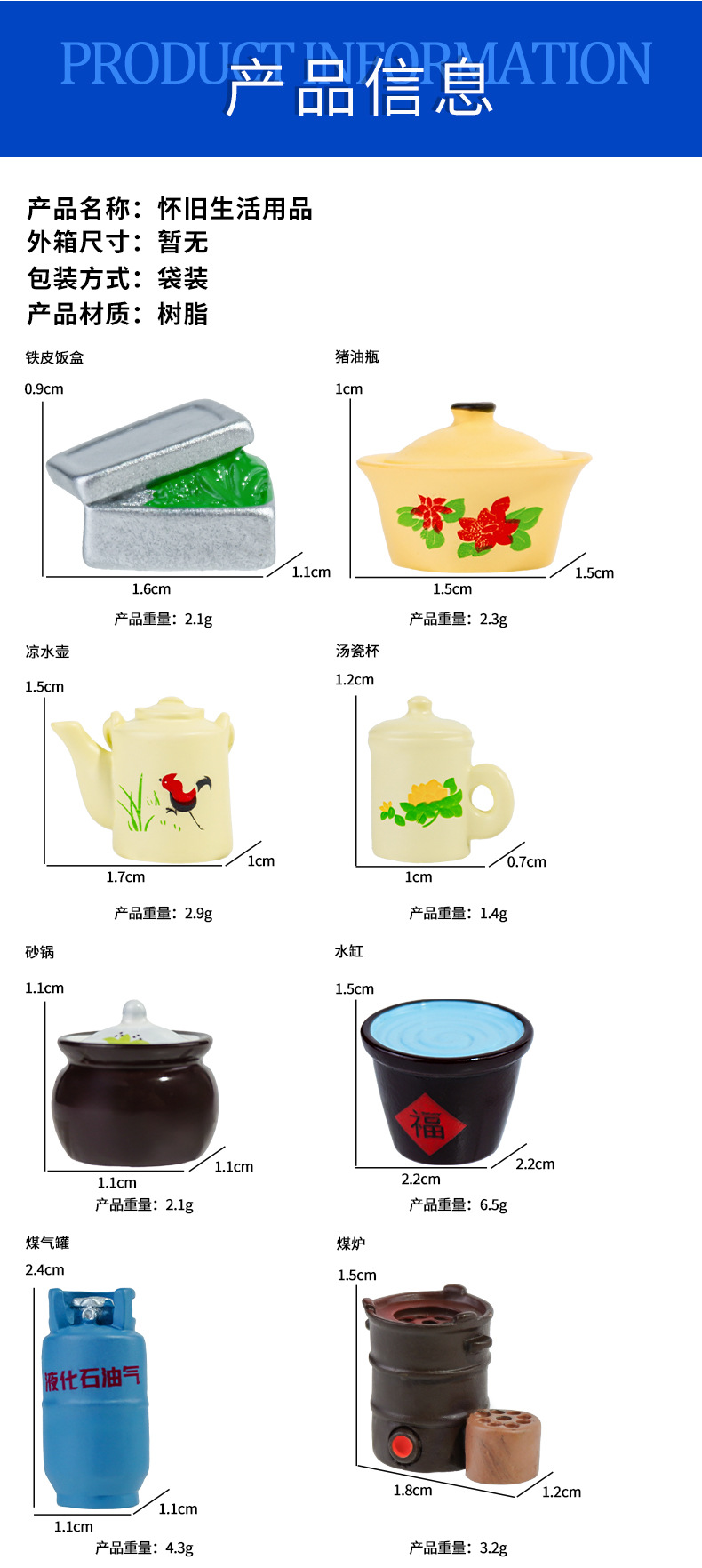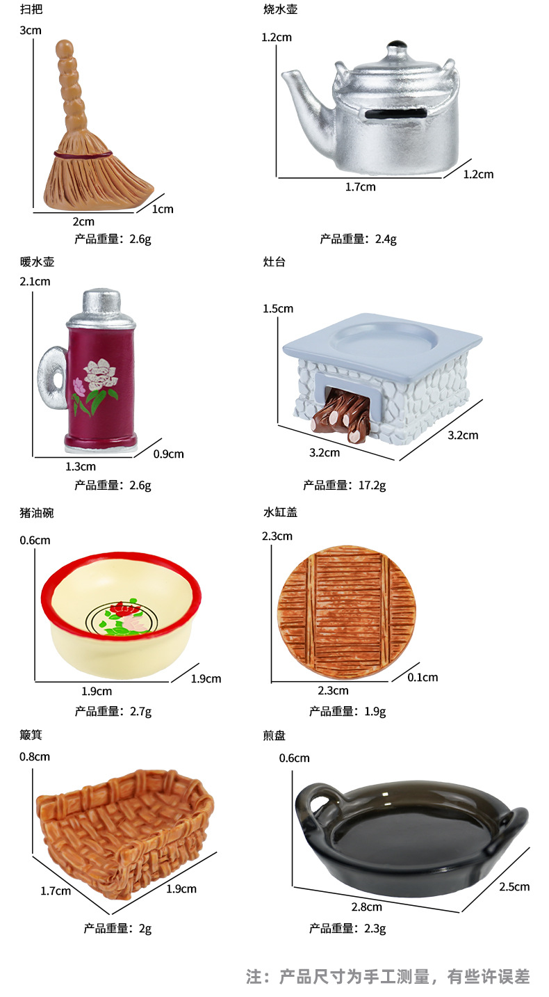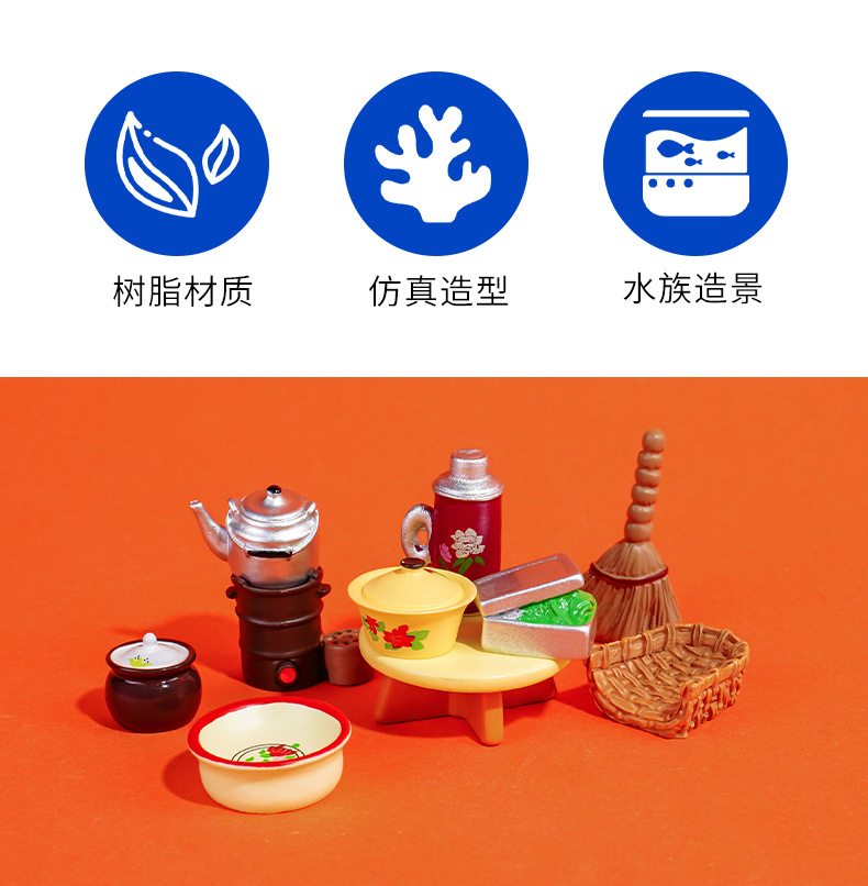 ColoresFiambrera de hojalata,Botella de aceite de cerdo,Botella de agua fría,Taza de sopa de porcelana,Cazuela,Tanque de agua,Tanque de gas,Estufa de carbón,Escoba,Hervidor de agua,Hervidor de agua caliente,Estufa,Tazón de manteca de cerdo,Culata de agua,Recogedor,Placa para freír