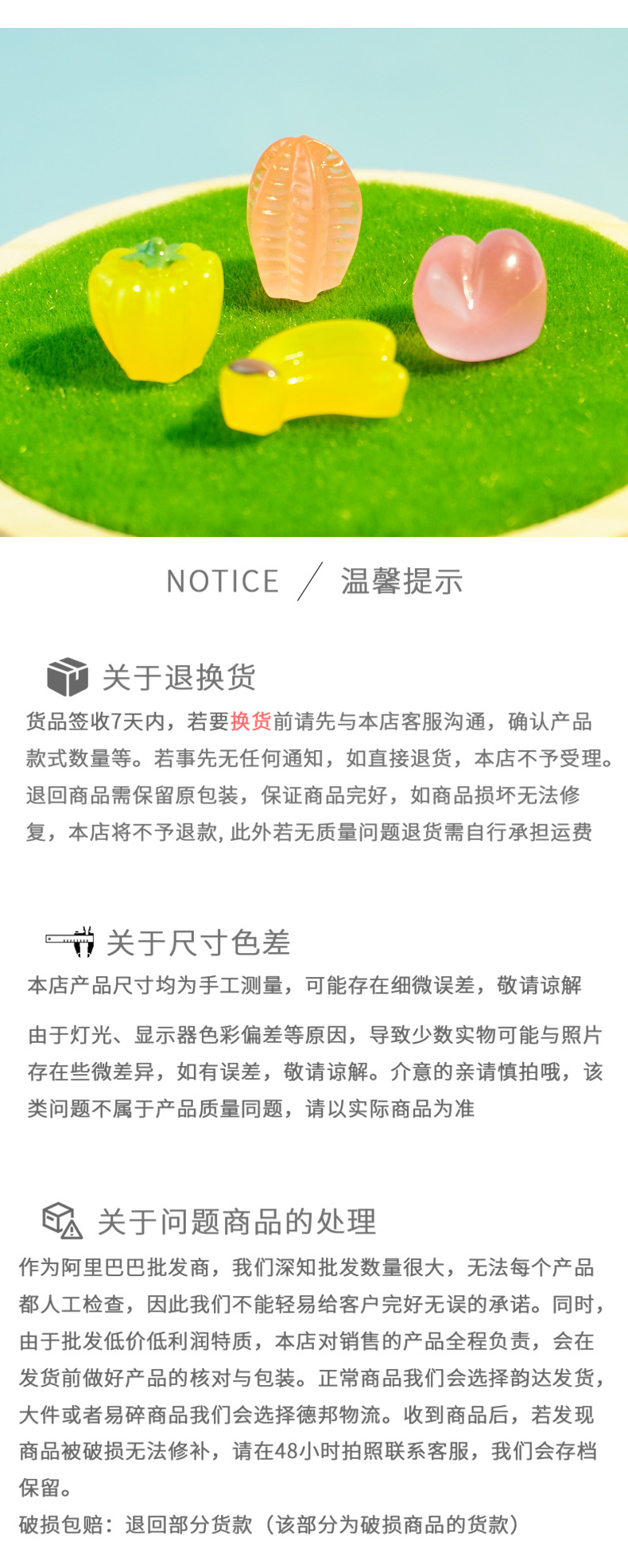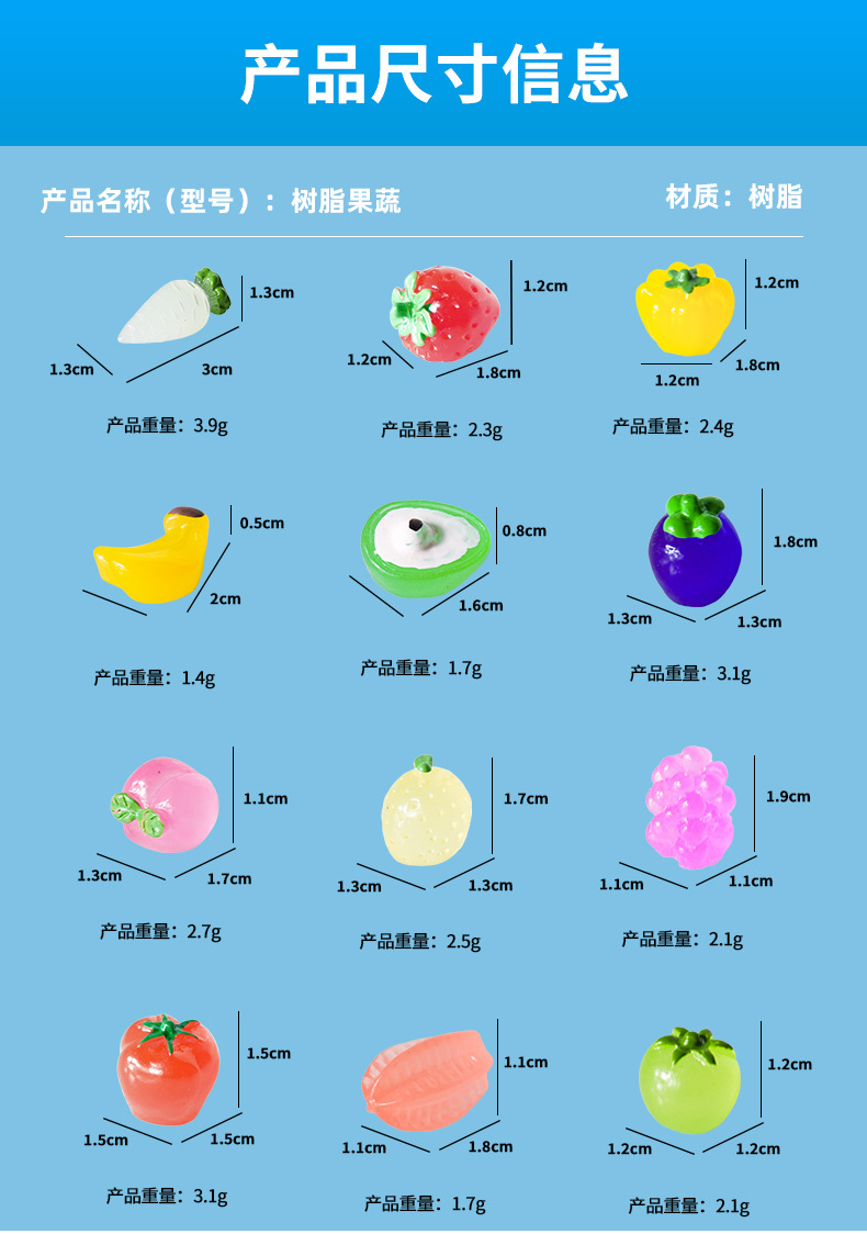 | Especificaciones | Frutas y verduras de resina |