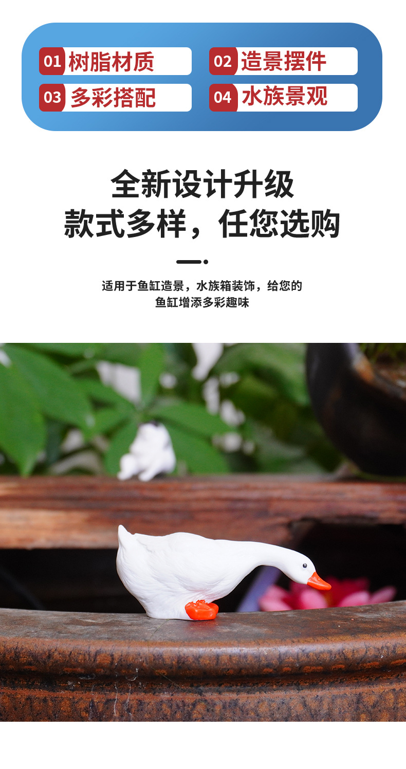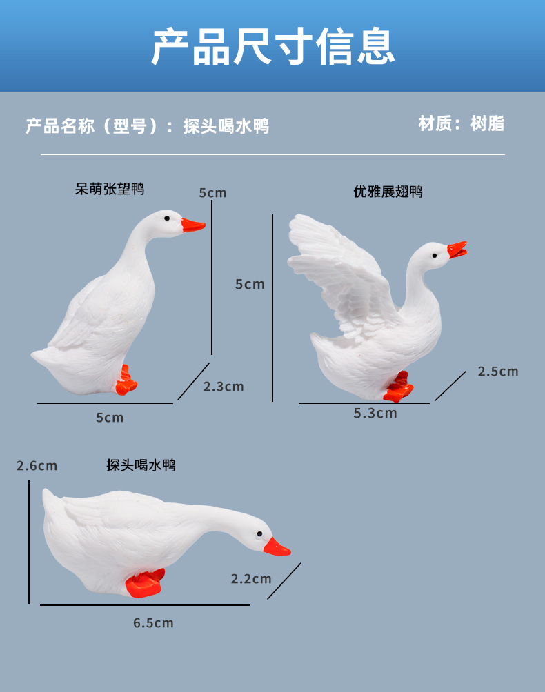 | Especificaciones | Pato de agua potable con sonda (modelo de resina),Lindo pato Zhang Wang (tipo resina),Pato elegante con alas (resina),Traje de pato pequeño (juego de 3) |