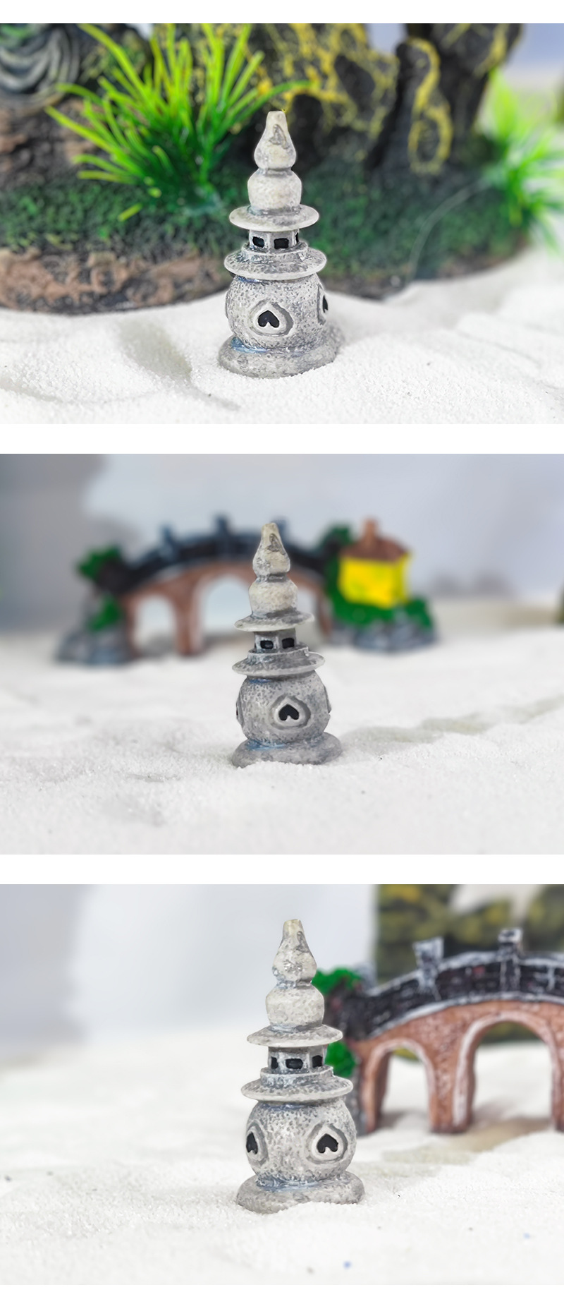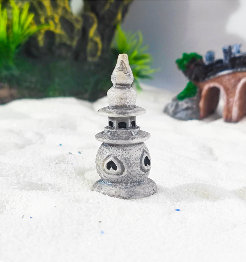 Venta caliente micro paisaje rocalla decoración zen tres piscinas luna luna pequeña torre de piedra linterna palacio antiguo pecera paisajismo punto cabello directo