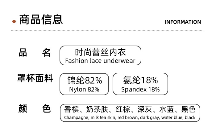 | Función | Reunir,Sin rastro,Transpirable,En el apoyo,Hermoso respaldo,Absorción del sudor,Anti-luz,Cómodo,Recibación lateral,Tetas,Pechos grandes y pequeños |