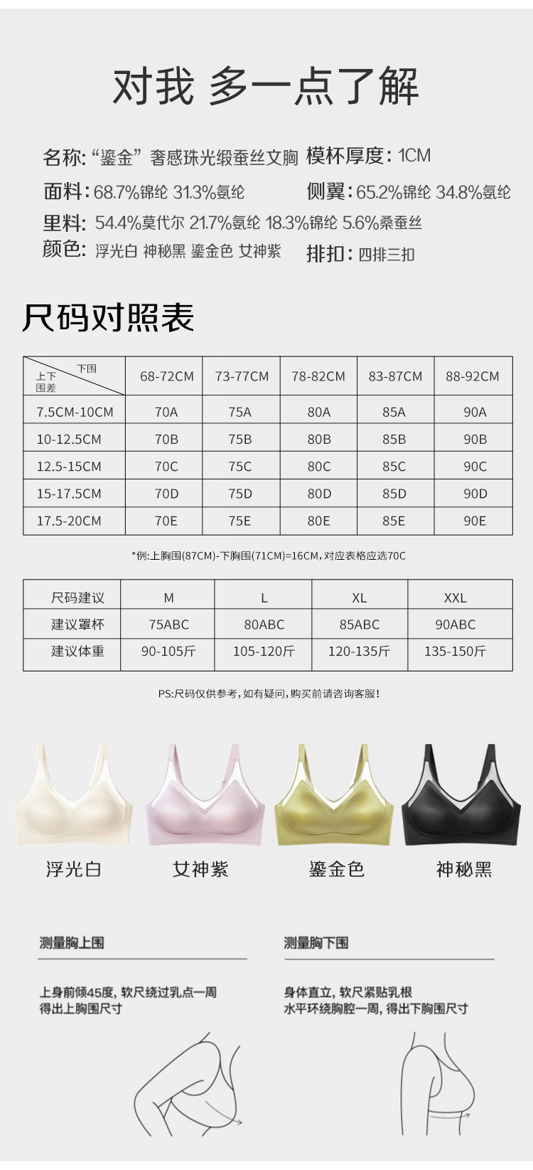 | Función | Reunir,Sin rastro,Transpirable,En el apoyo,Invisible,Anti-luz,Tipo de ajuste,Cómodo,Recibación lateral,Tetas |