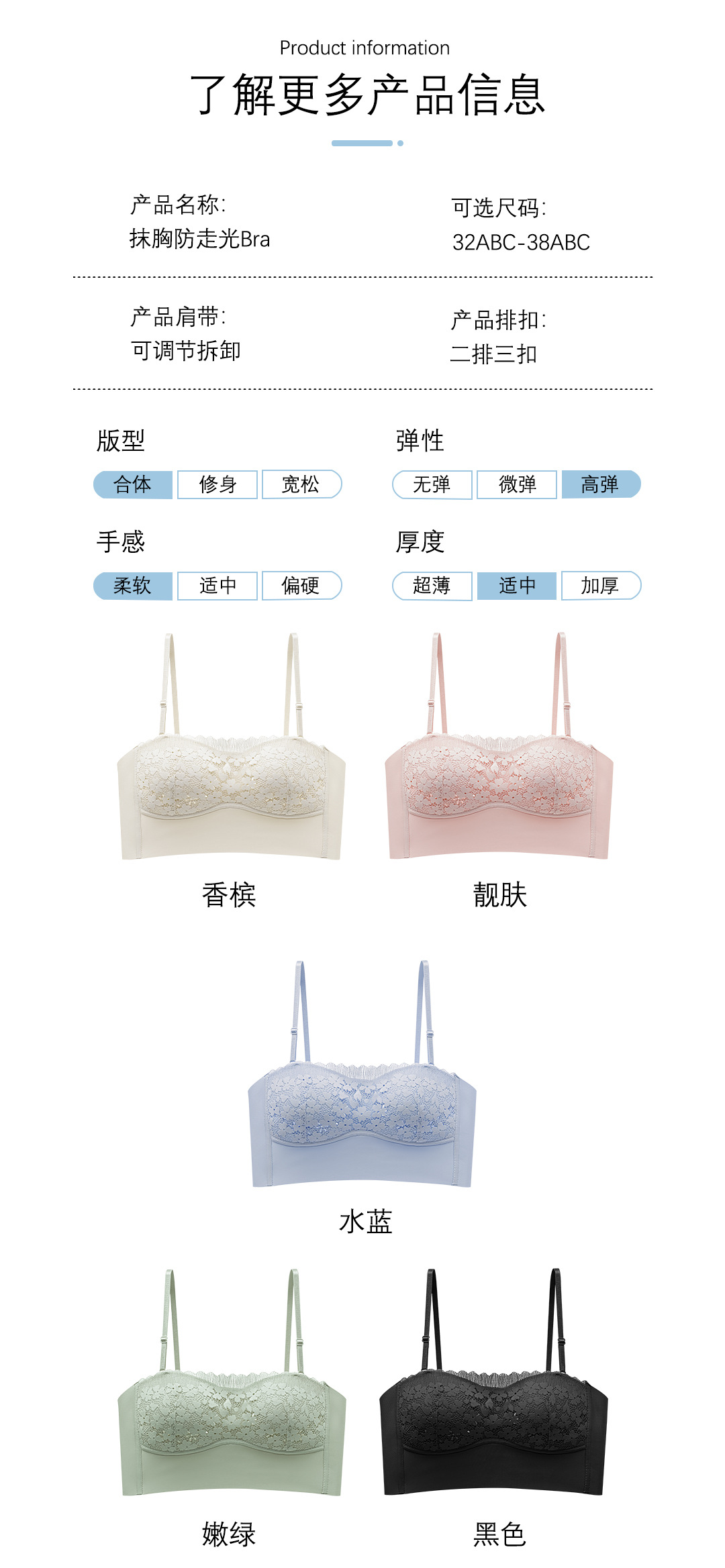| Colores | Champagne,Piel hermosa,Azul agua,Verde tierno,Negro |