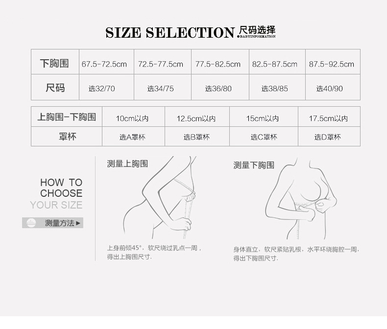 | Tamaño | S [adecuado para 70/32AB],M [adecuado para 75/34AB],L [adecuado para 80/36AB],XL [adecuado para 85/38AB] |