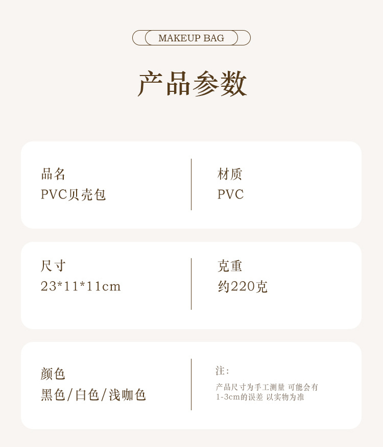 | Colores | Bolsa de concha de PVC-café claro,Bolsa de concha de PVC-negro,Paquete de concha de PVC-blanco |