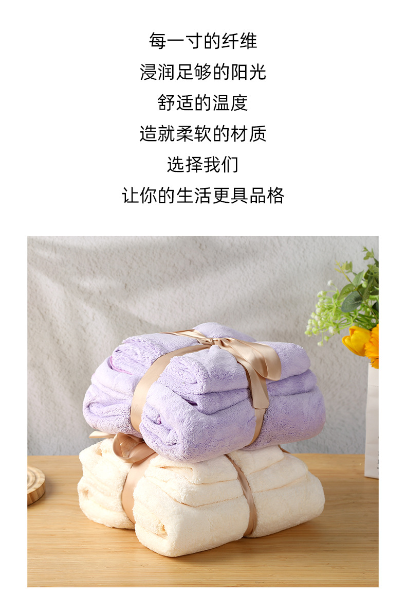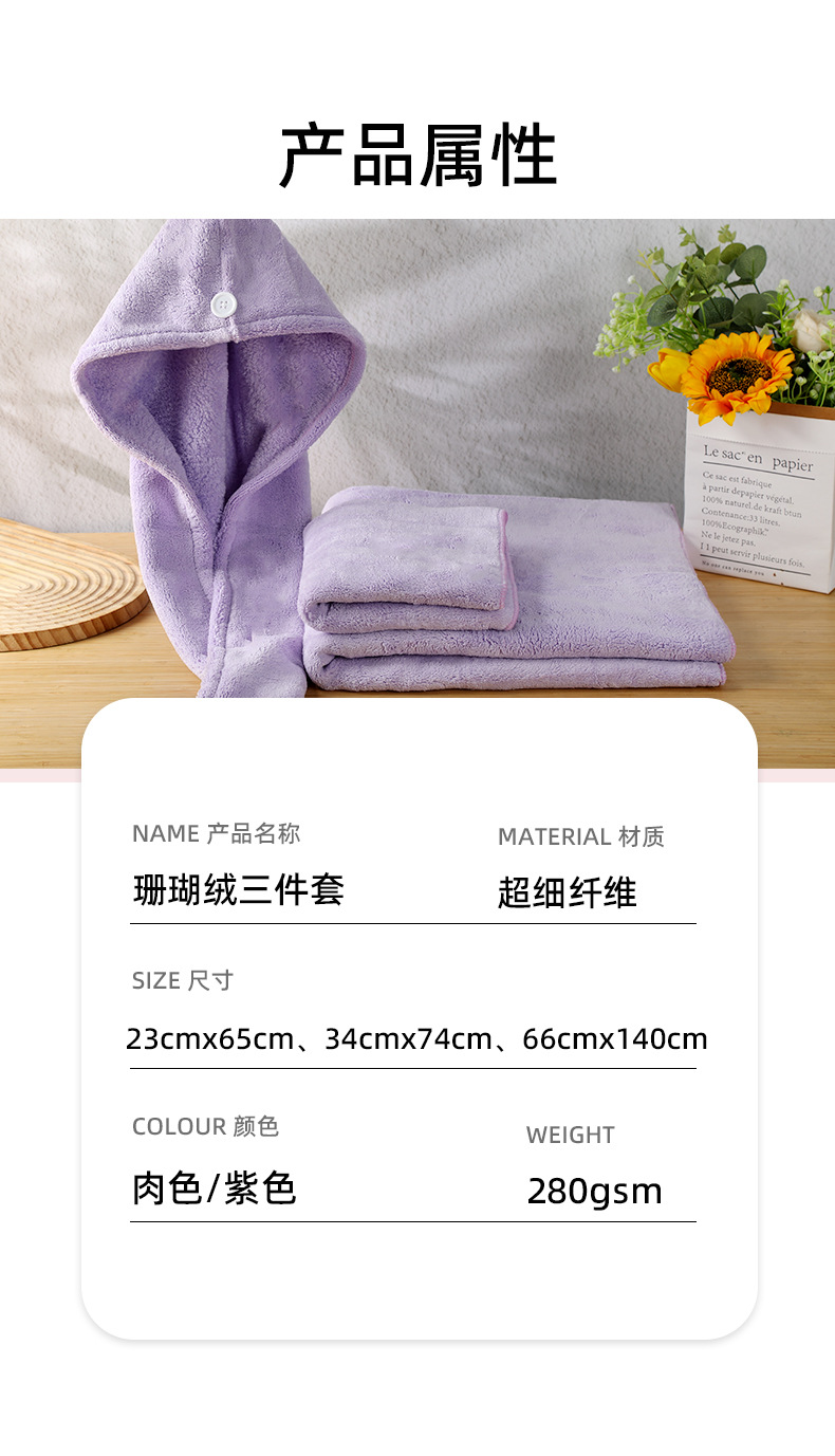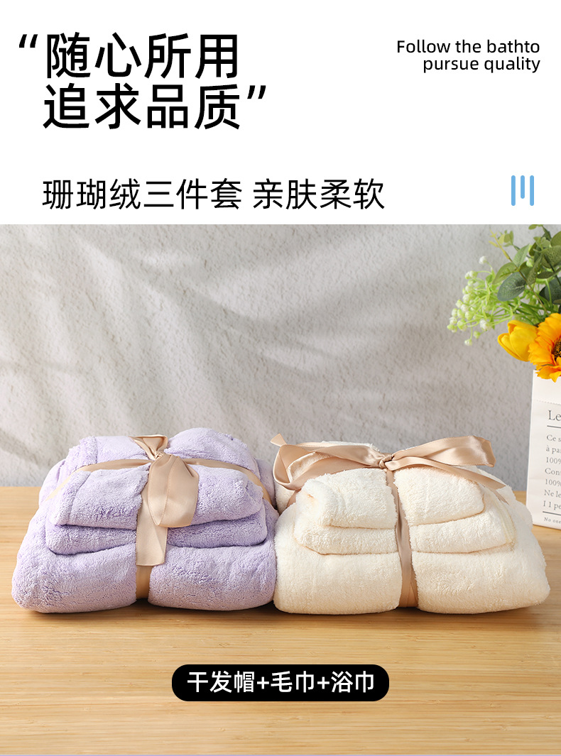 Venta al por mayor de terciopelo de coral de tres piezas, suave y agradable para la piel, cómodo y transpirable, gorro de pelo seco, juego de toallas de baño