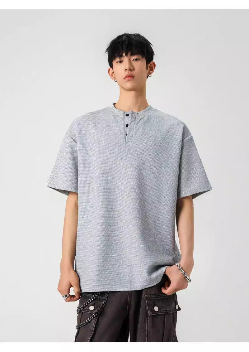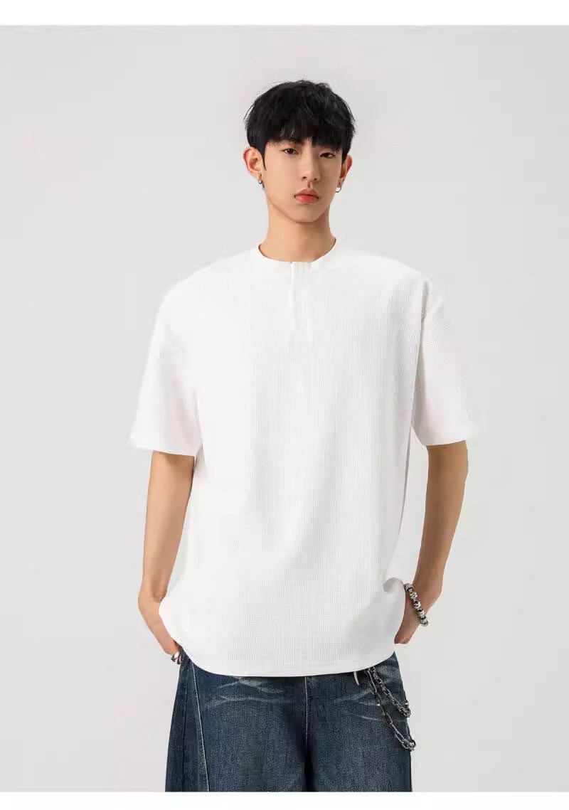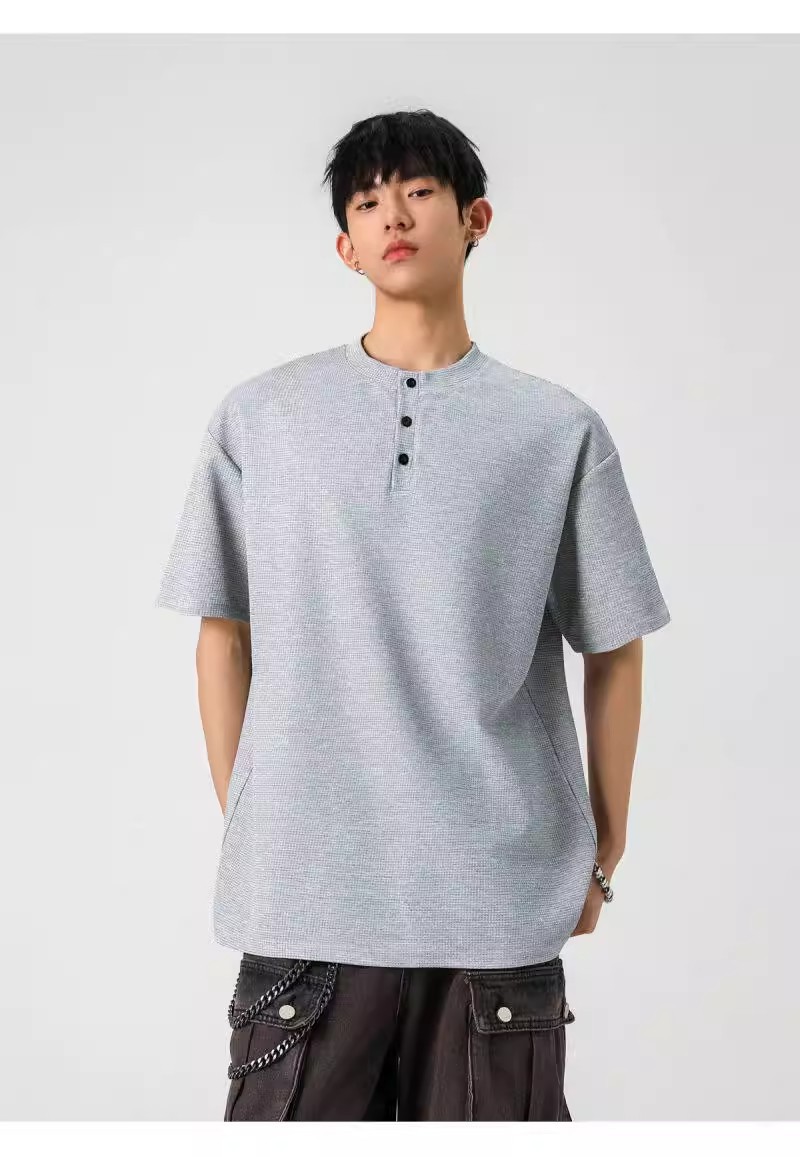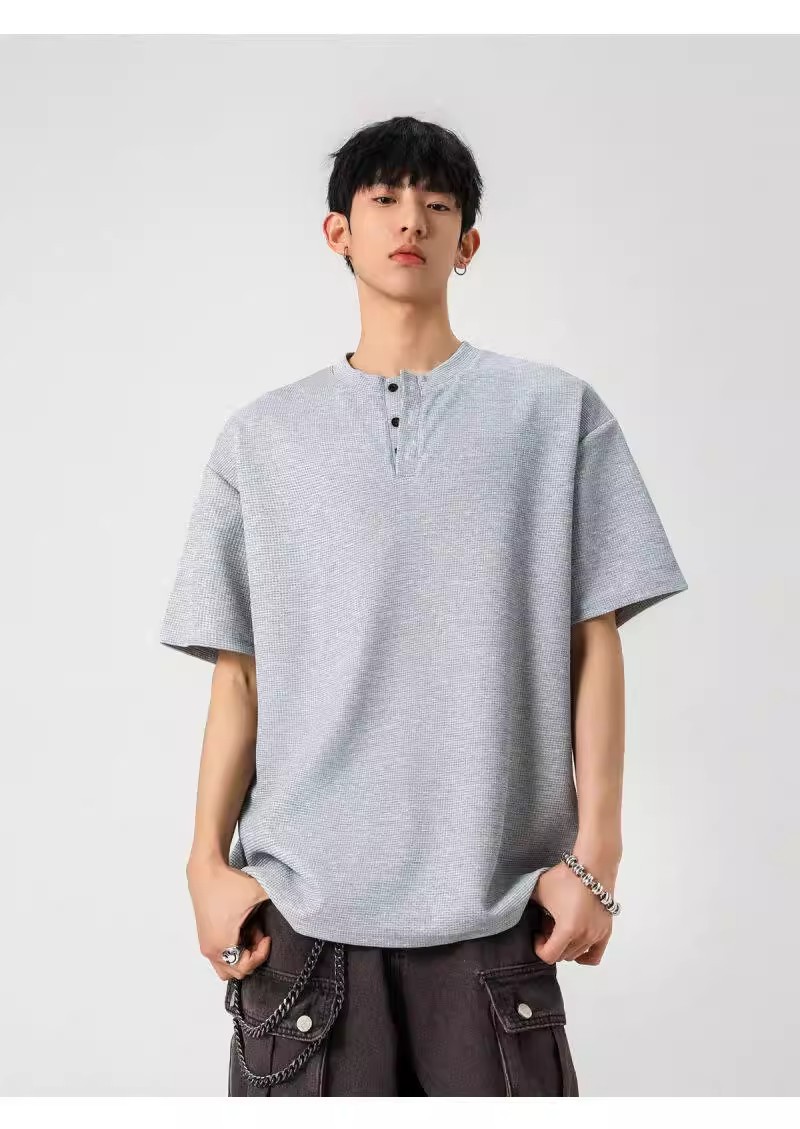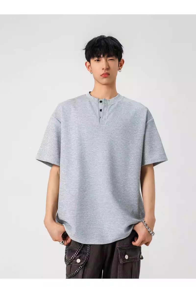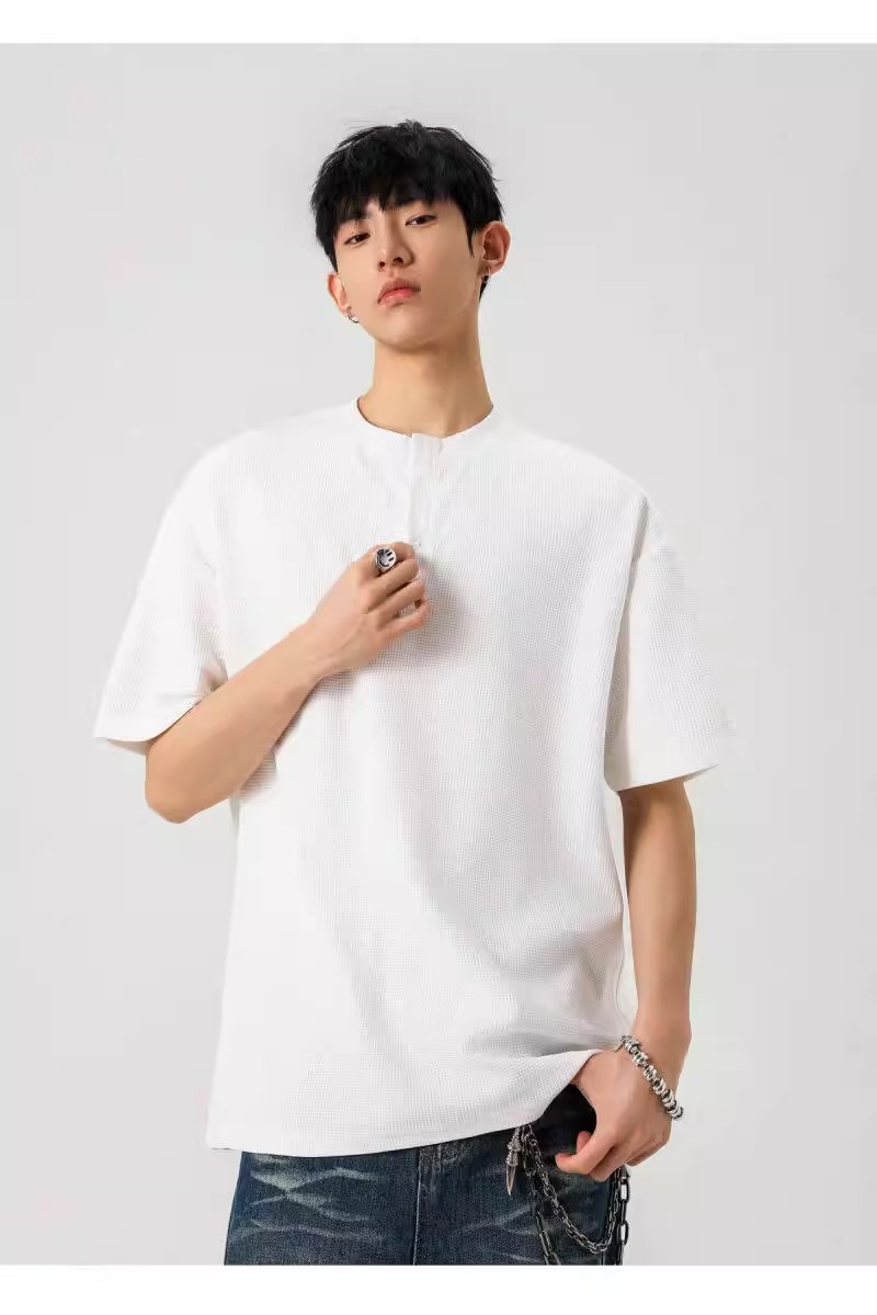 Camiseta de peso pesado con cuello Henry americano para hombre waffle de verano hombro de manga corta camiseta casual suelta