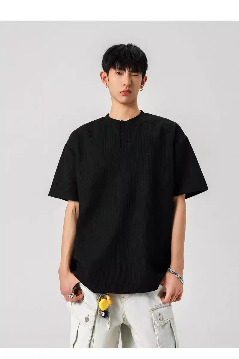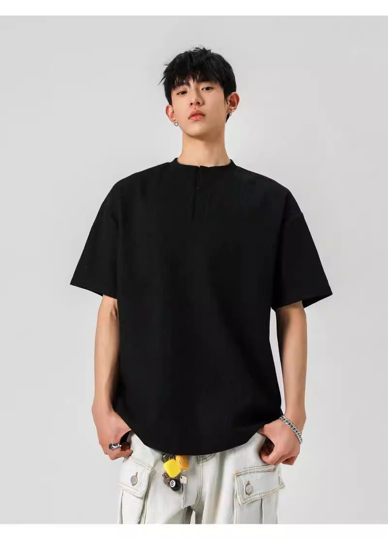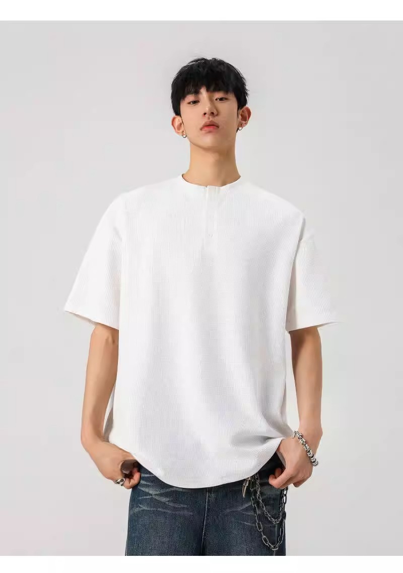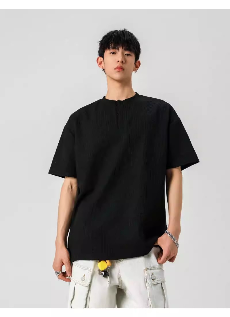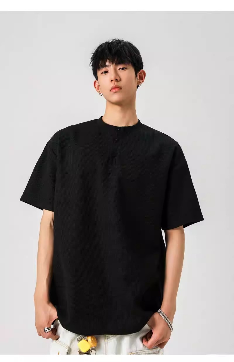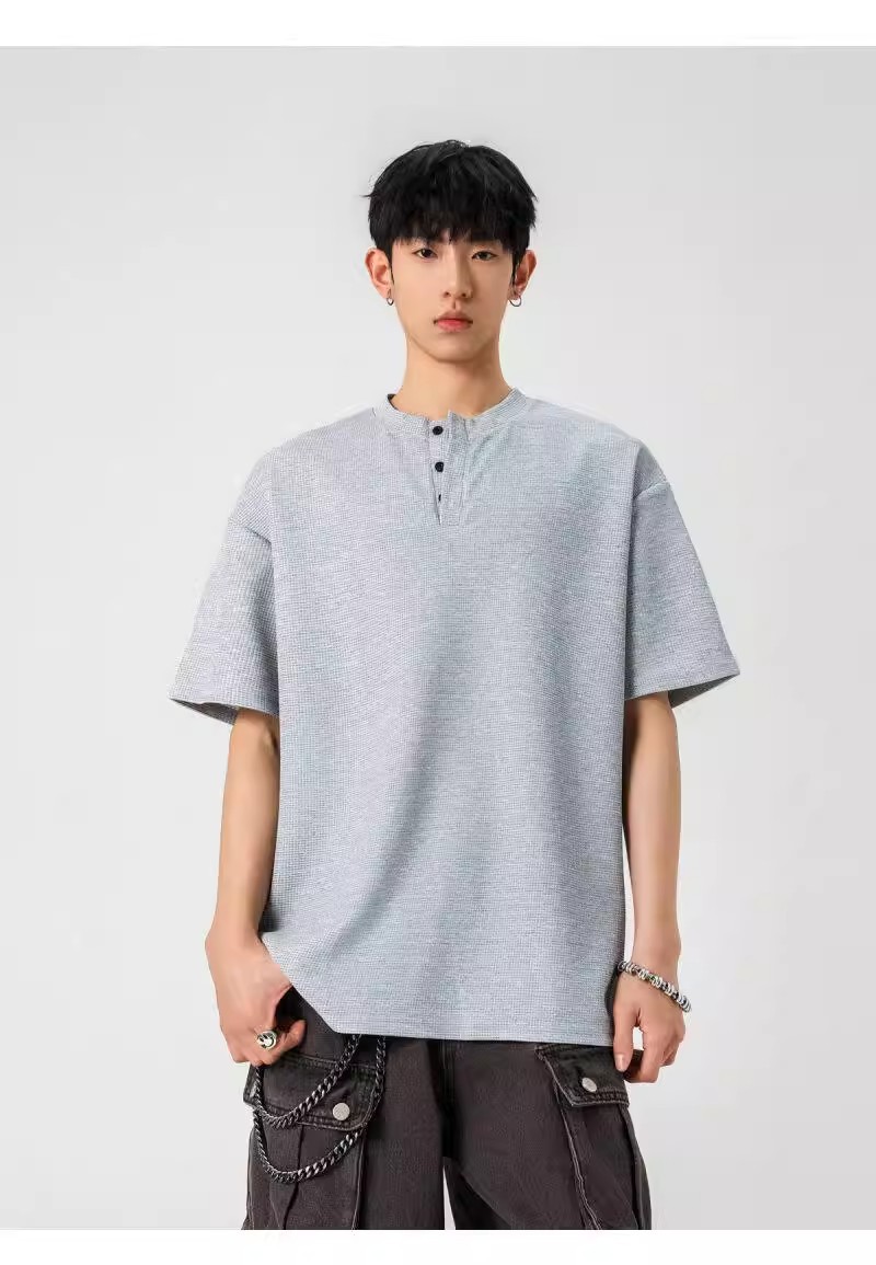 Camiseta de peso pesado con cuello Henry americano para hombre waffle de verano hombro de manga corta camiseta casual suelta