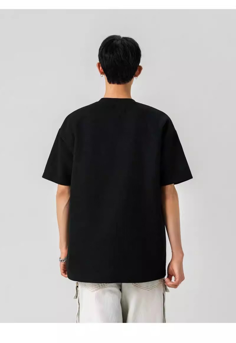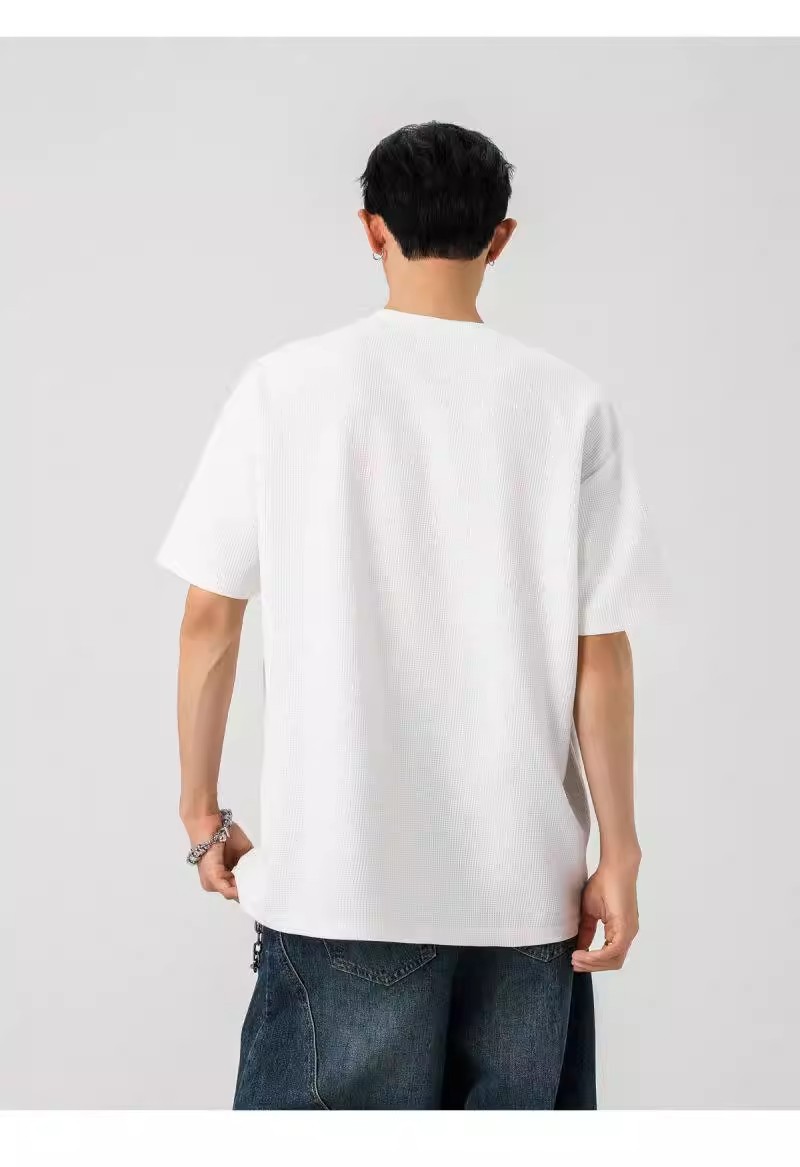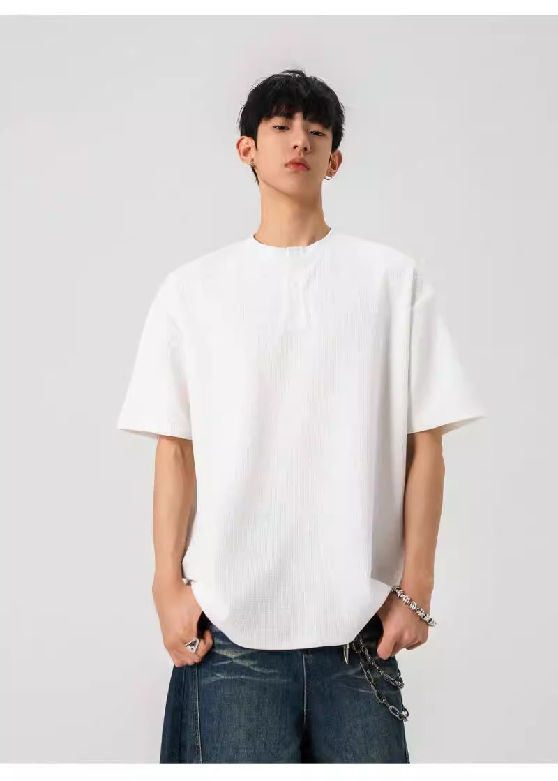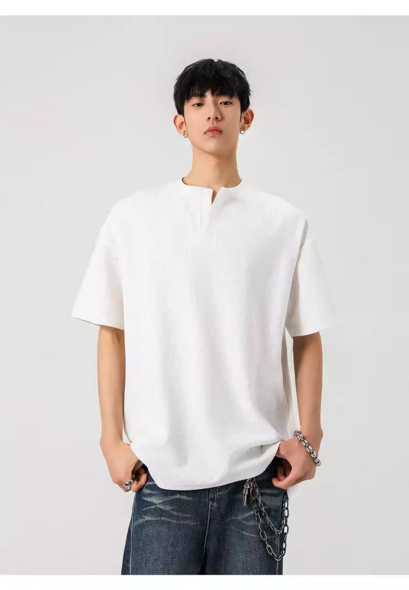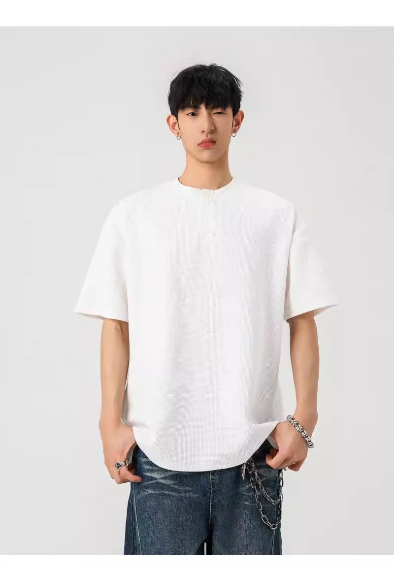 Camiseta de peso pesado con cuello Henry americano para hombre waffle de verano hombro de manga corta camiseta casual suelta