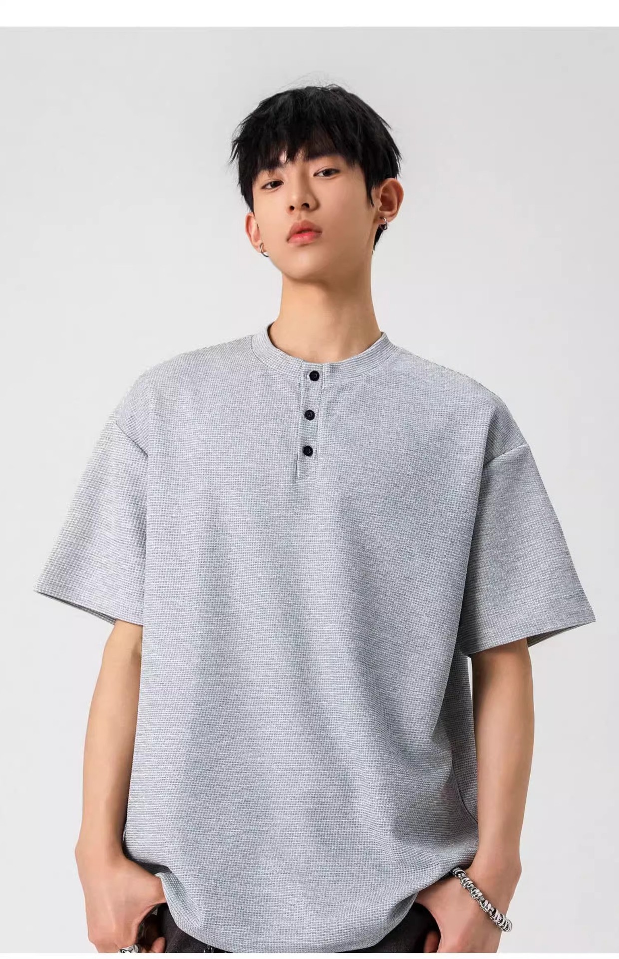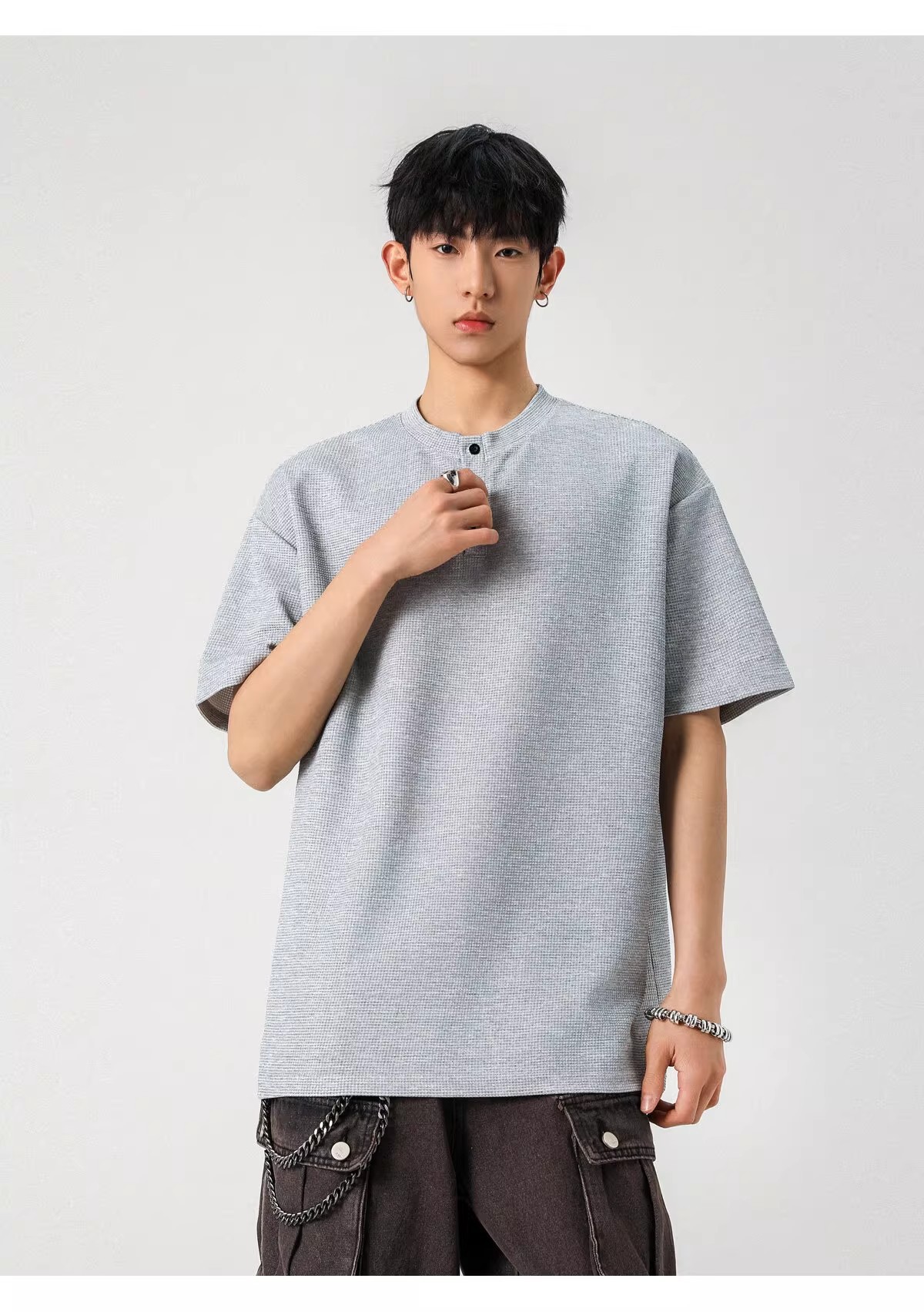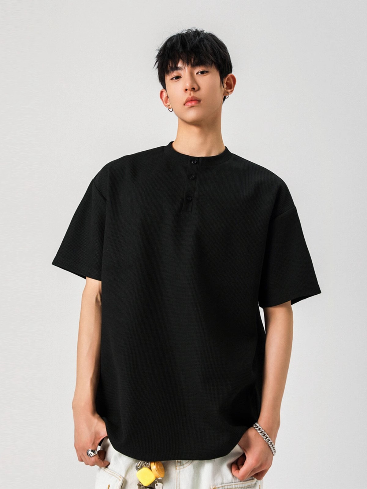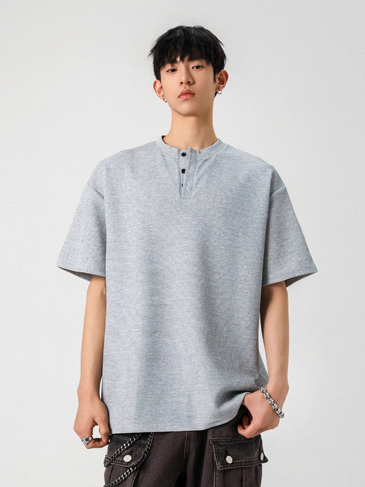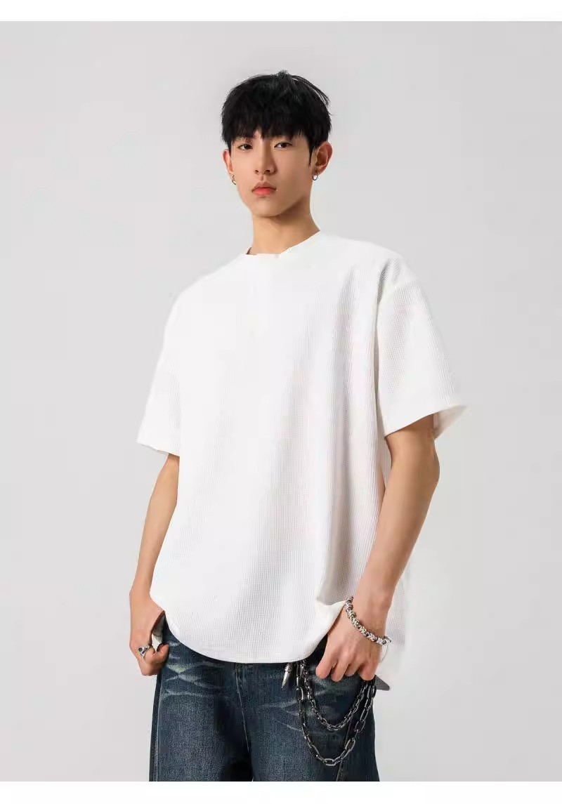 Camiseta de peso pesado con cuello Henry americano para hombre waffle de verano hombro de manga corta camiseta casual suelta
