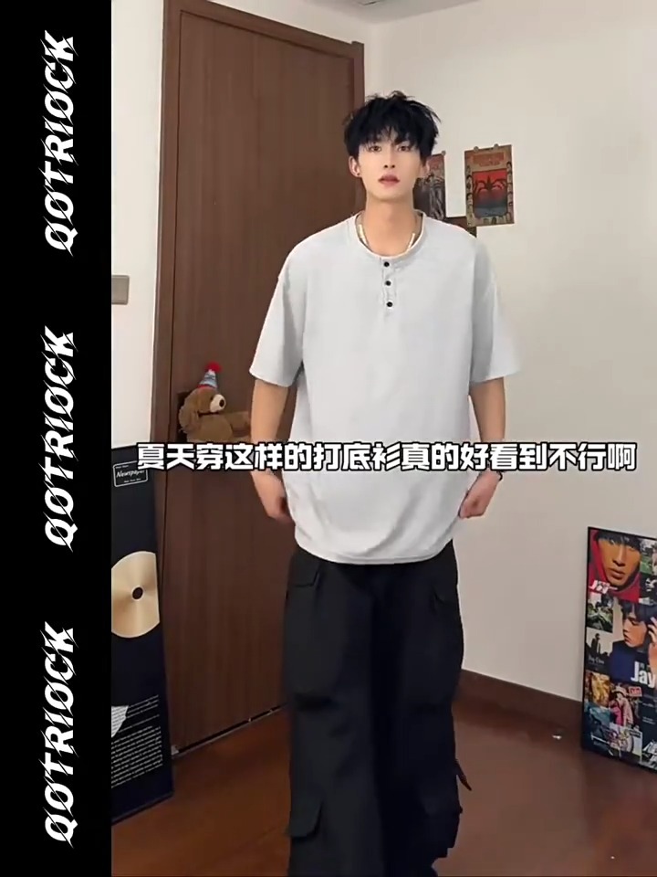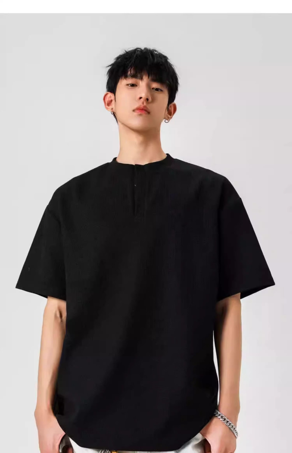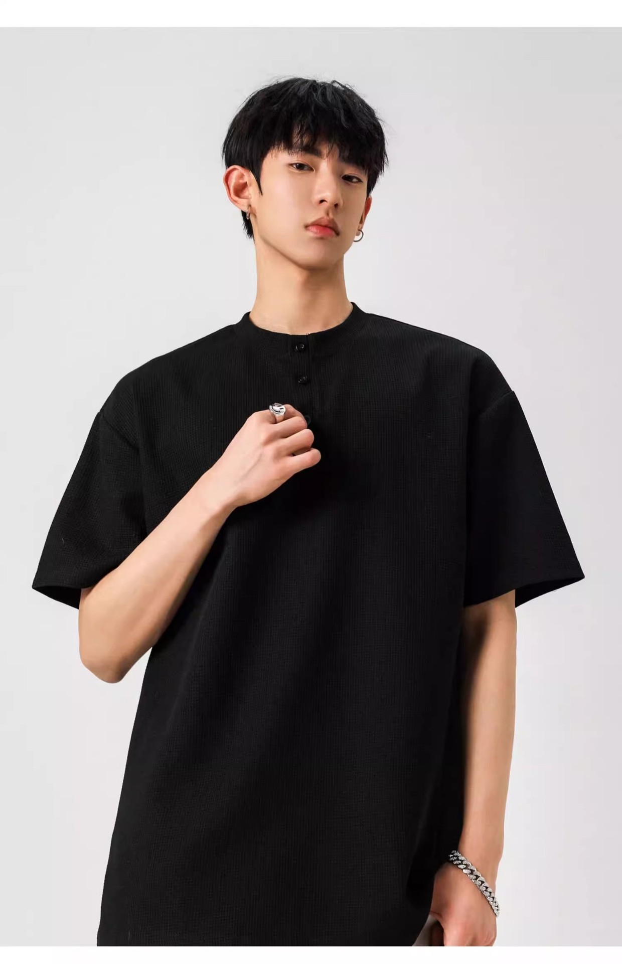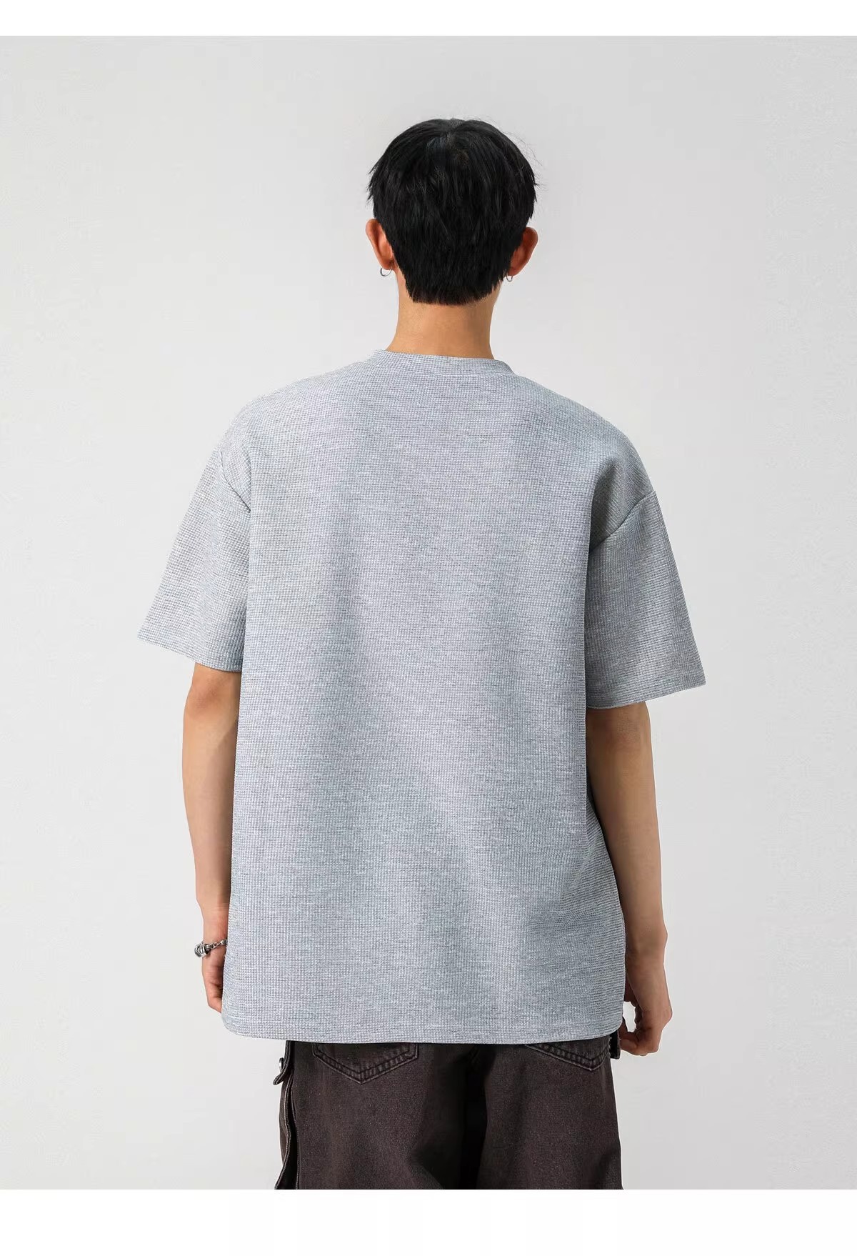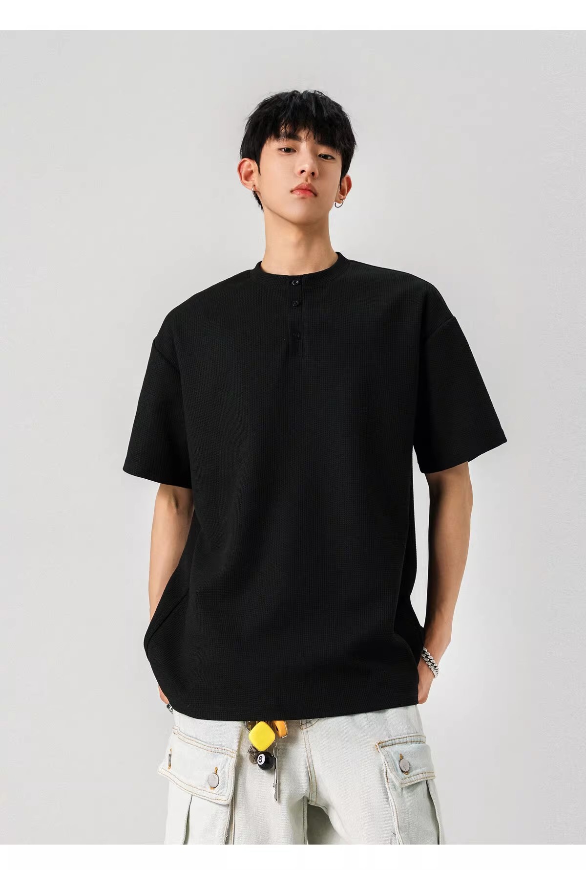 Camiseta de peso pesado con cuello Henry americano para hombre waffle de verano hombro de manga corta camiseta casual suelta