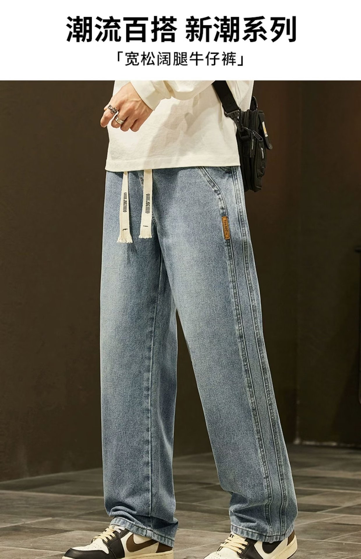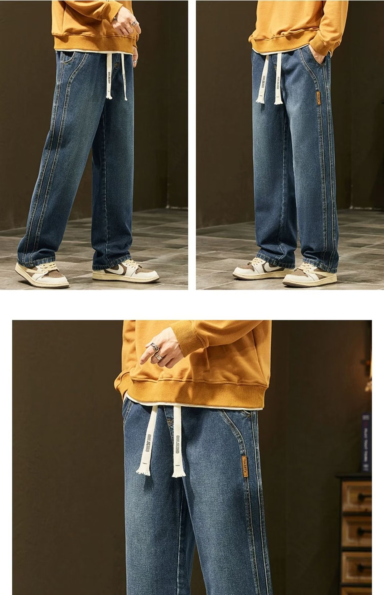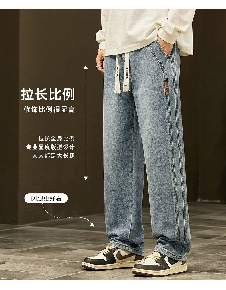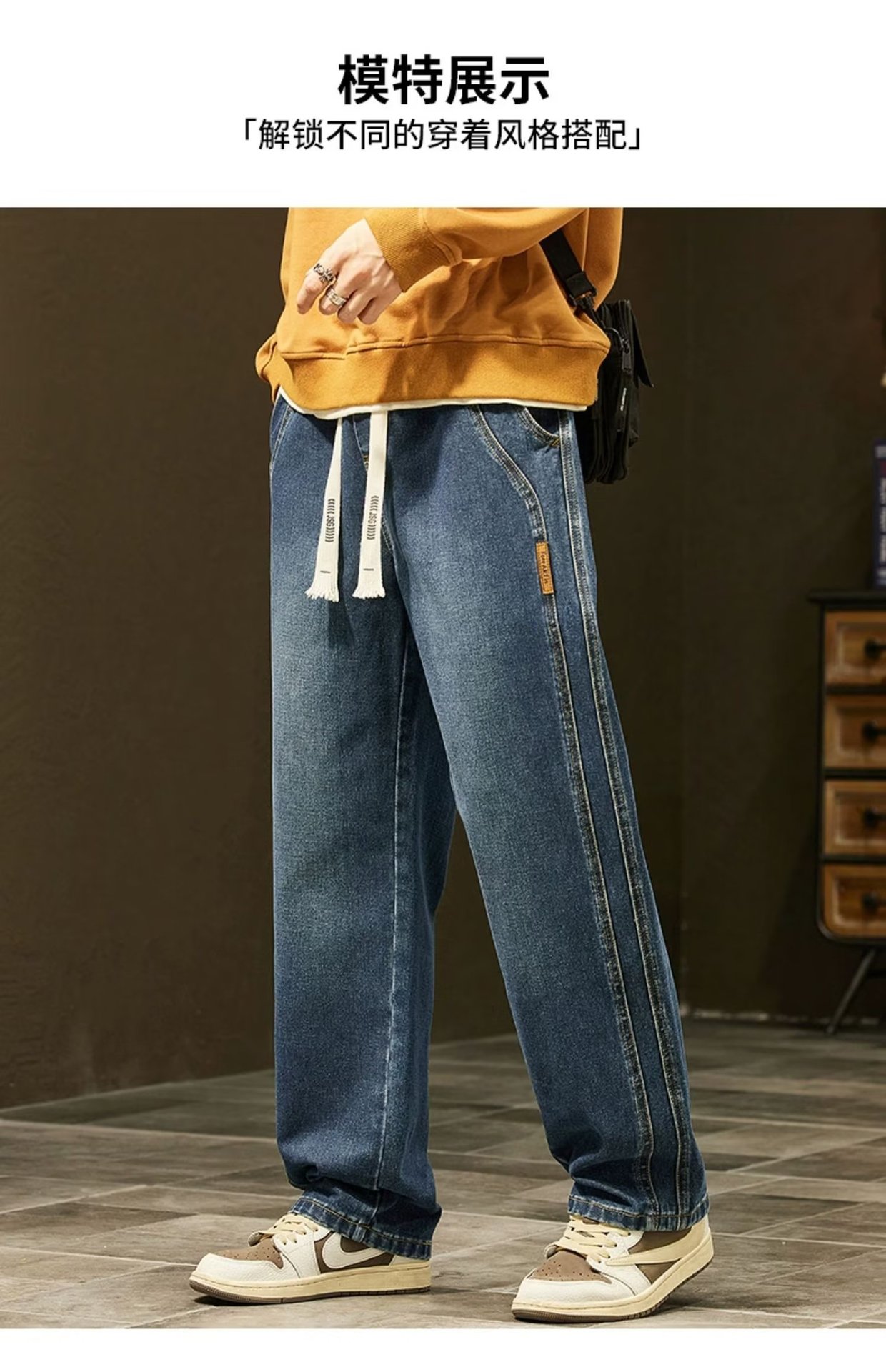 Otoño nuevos pantalones vaqueros elásticos de moda para hombres Pantalones rectos sueltos de cinta lateral juvenil pantalones de pierna ancha lavados versátiles