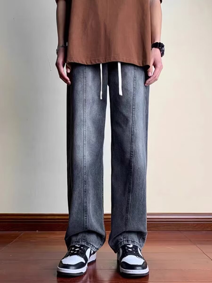 Pantalones vaqueros de cintura elástica gris ahumado retro de estilo europeo y americano para hombres y mujeres pantalones de drapeado de pierna ancha rectos sueltos