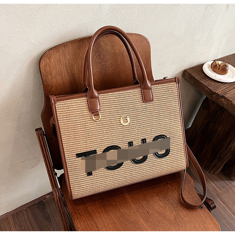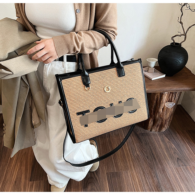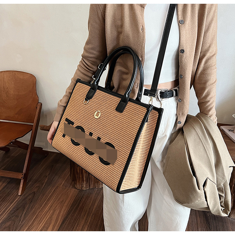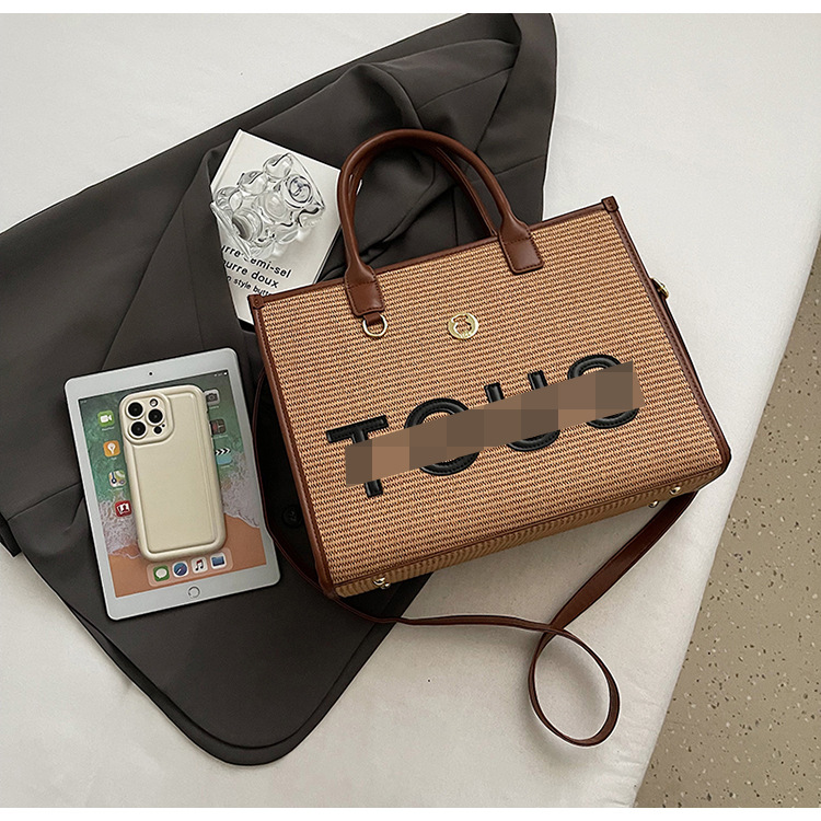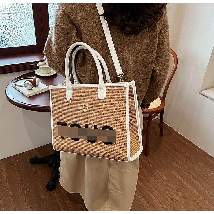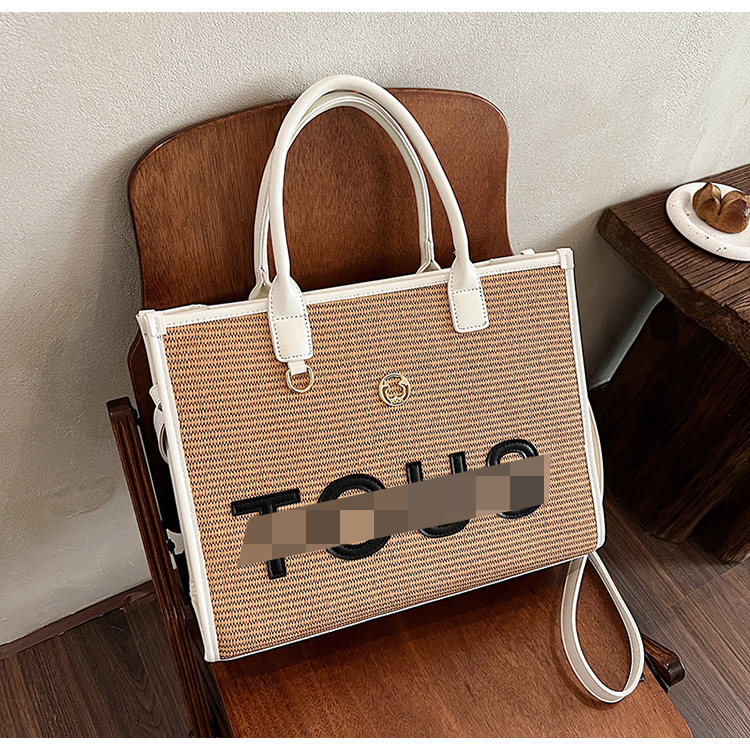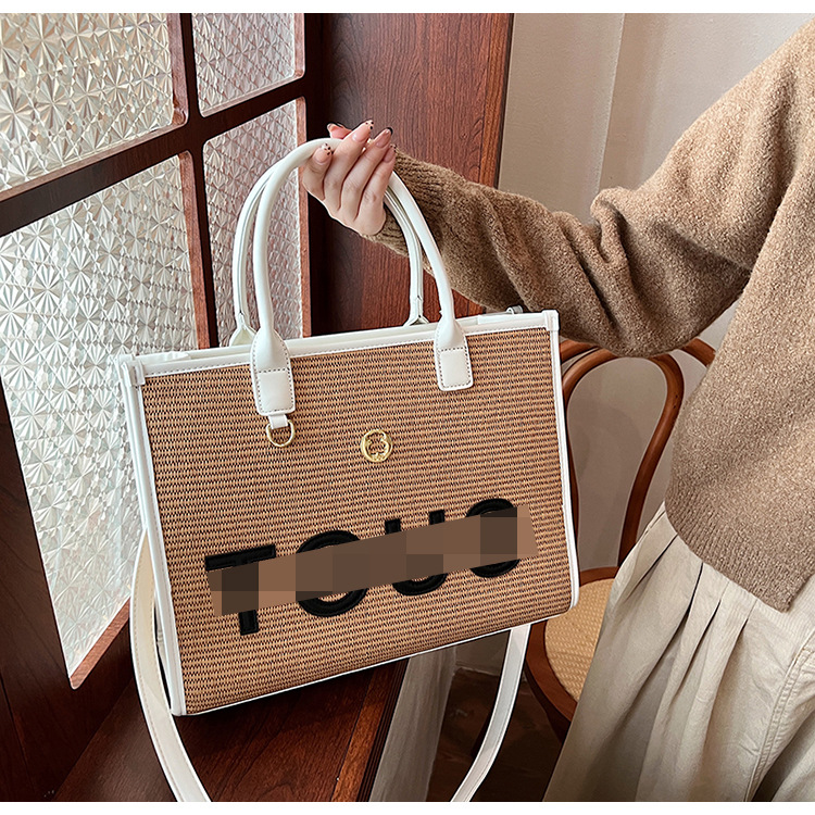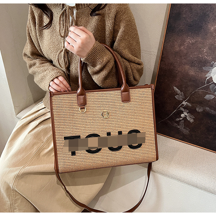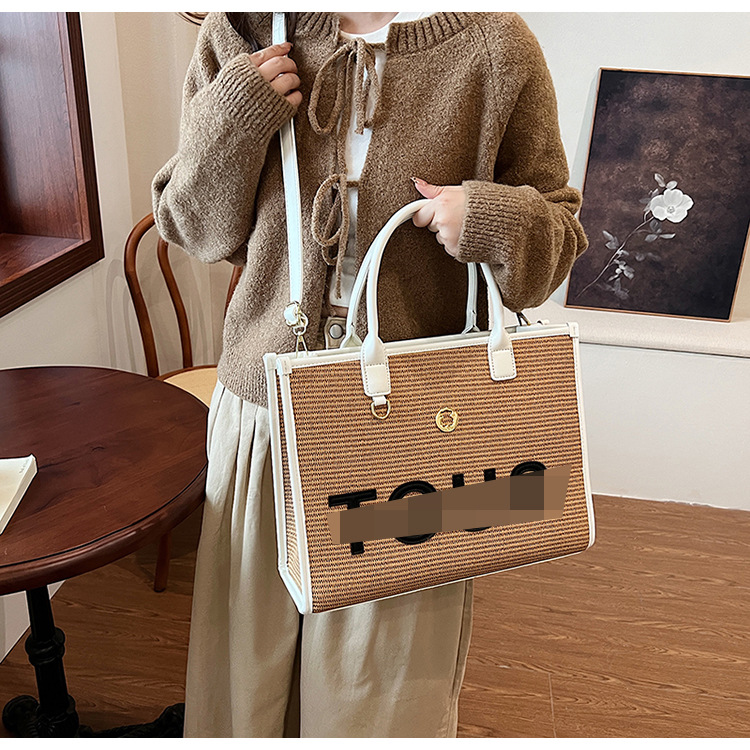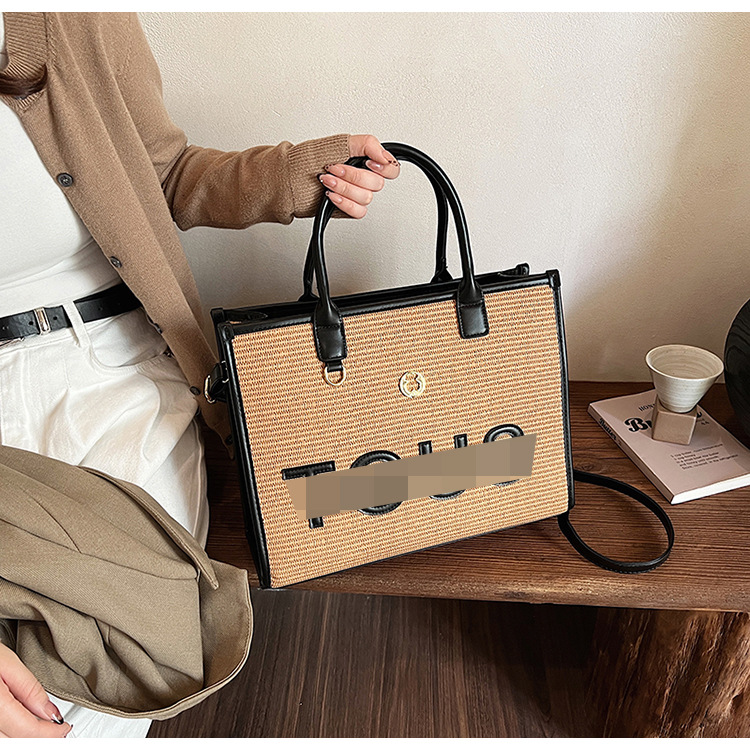 Bolsa de paja para mujer 2024 nuevo bolso tejido portátil de diseño de estilo occidental de gran capacidad, bolso cuadrado pequeño con letras de color en contraste personalizado