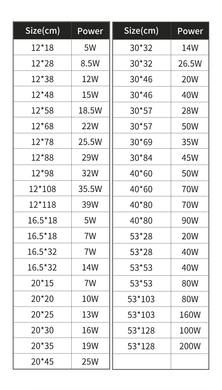 | Ancho | 12*18cm(5W),12*28cm(8.5W),12*38cm(12W),12*48cm(15W),12*58cm(18.5W),12*68cm(22W),12*78cm(25.5W),12*88cm(29W),12*98cm(32W),12*108cm(35.5W),12*118cm(39W),16.5*18cm(5W),16.5*18cm(7W),16.5*32cm(7W),16.5*32cm(14W),20*15cm(7W),20*20cm(10W),20*25cm(13W),20*30cm(16W),20*35cm(19W),20*45cm(25W),20*120(72W),30*32cm(14W),30*32cm(28W),30*46cm(20W),30*46cm(40W),30*57cm(28W),30*57cm(53W),30*69cm(35W),30*84cm(45W),40*60cm(53W),40*60cm(70W),40*80cm(72W),40*80cm(96W),53*28cm(27.5W),53*28cm(43W),53*53cm(55W),53*53cm(87W),53*103cm(110W),53*103cm(175W),53*103cm(200W),53*128cm(137.5W ),53*128cm(220W ) |