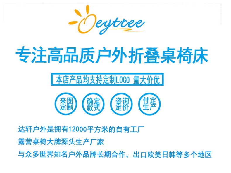 源头厂家,近15年高端户外折叠产品国际市场的出口经验,会一如既往的提供高品质产品和高效的专业服务,我们在武义工厂欢迎您随时来参观考察!