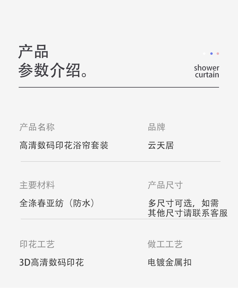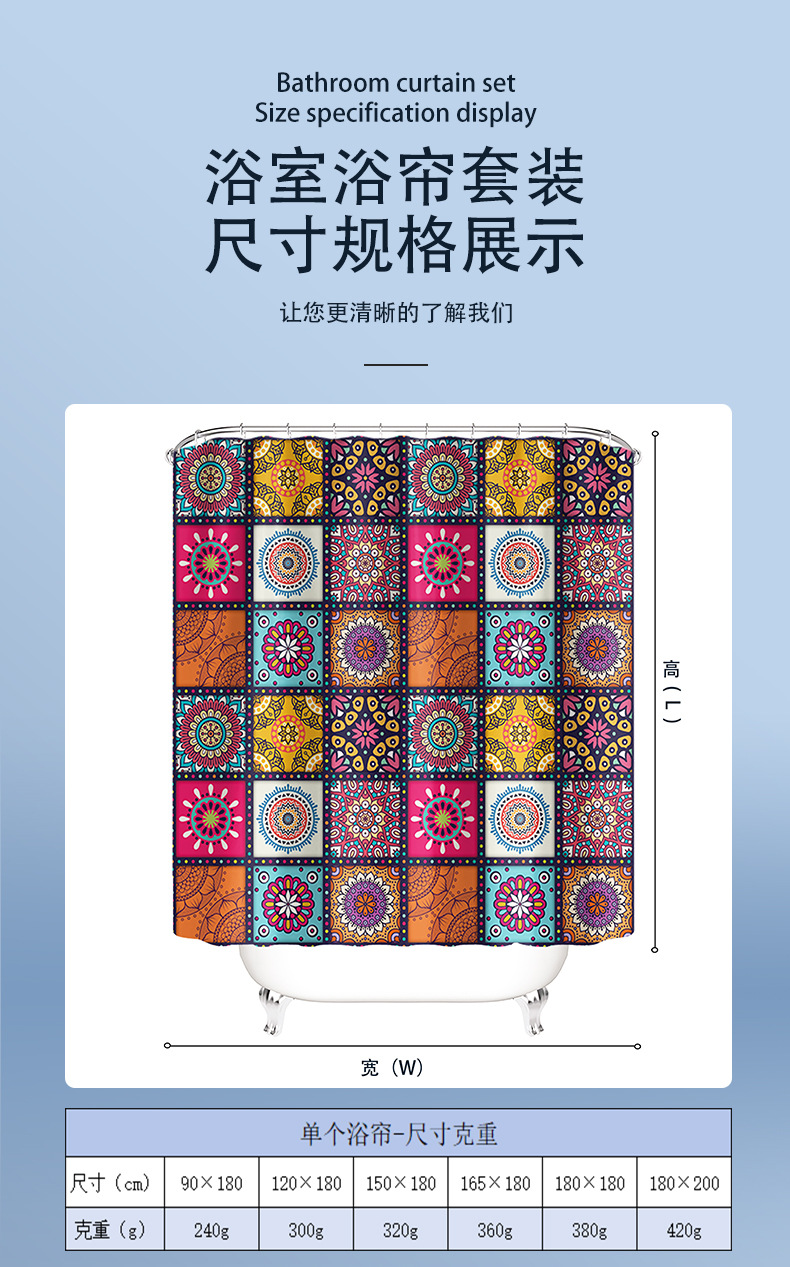 | Especificaciones | Ancho 90cm * Alto 180cm-Cortina de baño individual 240g,Ancho 120cm * Alto 180cm-Cortina de baño individual 300g,Ancho 150cm * Alto 180cm-Cortina de baño individual 320g,Ancho 165cm * Alto 180cm-Cortina de baño individual 360g,Ancho 180cm * Alto 180cm-Cortina de baño individual 380g,Ancho 180cm * Alto 200cm-Cortina de baño individual 420g,Juego de tres piezas (tapete en forma de U con tapa de inodoro),Juego de cuatro piezas (juego de tres piezas de cortina de ducha 180*180) |