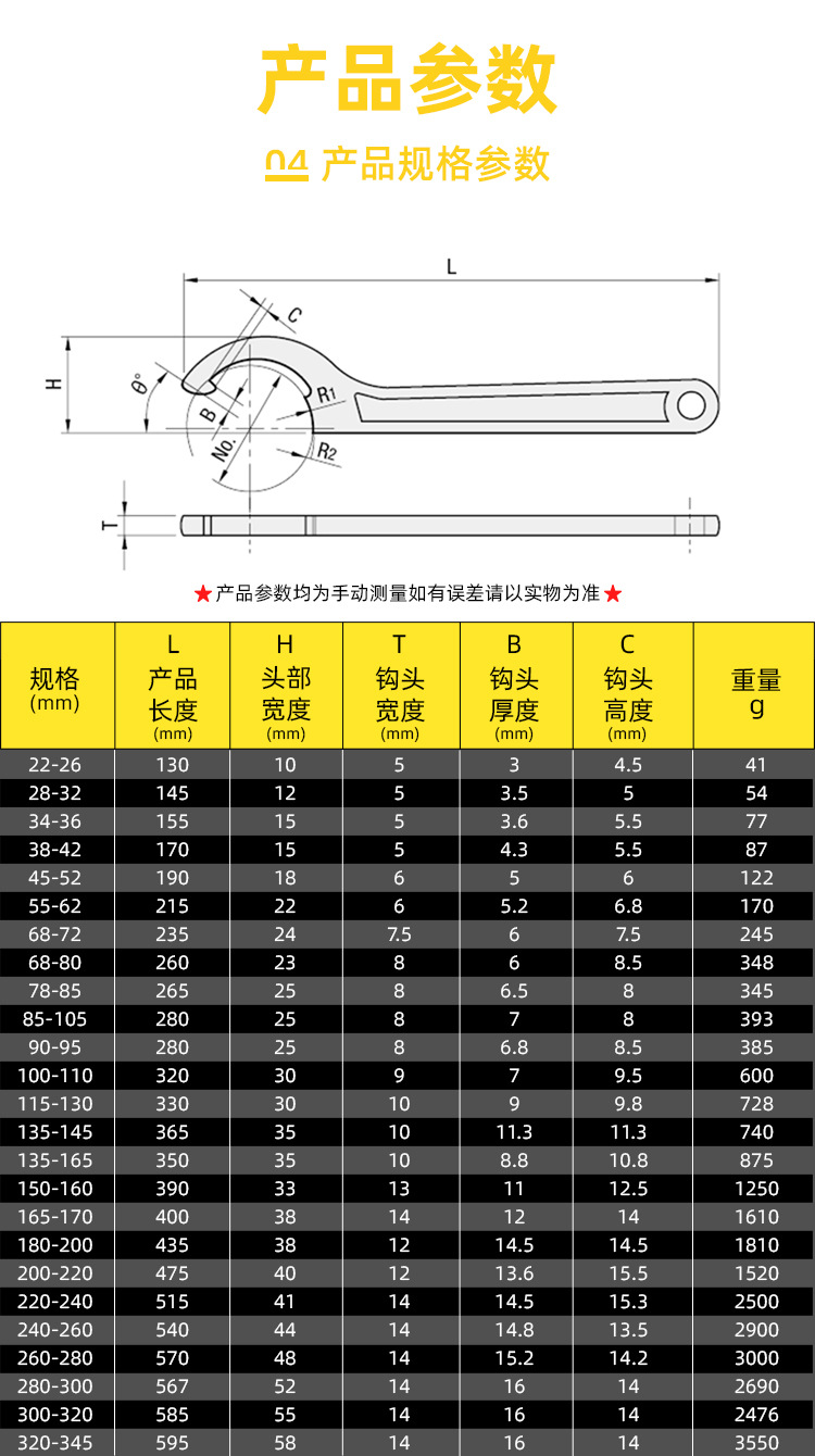 勾型扳手亦称月牙扳手、圆螺母扳手,产品采用优质工具钢经整体锻造、精加工、热处理及表面处理等工艺精制而成,紧固或拆卸机械设备上的圆螺母用。规格有22-26、28-32、34-36、45-52、55-62、68-72、78-85、90-95、100-110、115-130、135-145、150-160、165-170、68-80、85-105、110-130、135-165、180-195、170-210、205-220、220-250、230-240、250-260、260-280、300-320、活络月牙扳手等,质量优良。