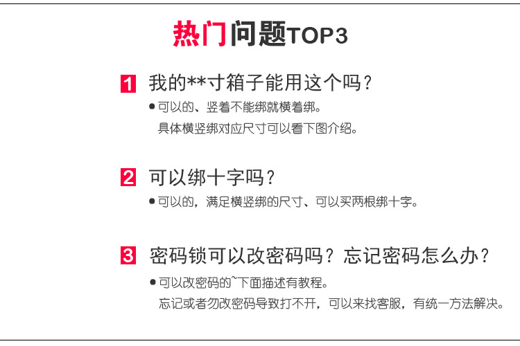 | 1. 加固行李,防止箱内物品散落 2. 自带称重功能,可避免超重 | |||