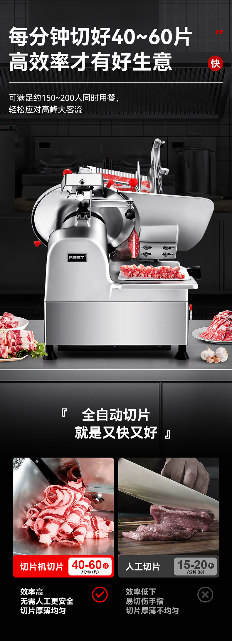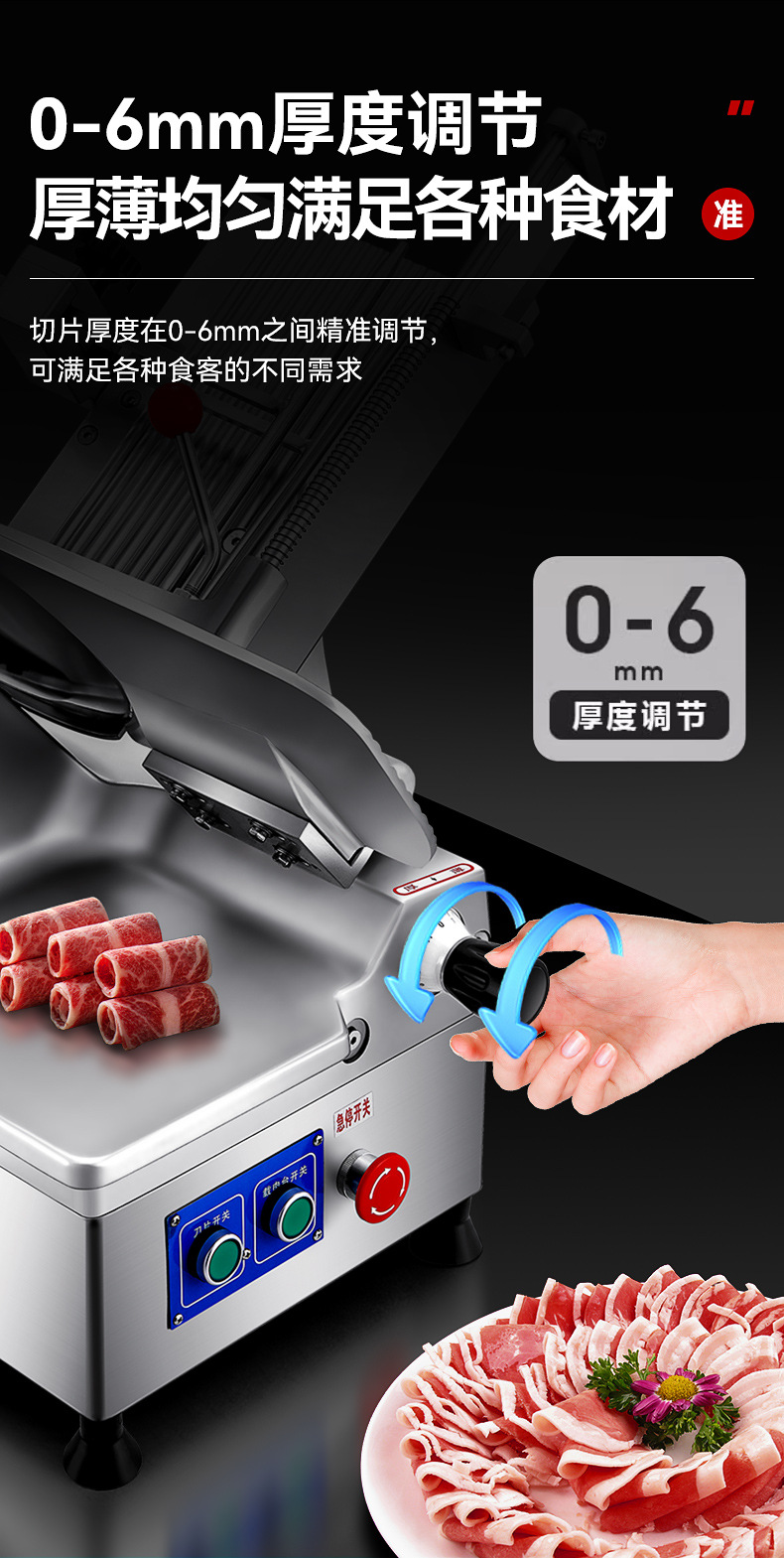 | Uso del producto | Cortar rollos de cordero, rollos de ternera, carne congelada, jamón, salchichas, verduras duras y frutas como patatas, pepinos, rábanos, manzanas, etc |