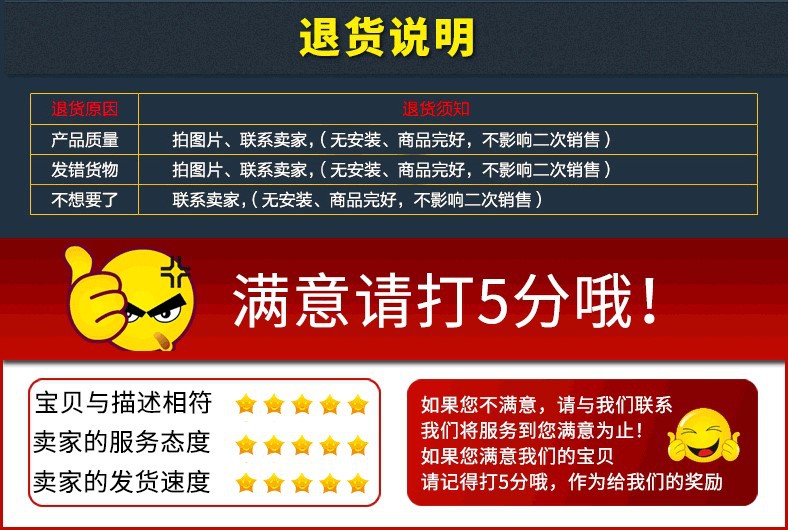 9、为了确保买卖双方的利益,如果您满意,请你安装,如果不满意请你保持货物原样,把货退回我公司,来回邮费由买家负责;退货请保证产品上无杂物,胶纸、不得拆开层包装等影响店家第二次销售的情况。否则店主收货后视产品损害程度有权收取成本费。