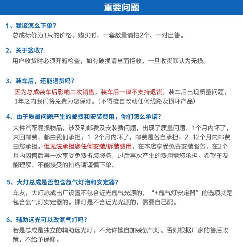 3、各位亲们,虽然网上有很多安装的教程,可是对于次购买安装的新手来说,还是一个挑战,为了不必要的纠纷,各位亲请确认会安装后再购买,或者与改装店谈好安装价格后,再来购买(价格比直接在改装店购买要实惠很多),如因不会安装而导致的退换货,运费还请自理哦;