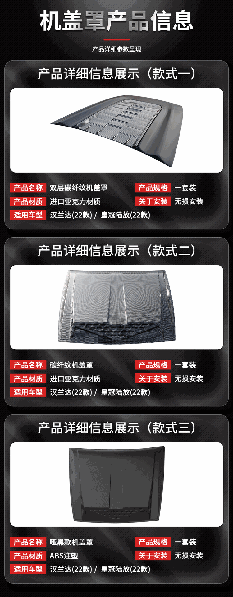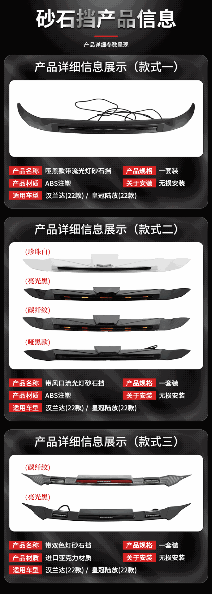 | Especificaciones | [Highlander/Crown Lu Fang] 22-negro mate Cubierta de la máquina (traje),[Highlander/Crown Lu Fang] 22-fibra de carbono cubierta de la máquina de grano (un traje),[Highlander/corona] 22-doble capa de fibra de carbono cubierta de la máquina (un traje),[Highlander/Crown Lu Fang] 22-negro mate con salida de aire streamer bloque de arenisca (traje),[Highlander/Crown Lu Fang] 22-Pearl White Belt salida de aire streamer bloque de piedra arenisca (traje),[Highlander/Crown Lu Fang] 22-negro brillante con salida de aire streamer bloque de arenisca (traje),[Highlander/Crown Lu Fang] 22-fibra de carbono cinta de salida de aire streamer bloque de piedra arenisca (traje),[Highlander/Crown Lu Fang] 22-negro mate con bloque de arenisca streamer (traje),[Highlander/Crown Lu Fang] 22-negro brillante con bloque de arenisca de dos colores (traje),[Highlander/Crown Lu Fang] 22-Cinta de fibra de carbono de dos colores streamer bloque de arenisca (traje),[Highlander/Crown] 22-Pearl cejas de rueda de lujo (juego de 6 piezas),[Highlander/Crown Lu Fang] 22-titanio negro ceja rueda de lujo (un conjunto de 6 piezas),[Highlander/Crown Lu Fang] 22-patrón de fibra de carbono ceja de rueda de lujo (un conjunto de 6 piezas),[Highlander/Corona Lu Fang] 22-luz de techo negro mate (traje),[Highlander/Crown Lu Fang] 22-patrón de fibra de carbono Luz de techo (traje) |