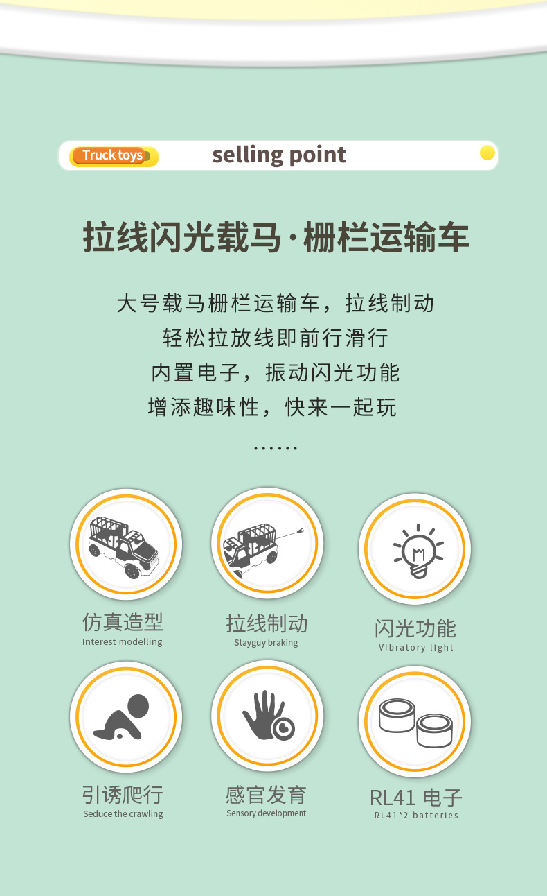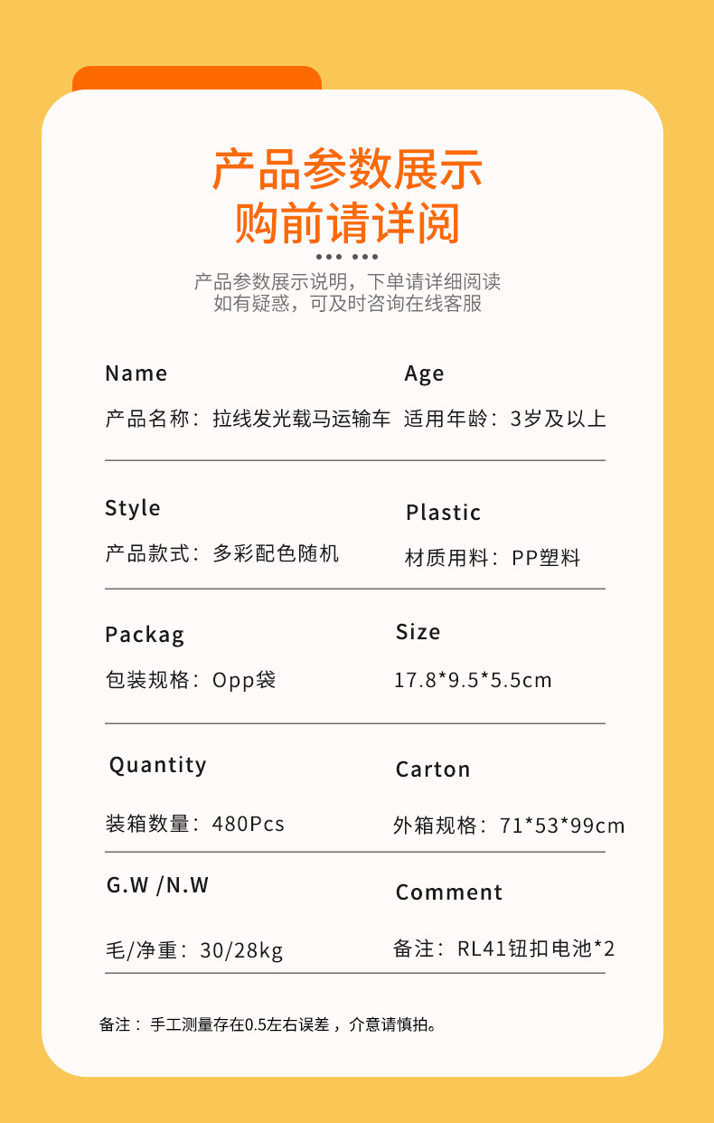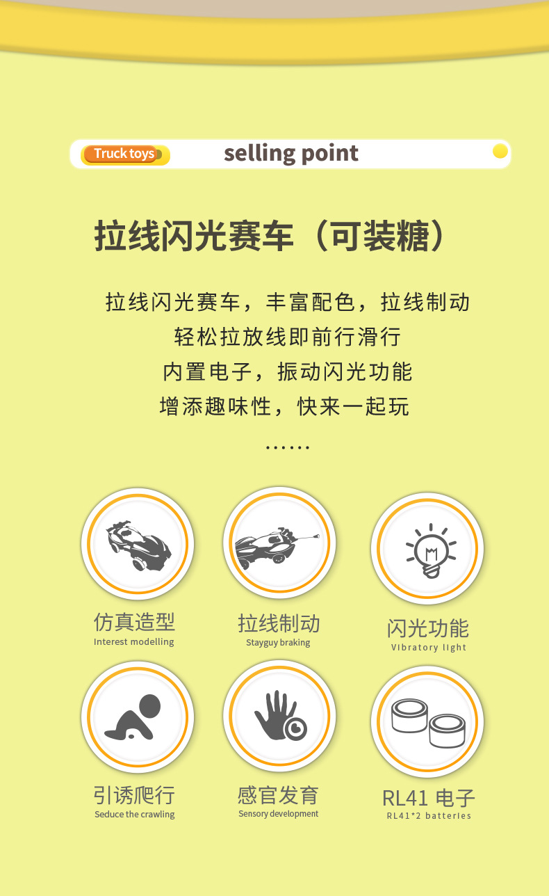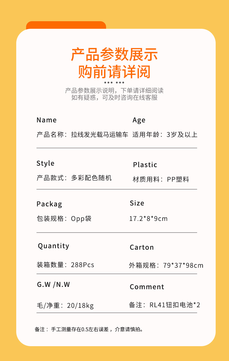 | Colores | Locomotora luminosa con cable de tracción (160 unidades/caja),Camión de valla luminosa con cable de tracción (288 unidades/caja),Coche de carreras luminoso con cable de tracción (480 unidades/caja) |