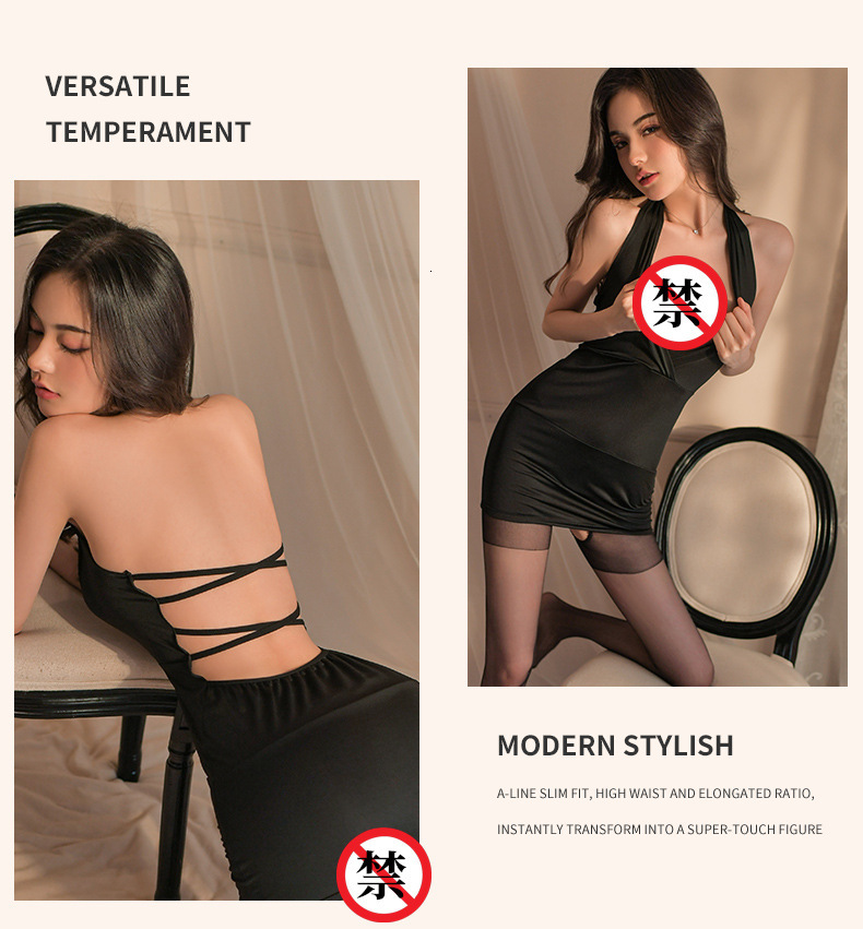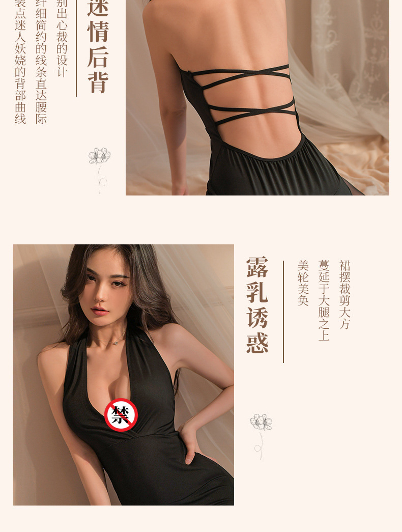 情趣内衣性感挂脖睡裙露乳诱惑修身露背深V透视制服骚套装女代发